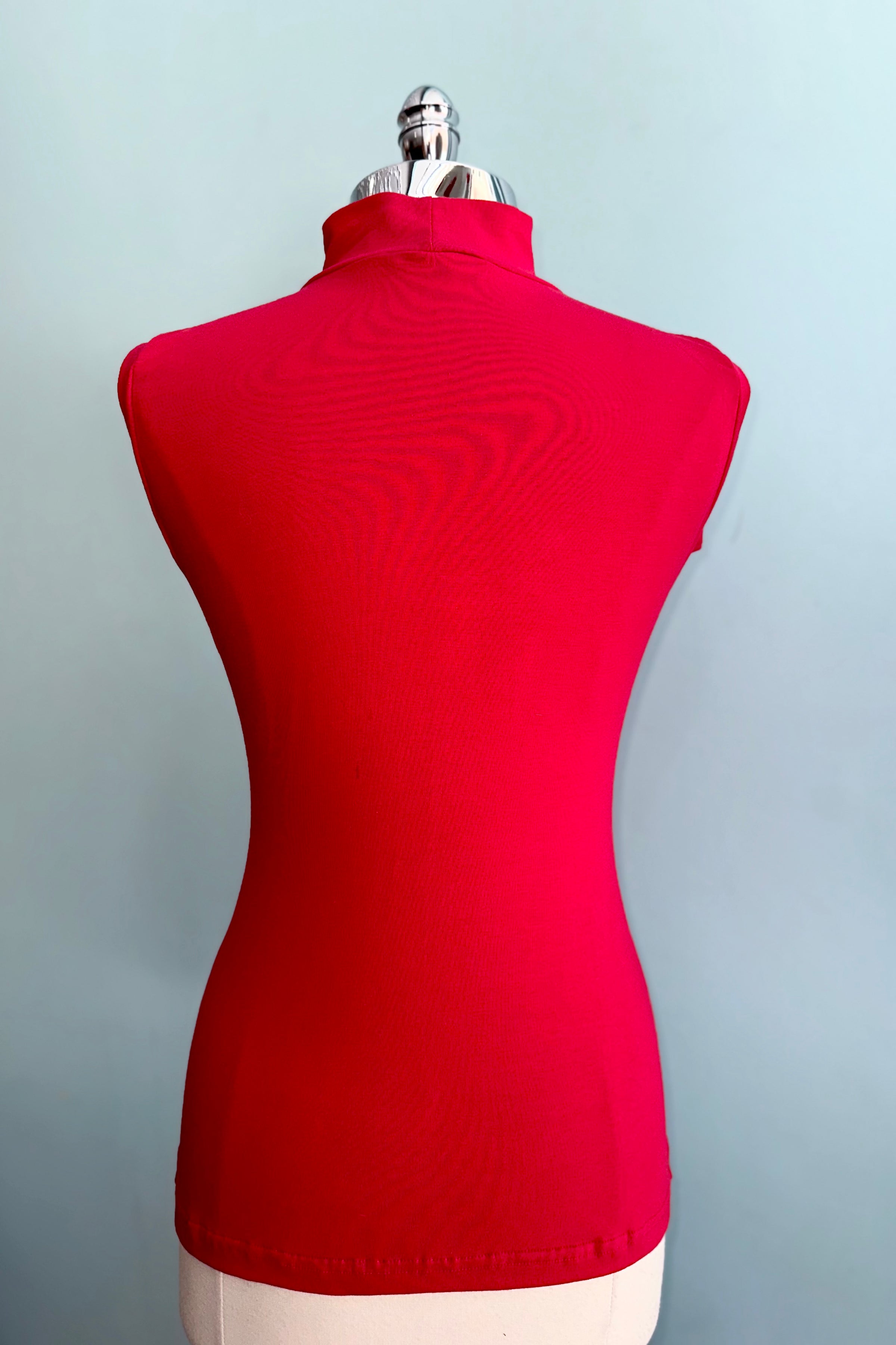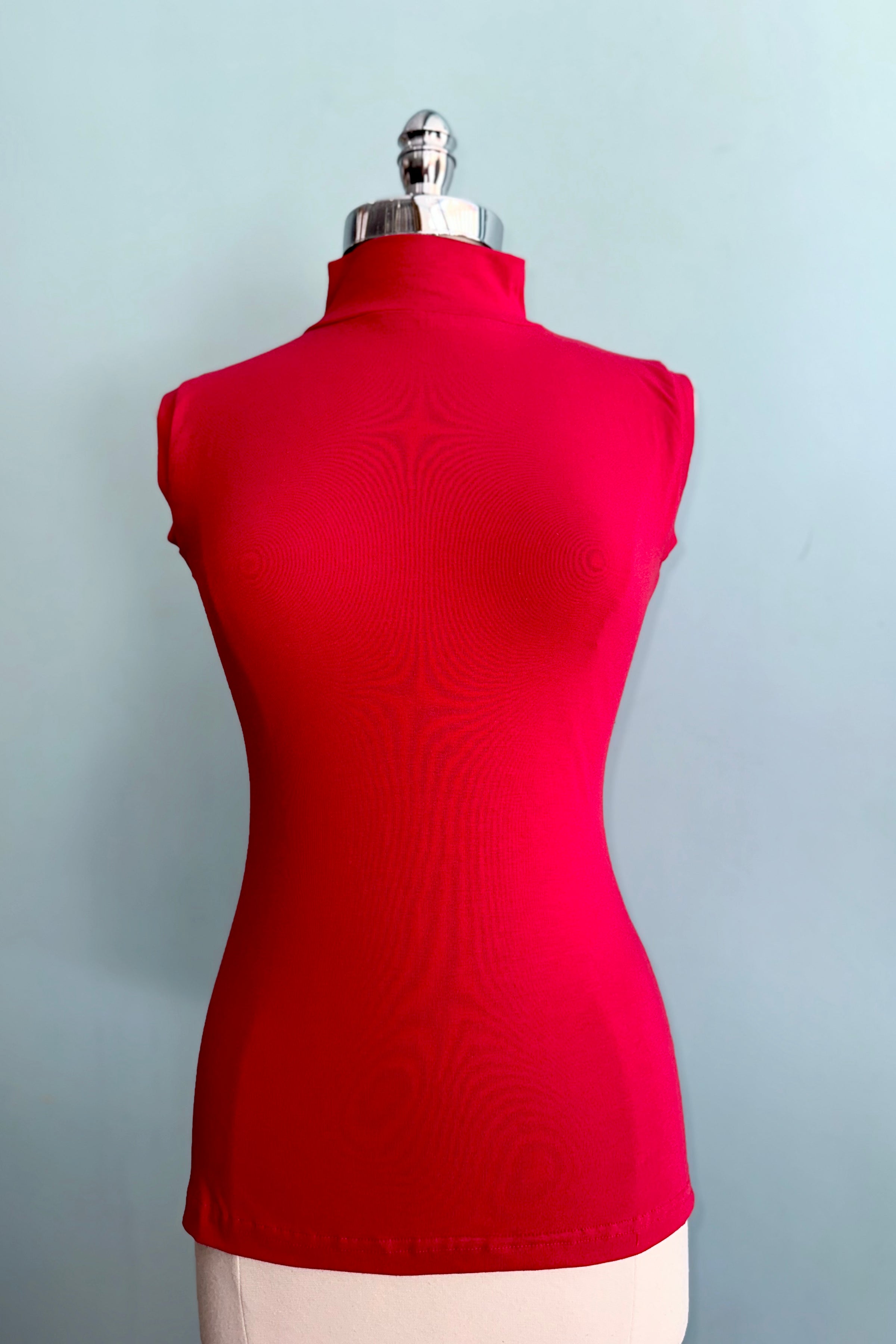 Jersey sleeveless top in red with a mock turtleneck and fitted shape. This top is great as a lightweight layer underneath a dress as well as a separate with a skirt.