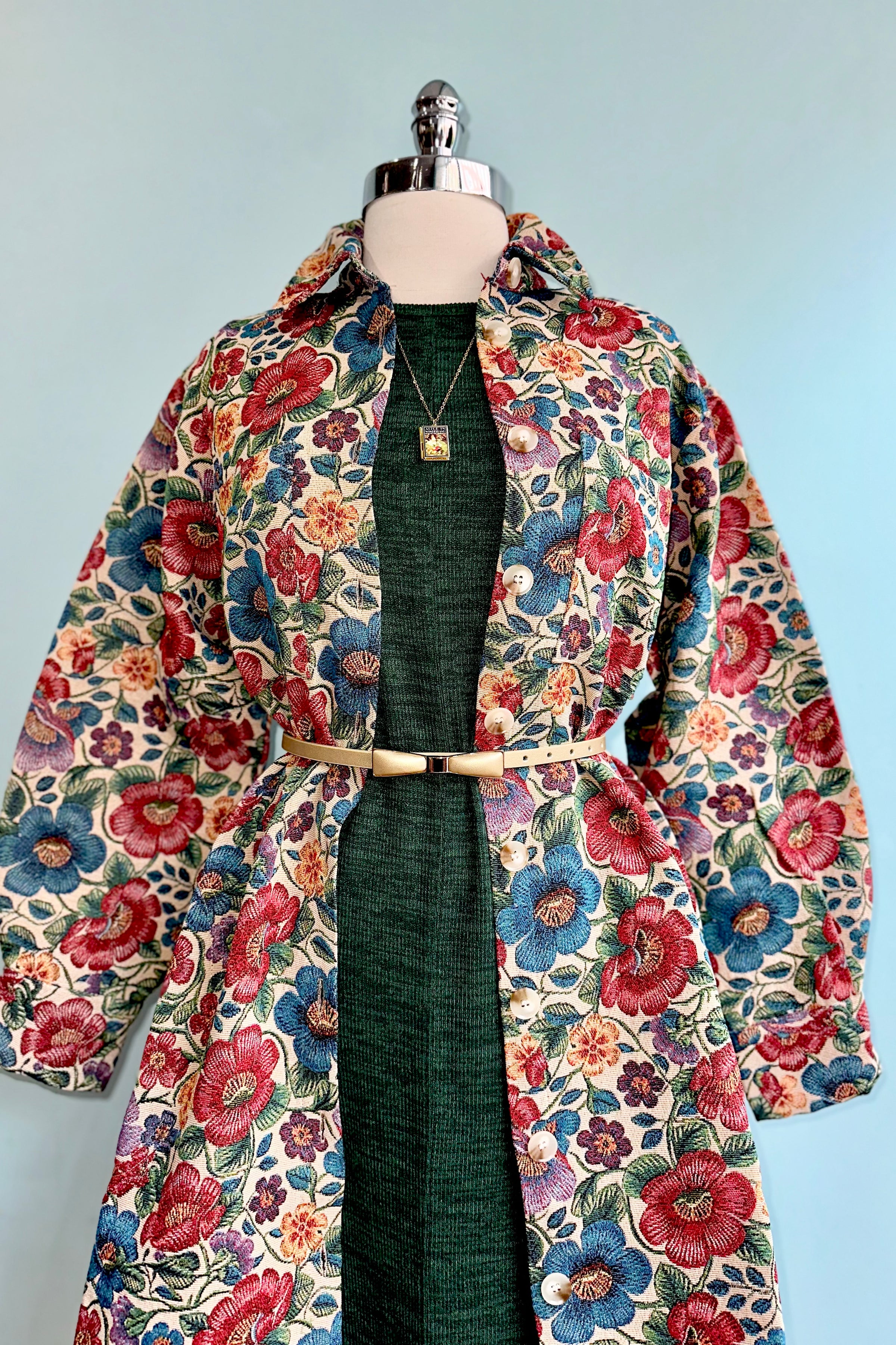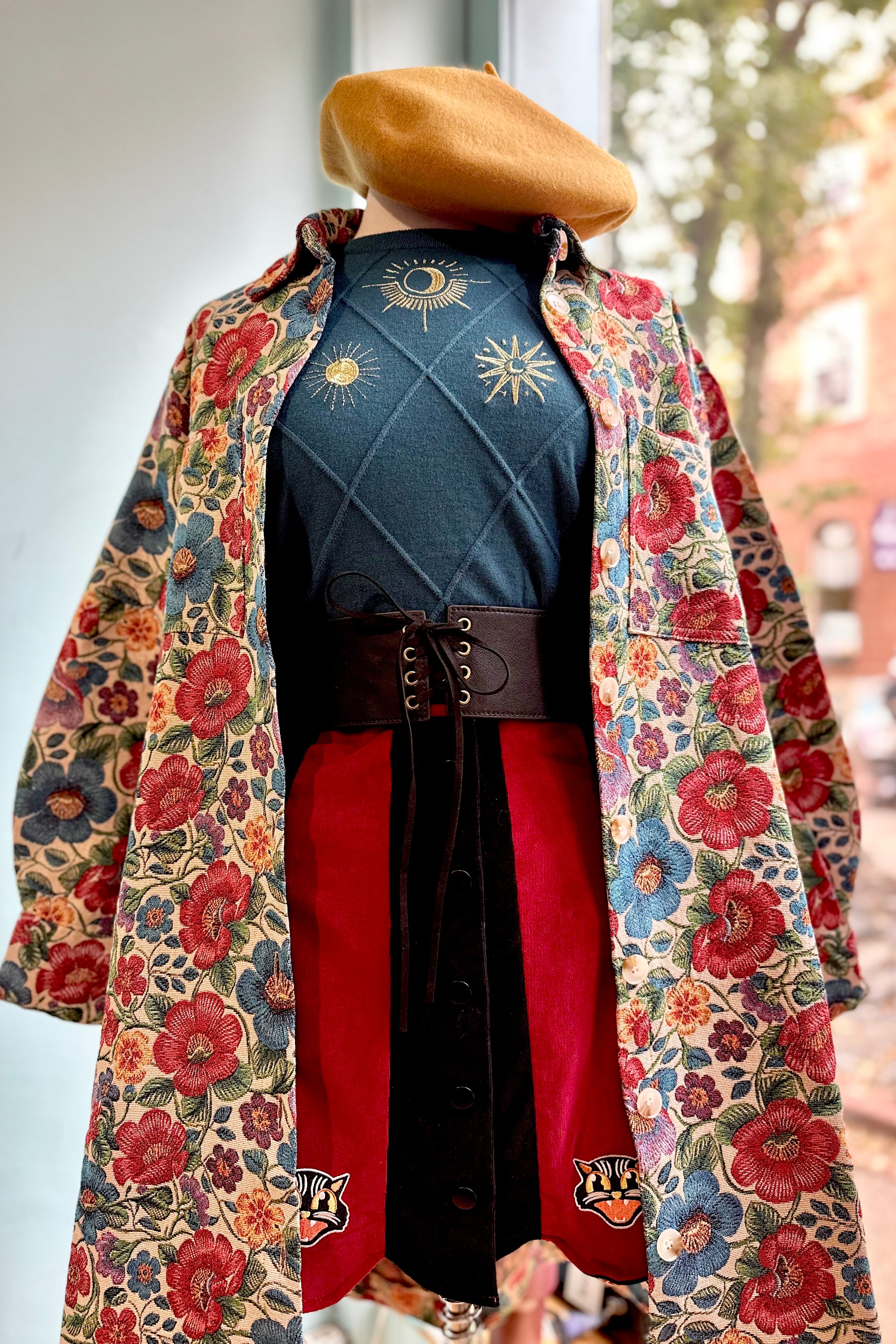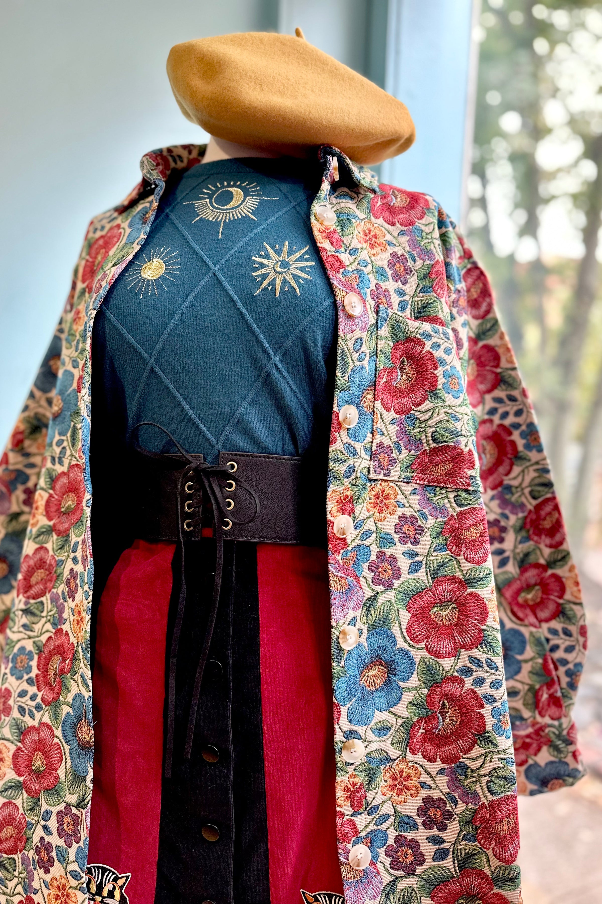 Tapestry floral jacket with a button front and fold over collar. This jacket is 3/4 length and has side slits. It has side pockets as well as two front facing pockets on the chest. The fit is very oversized.