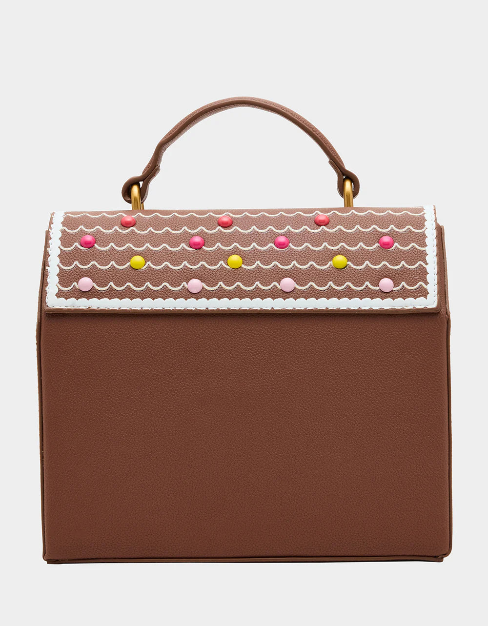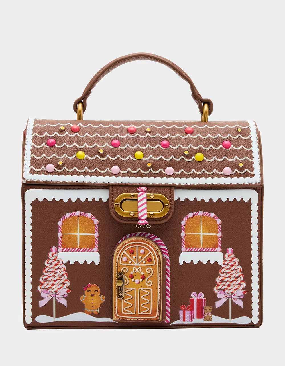 Celebrate the holidays with the charming BAKING SPIRITS BRIGHT BROWN crossbody bag! Shaped like a gingerbread house, it features a delightful print of gingerbread men, candy cane trees, peppermint candy train, presents, and snow, all topped with playful gumdrop details on the roof. This festive piece adds a whimsical touch to your seasonal look, making every moment feel sweet and merry.