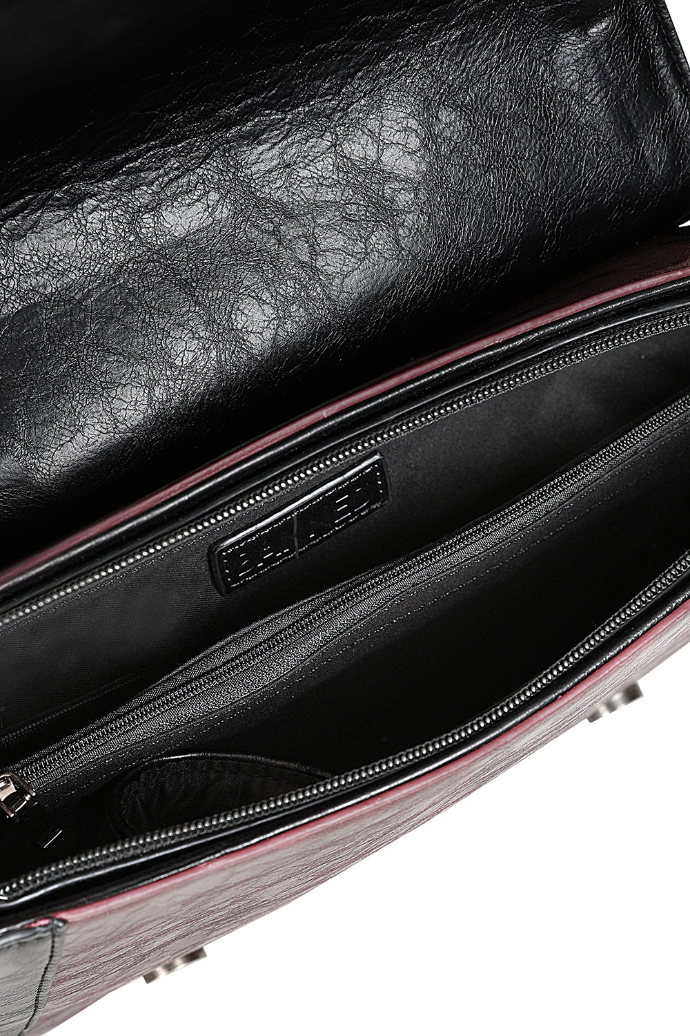 Satchel bag with a short handle and a front flap finished with a bow. The zip opening reveals the inside where there are pen holders and inner pockets, one of which has a zip closure. The bag is made from 100% polyurethane.