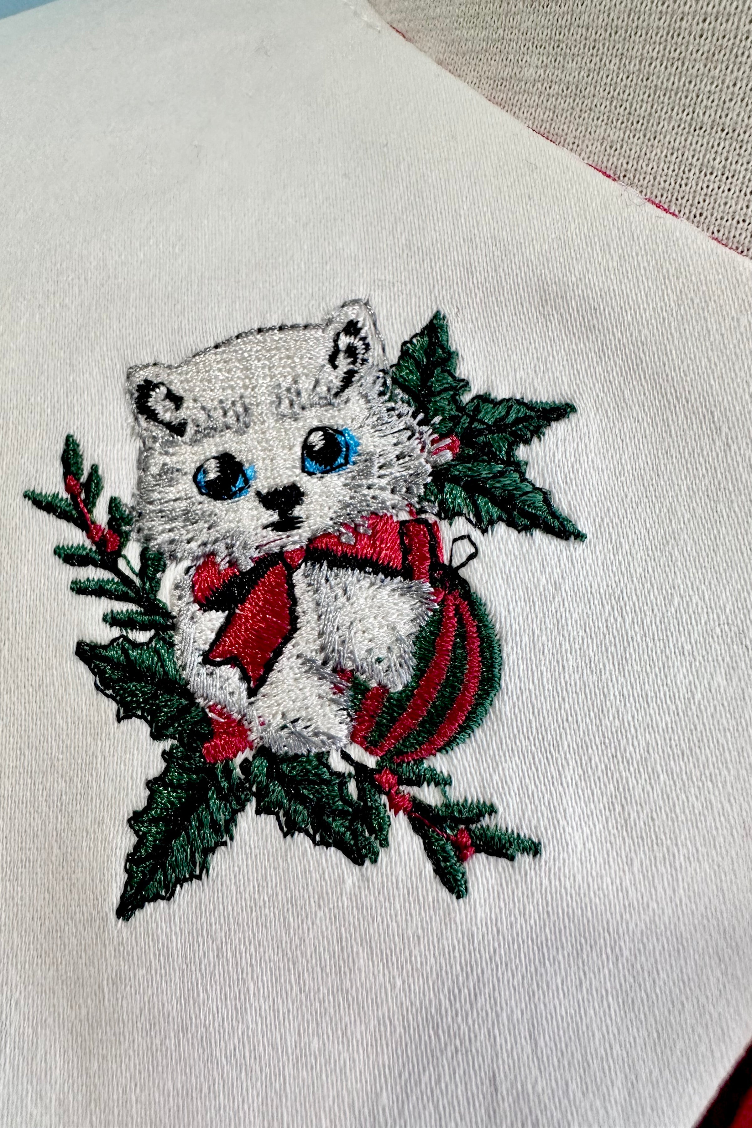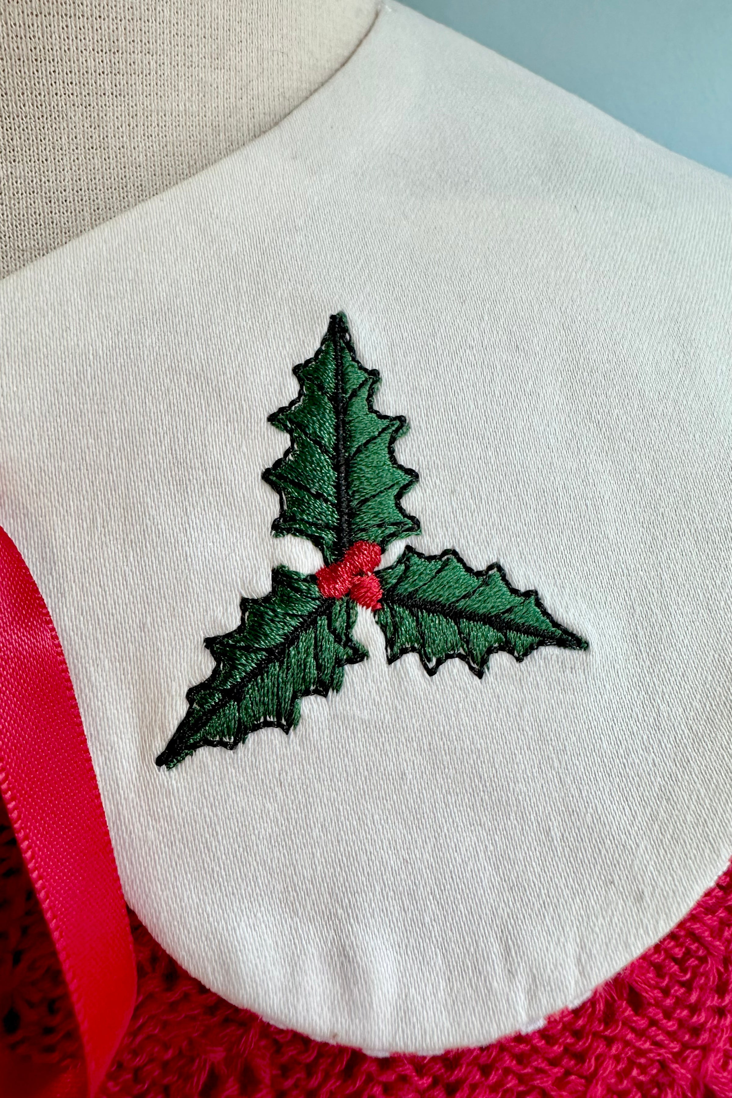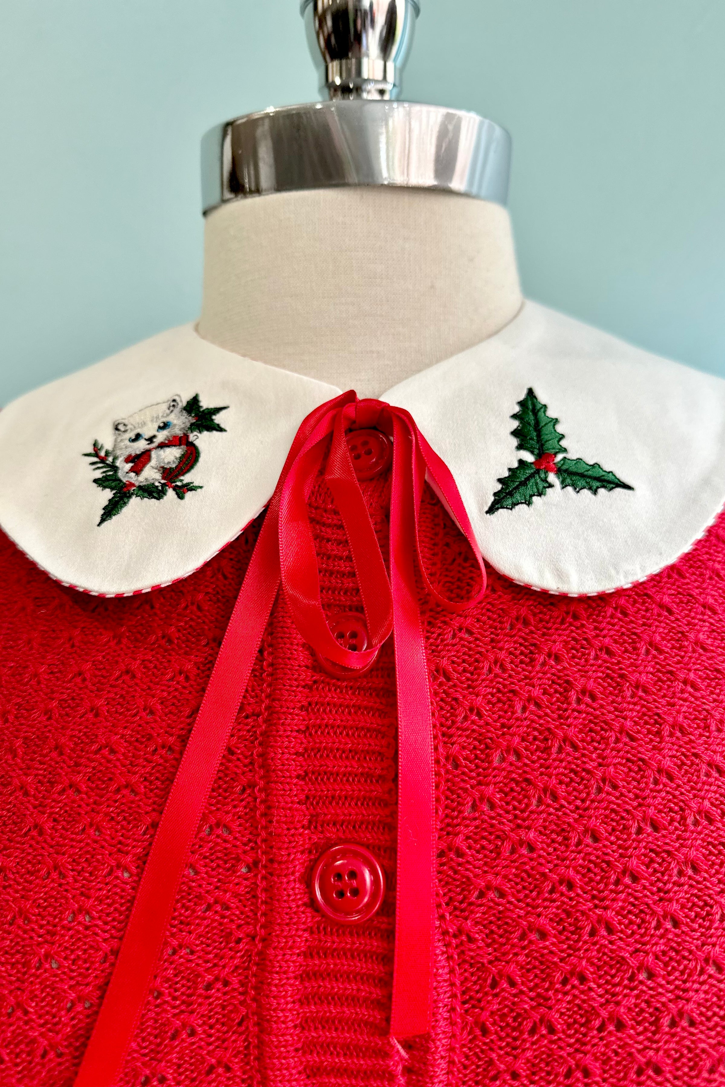 White collar with embroidered holly on one side and a cute kitty on the other. Backed in red and white striped fabric and has a red ribbon tie.