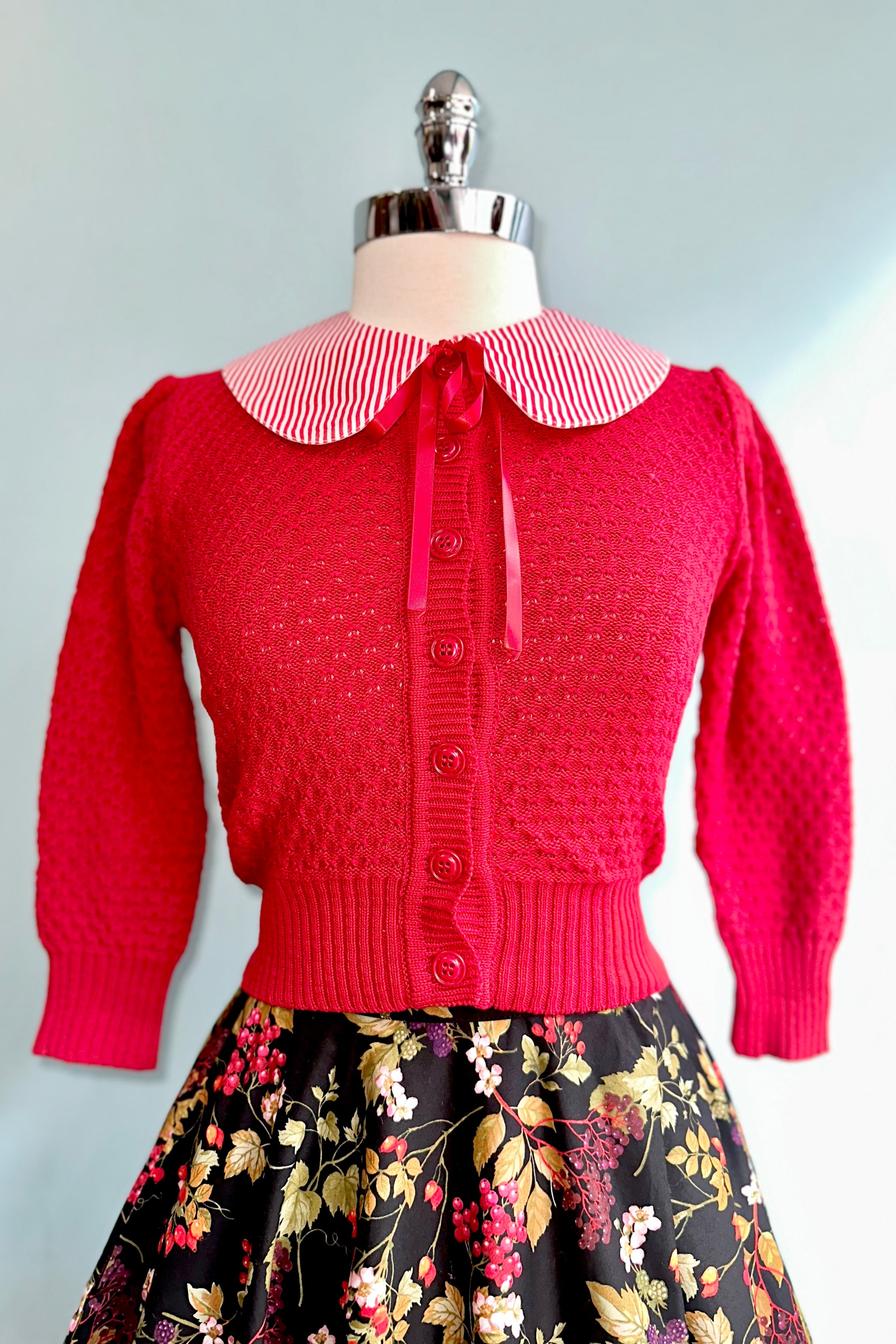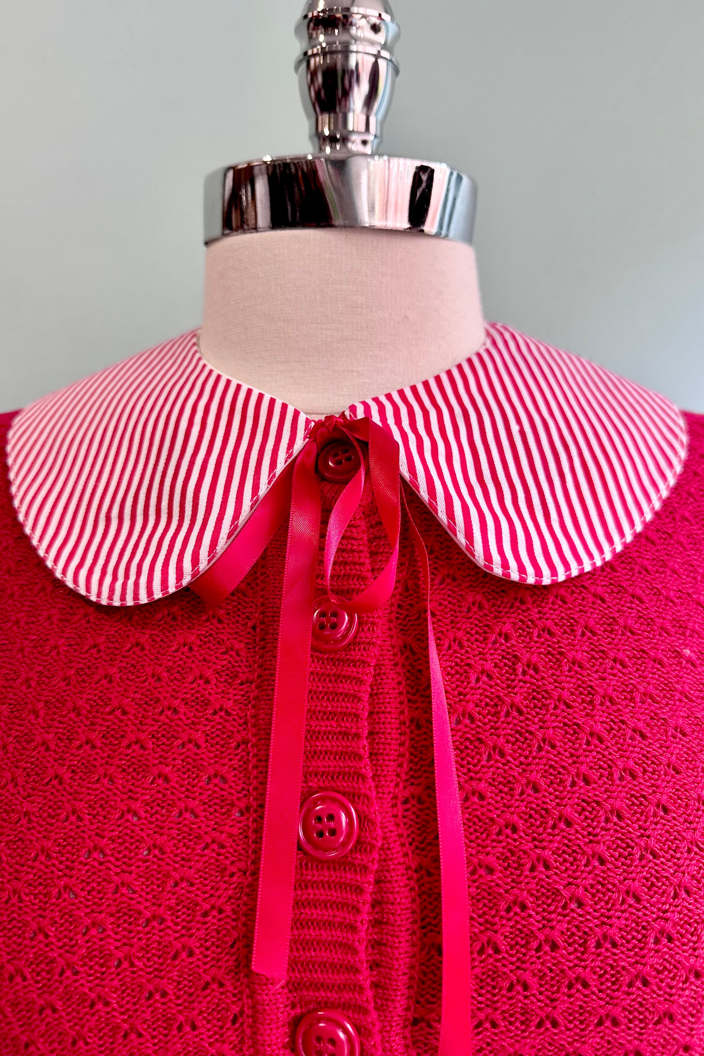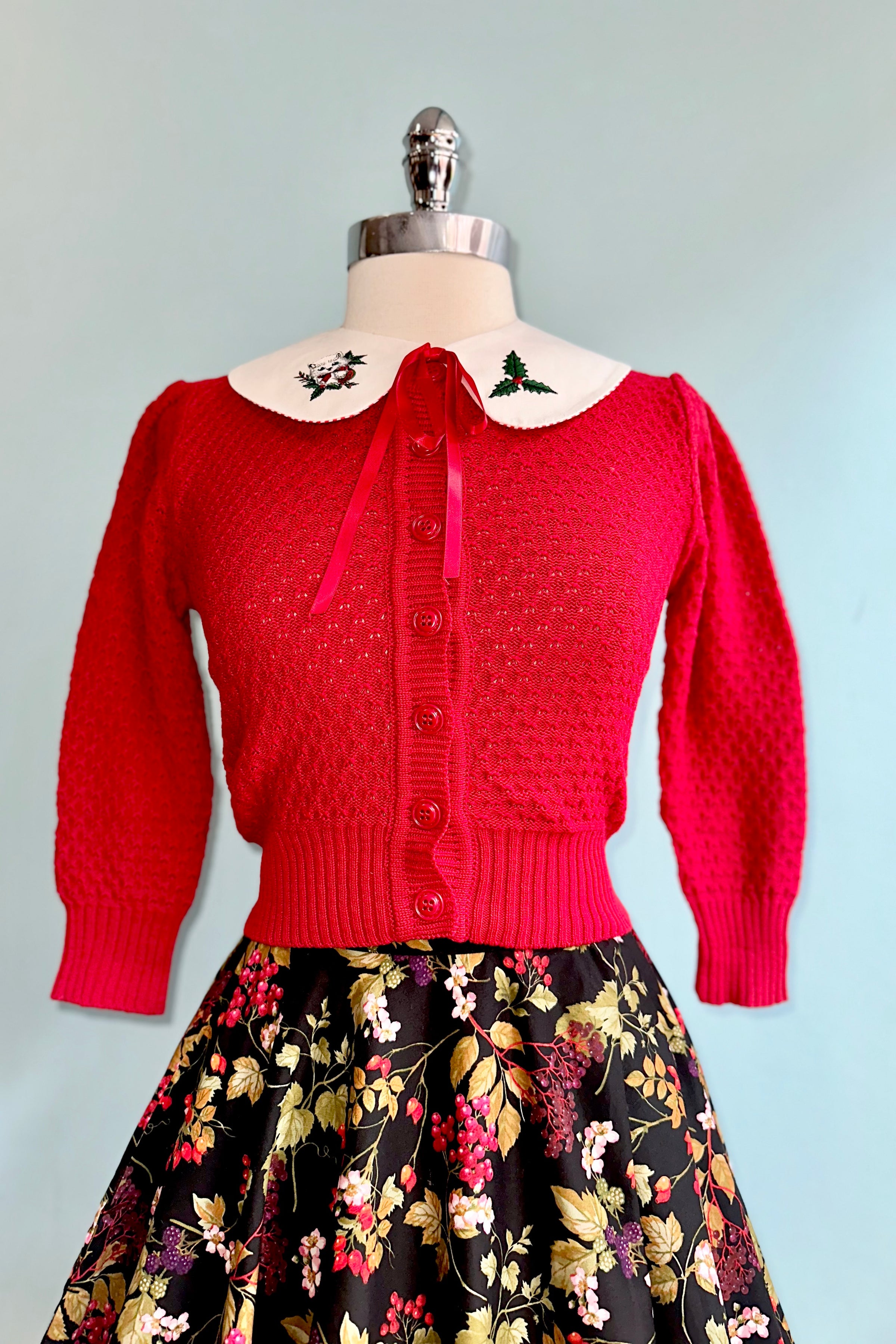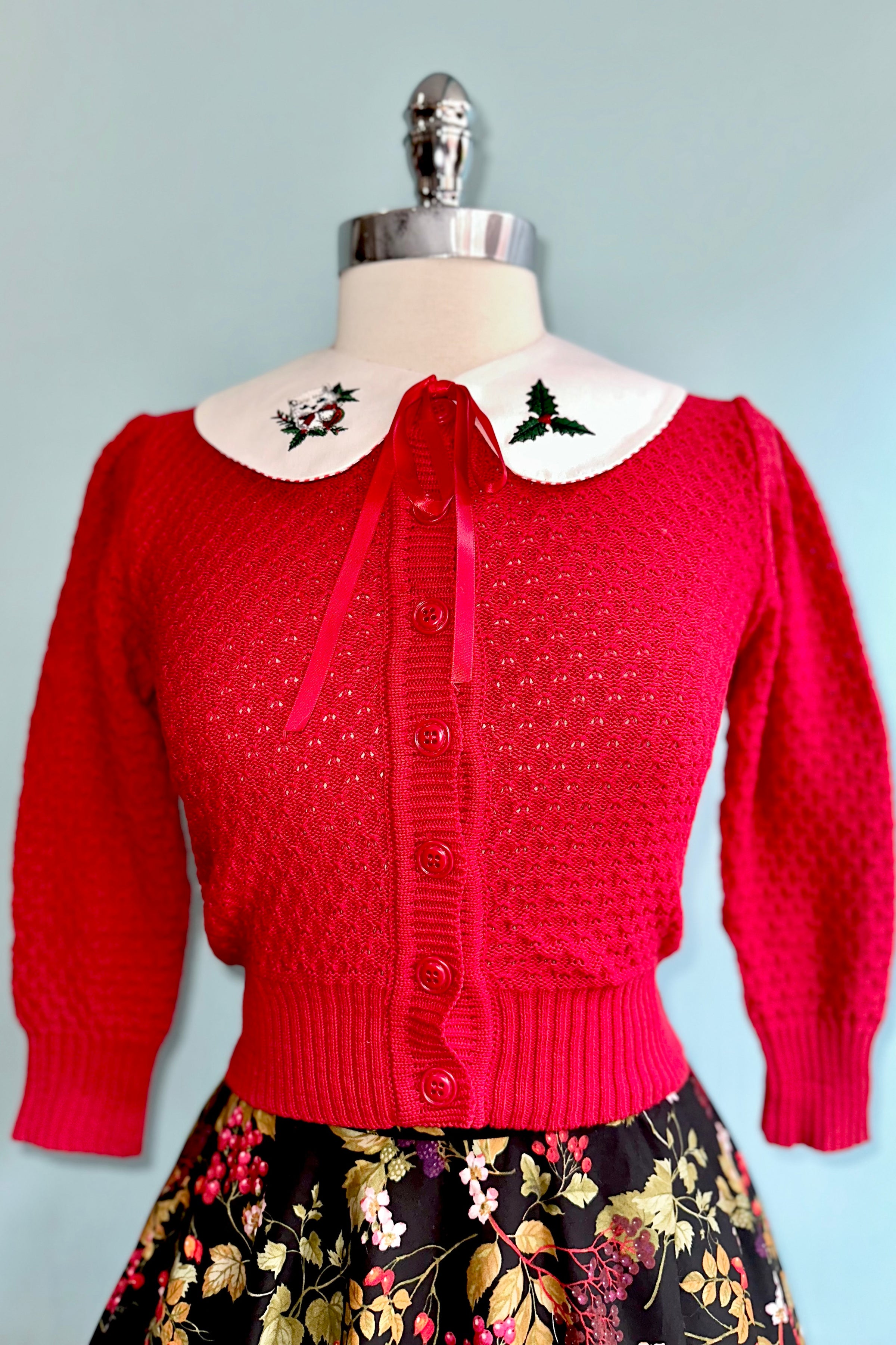 White collar with embroidered holly on one side and a cute kitty on the other. Backed in red and white striped fabric and has a red ribbon tie.