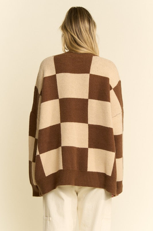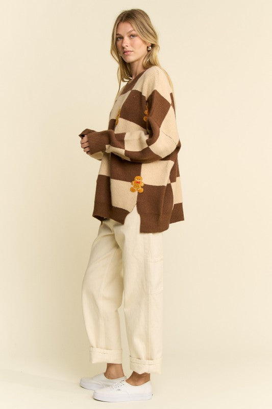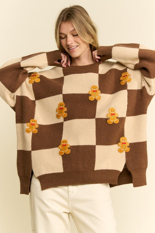 An oversized cream and brown checkerboard sweater with cute gingerbread applique on the front! This sweater is super cozy and comfortable. Due to the oversized fit you can size down depending on how oversized you would like it to be.