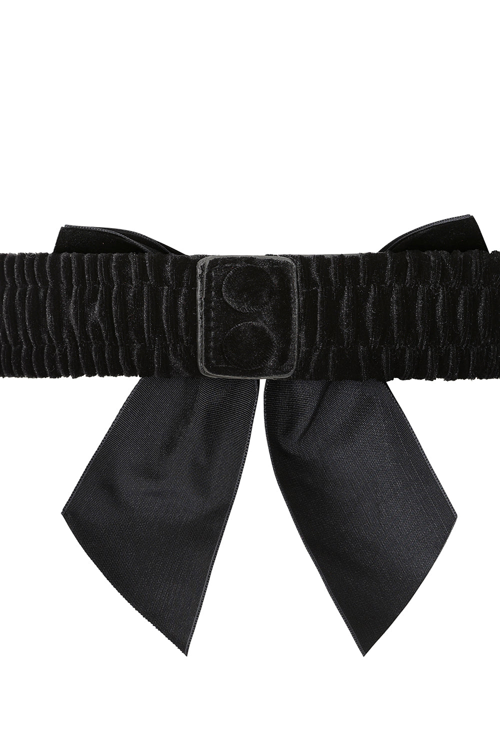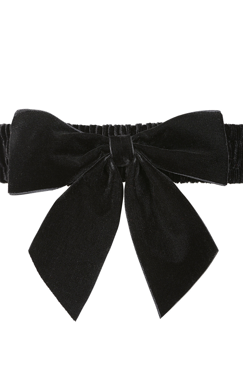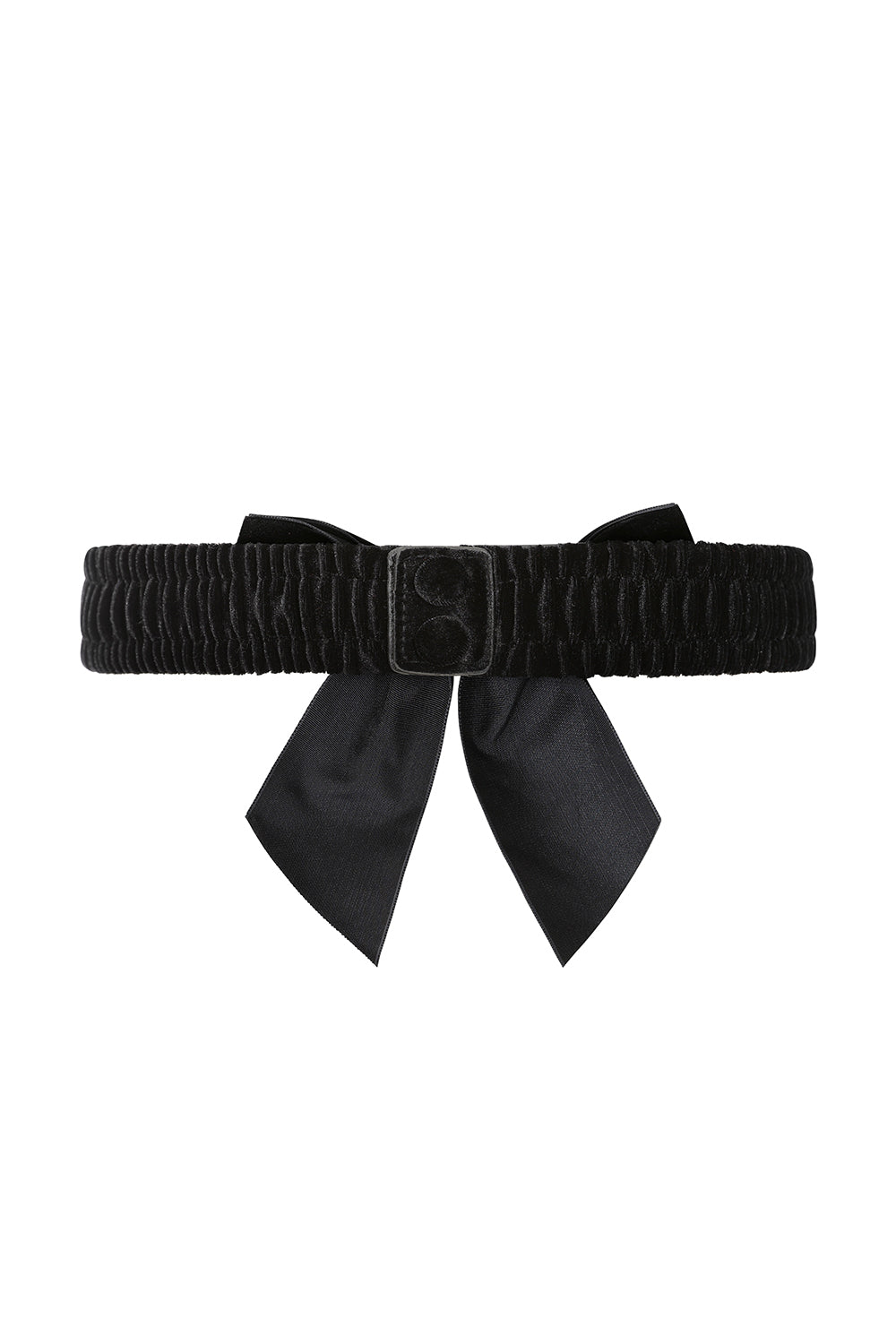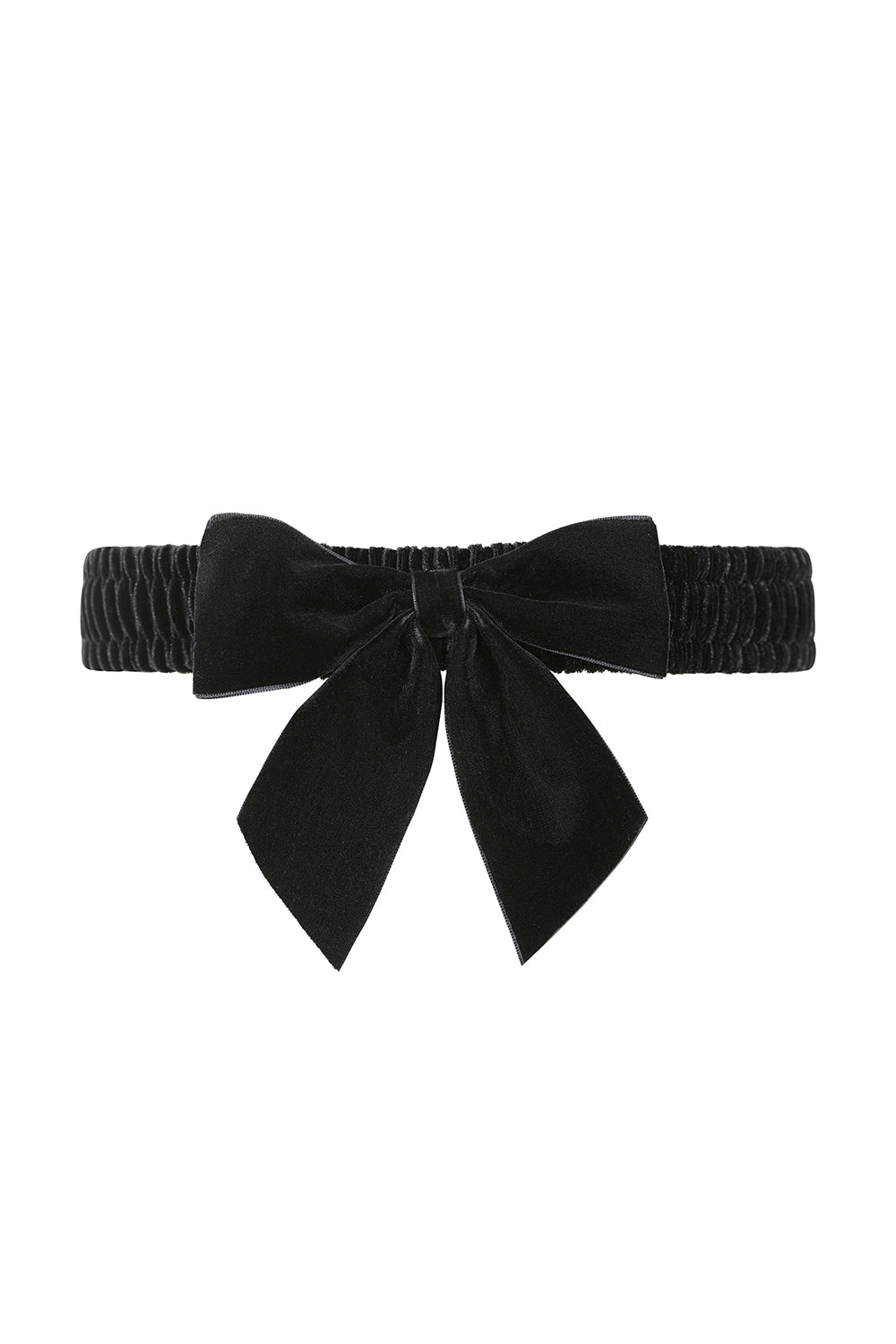Black cinch belt with black velvet bow. Elasticized and snaps closed at the back