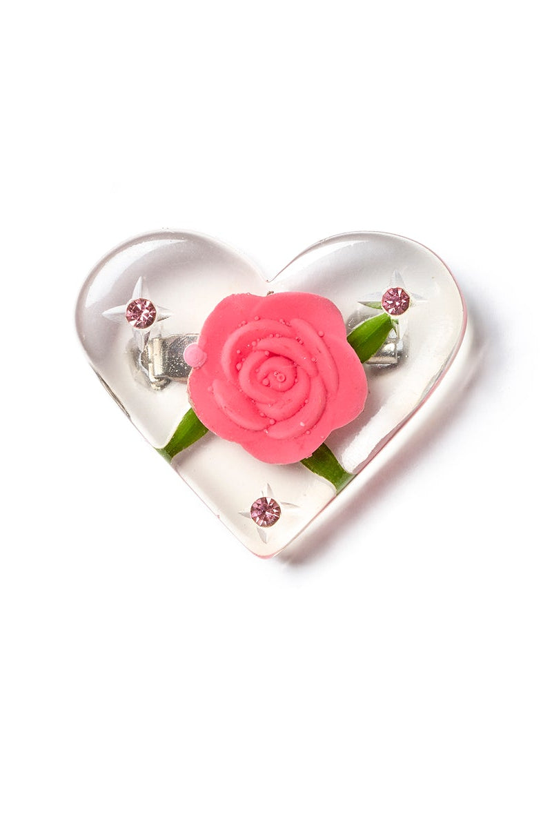 Vintage romance in brooch form, the Sweet Juliet Brooch features a pink resin rose with carved leaves and a scattering of sparkling gems. A beautiful accessory for your coat or cardigan, and the perfect gift for your sweetheart (or yourself).