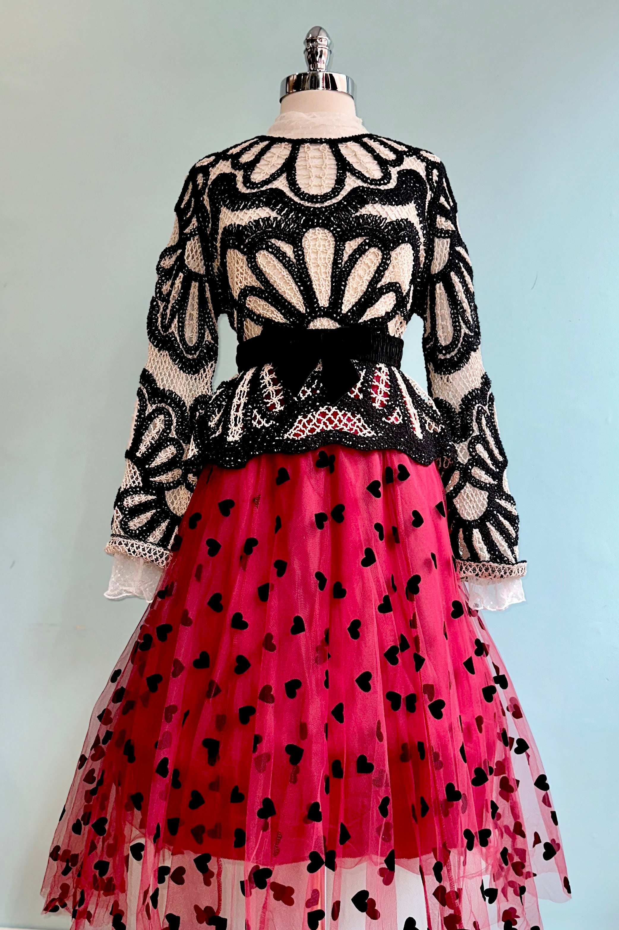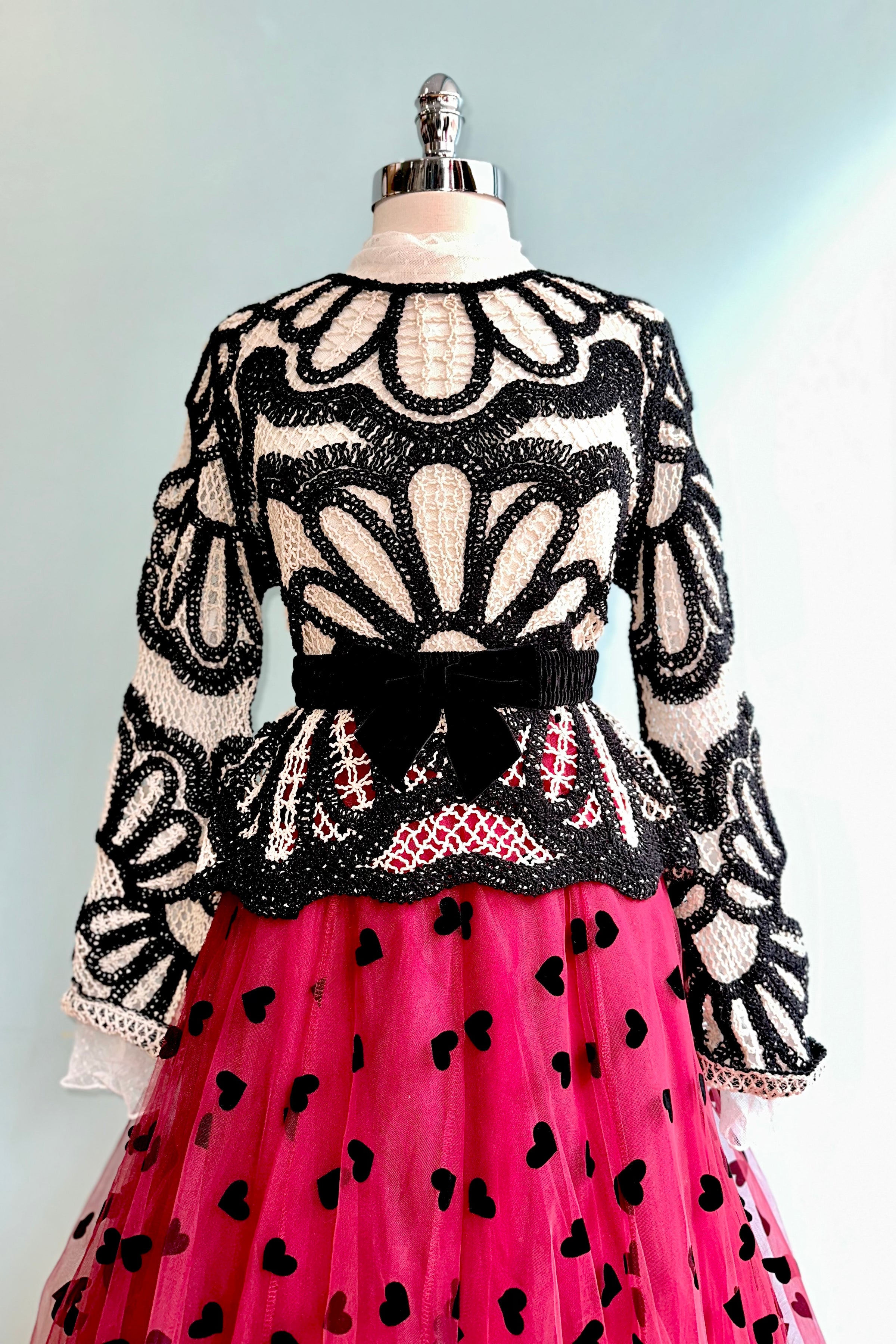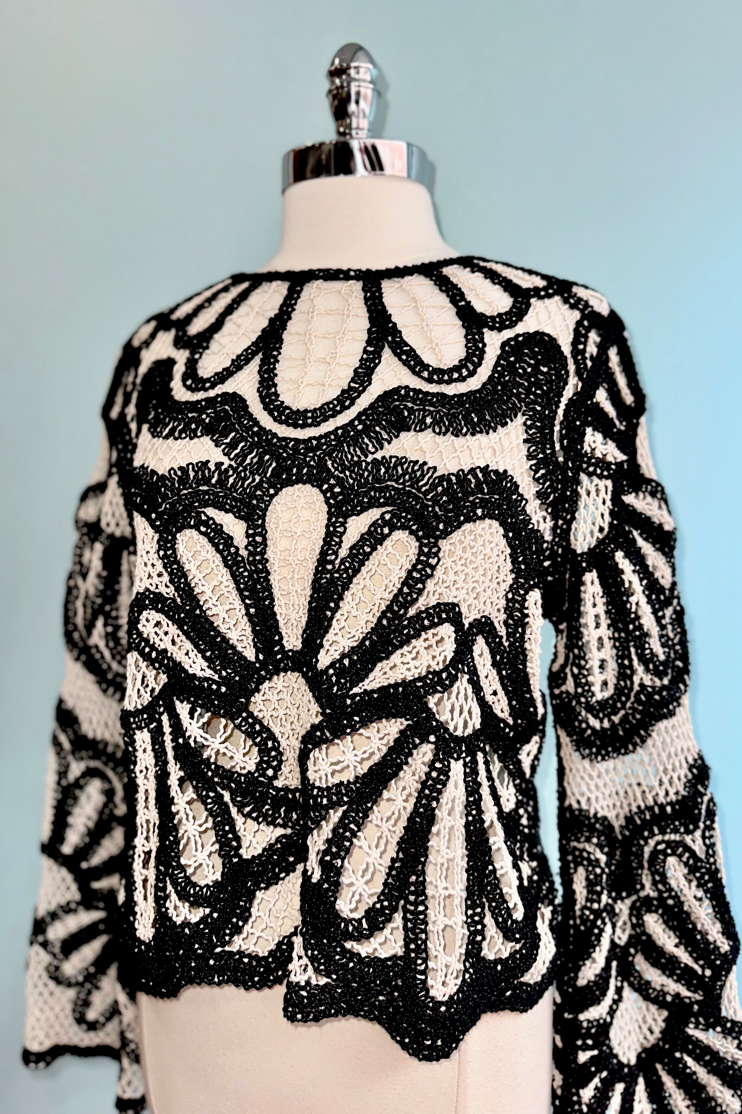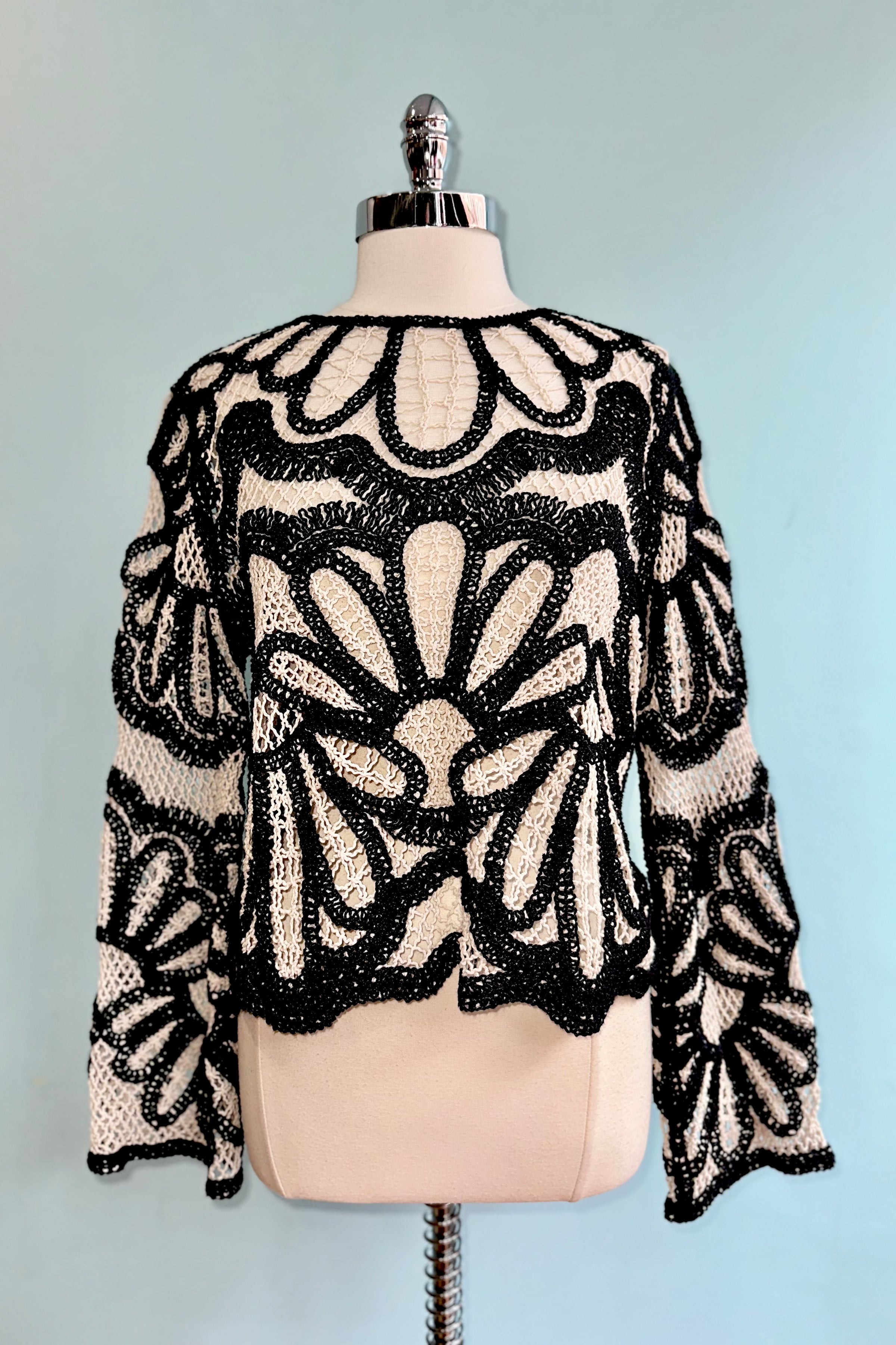 Black and white flower crocheted sweater with long bell sleeves. This sweater has a keyhole fastener at the back neck and a scalloped hem. There is some give to the knit not as much as a sweater.