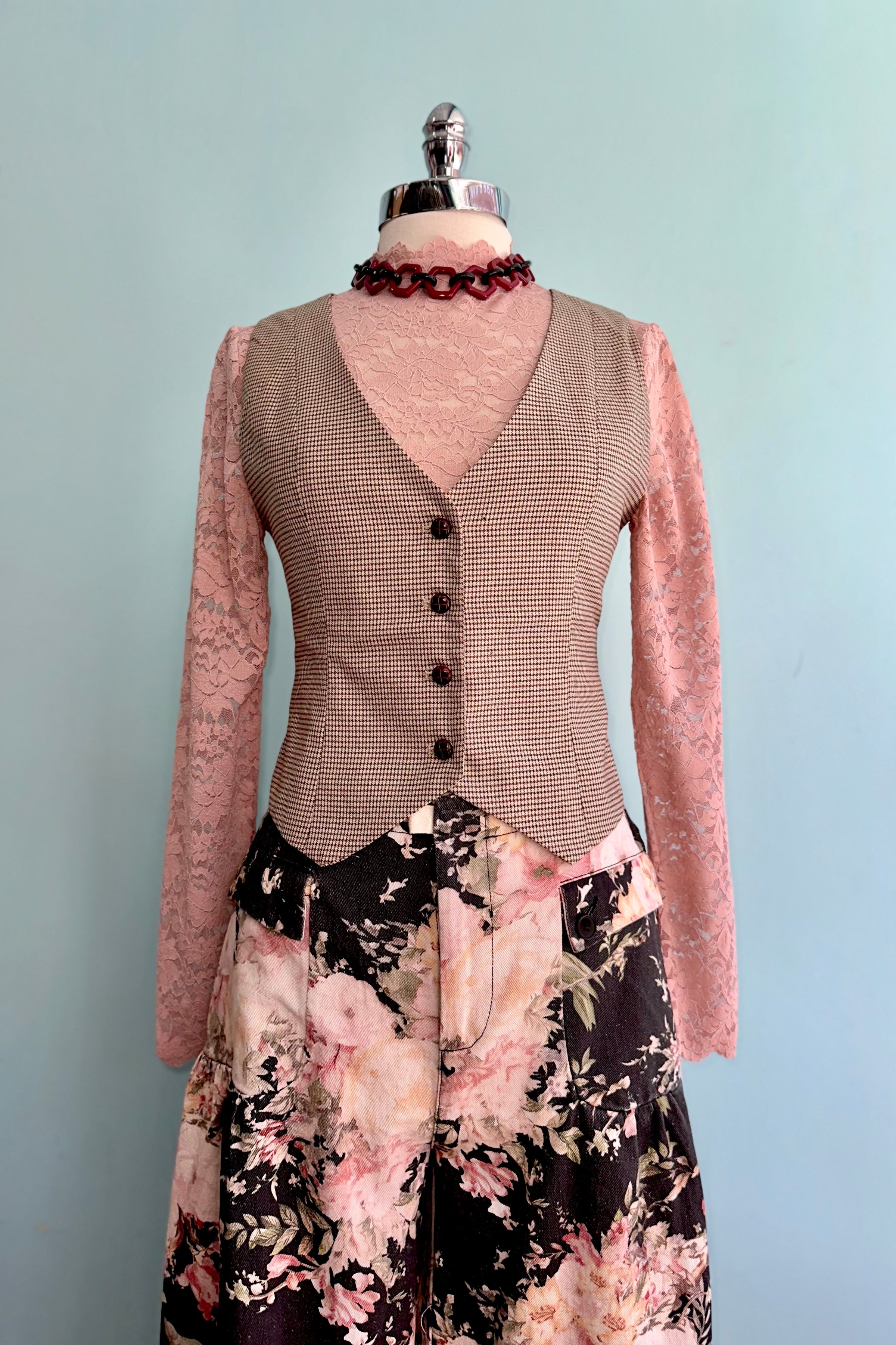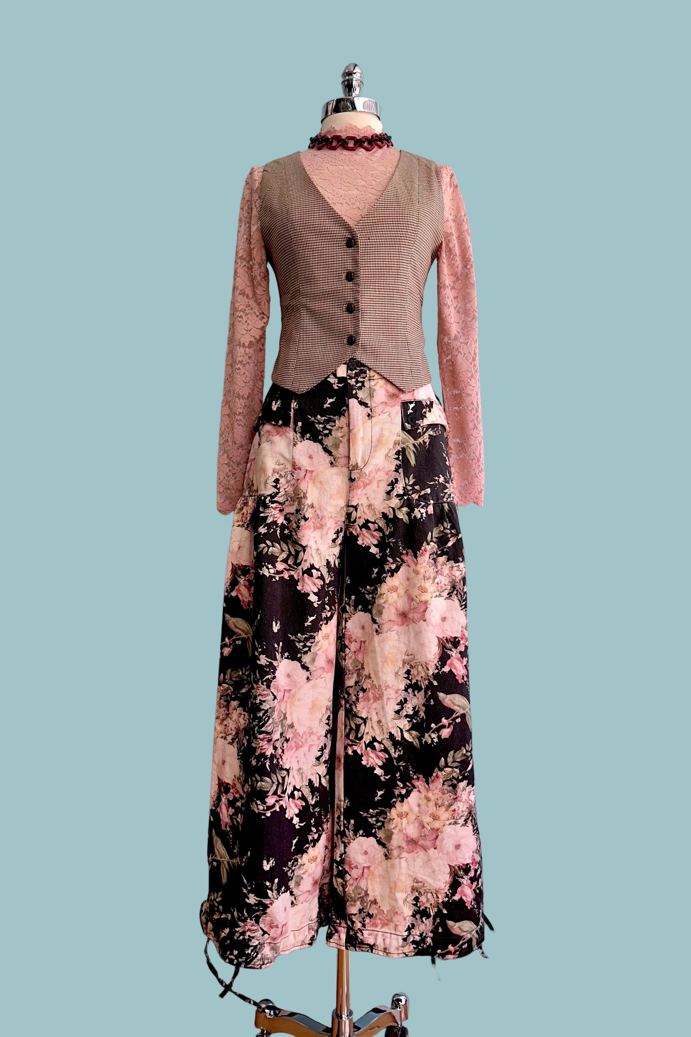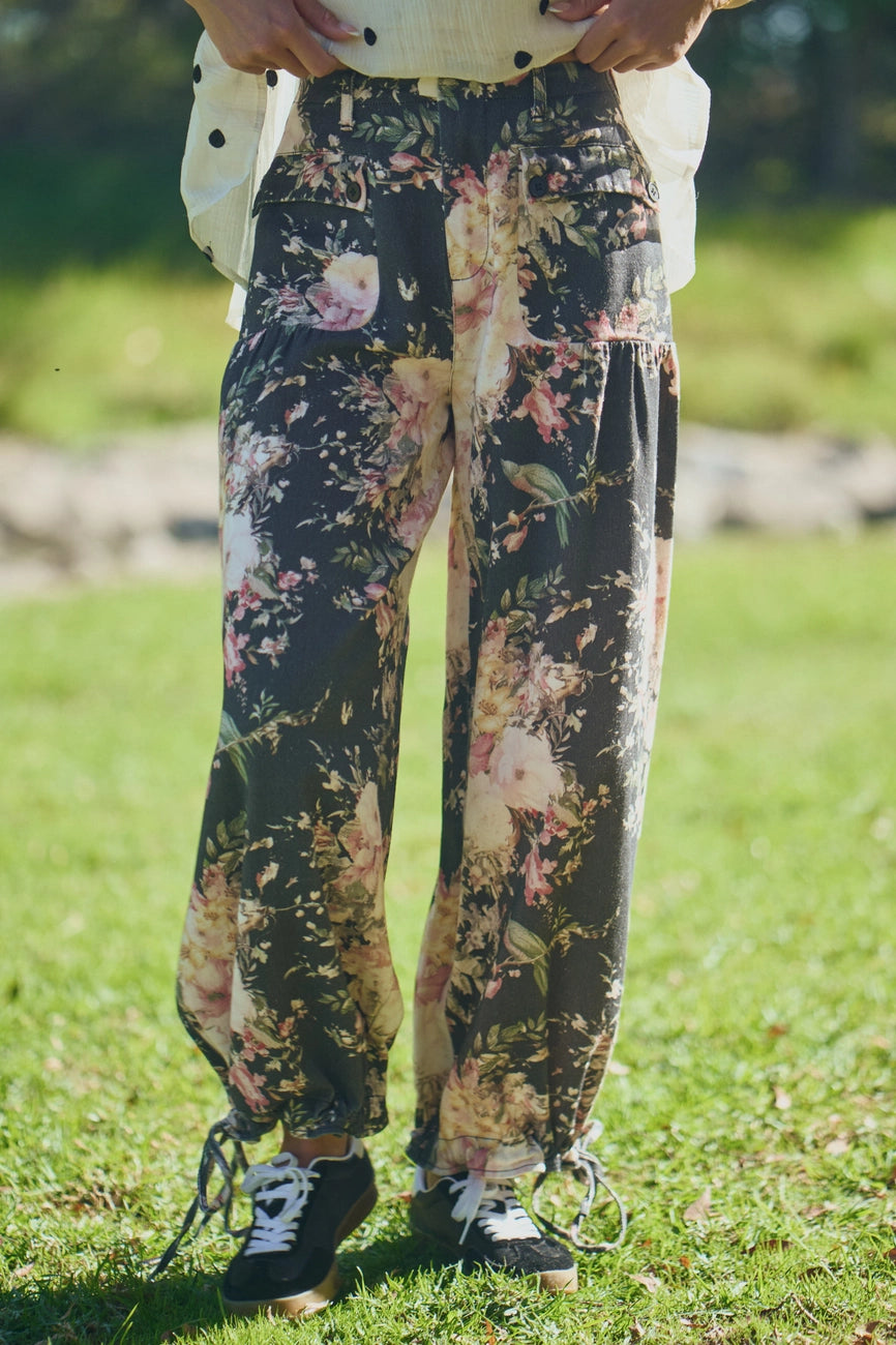 Black floral cotton twill pants with a zip and snap front closure and a drawstring adjustable width at the hem. These pants are a wide leg made of a soft cotton twill, great movement, not stiff! There are front pockets that have a two button closure. The waist has an elastic back to give you lots of room for comfort.