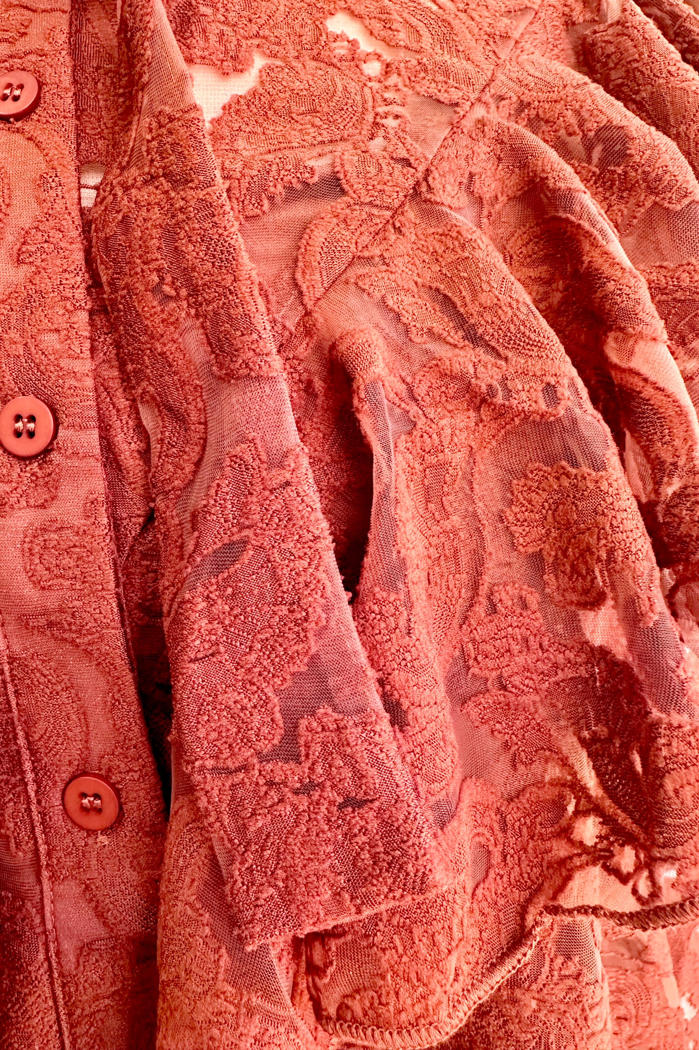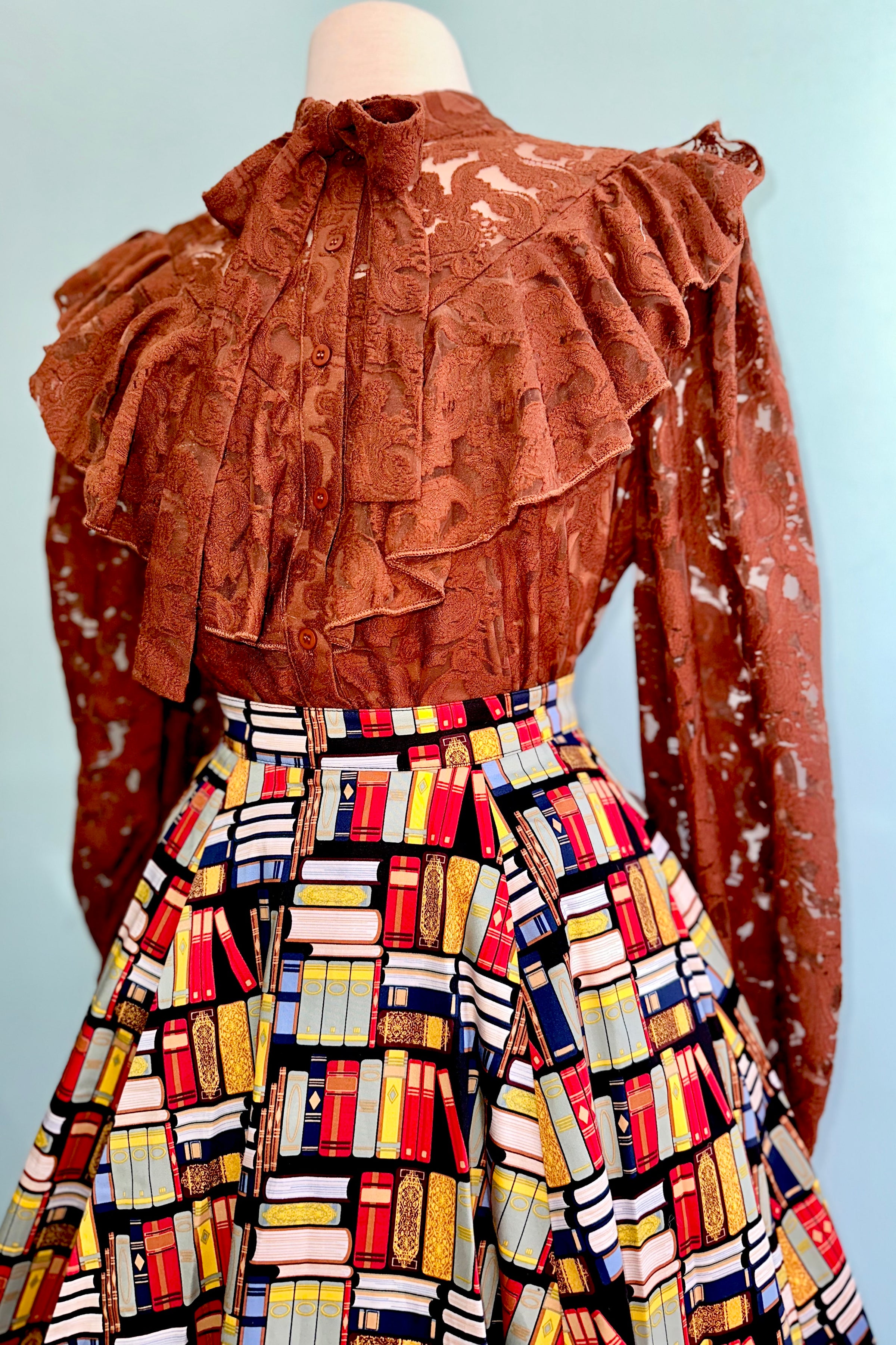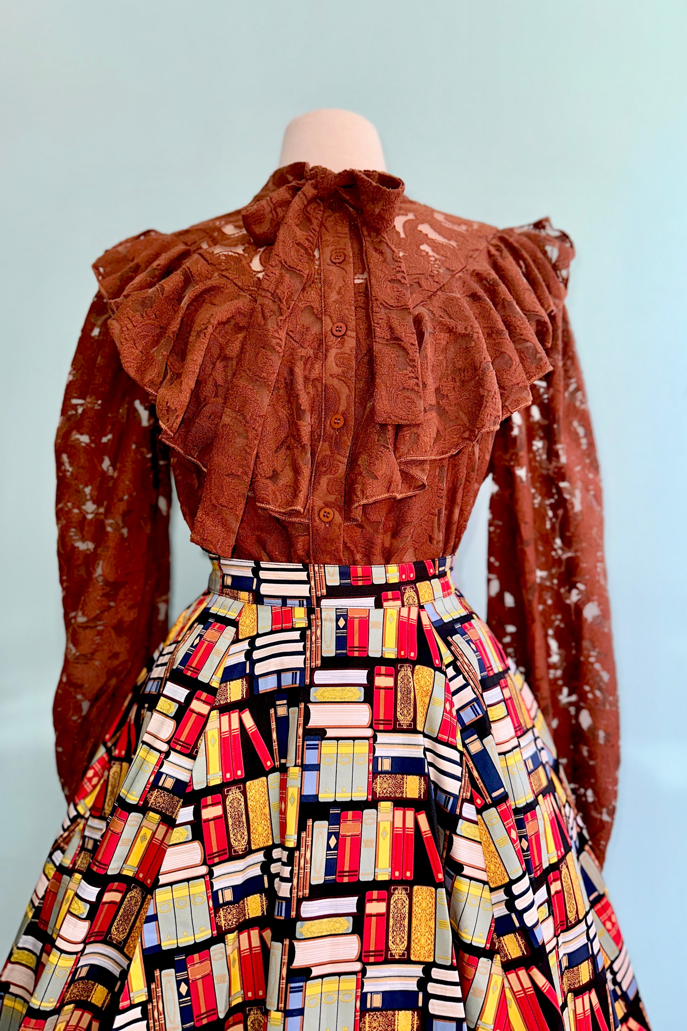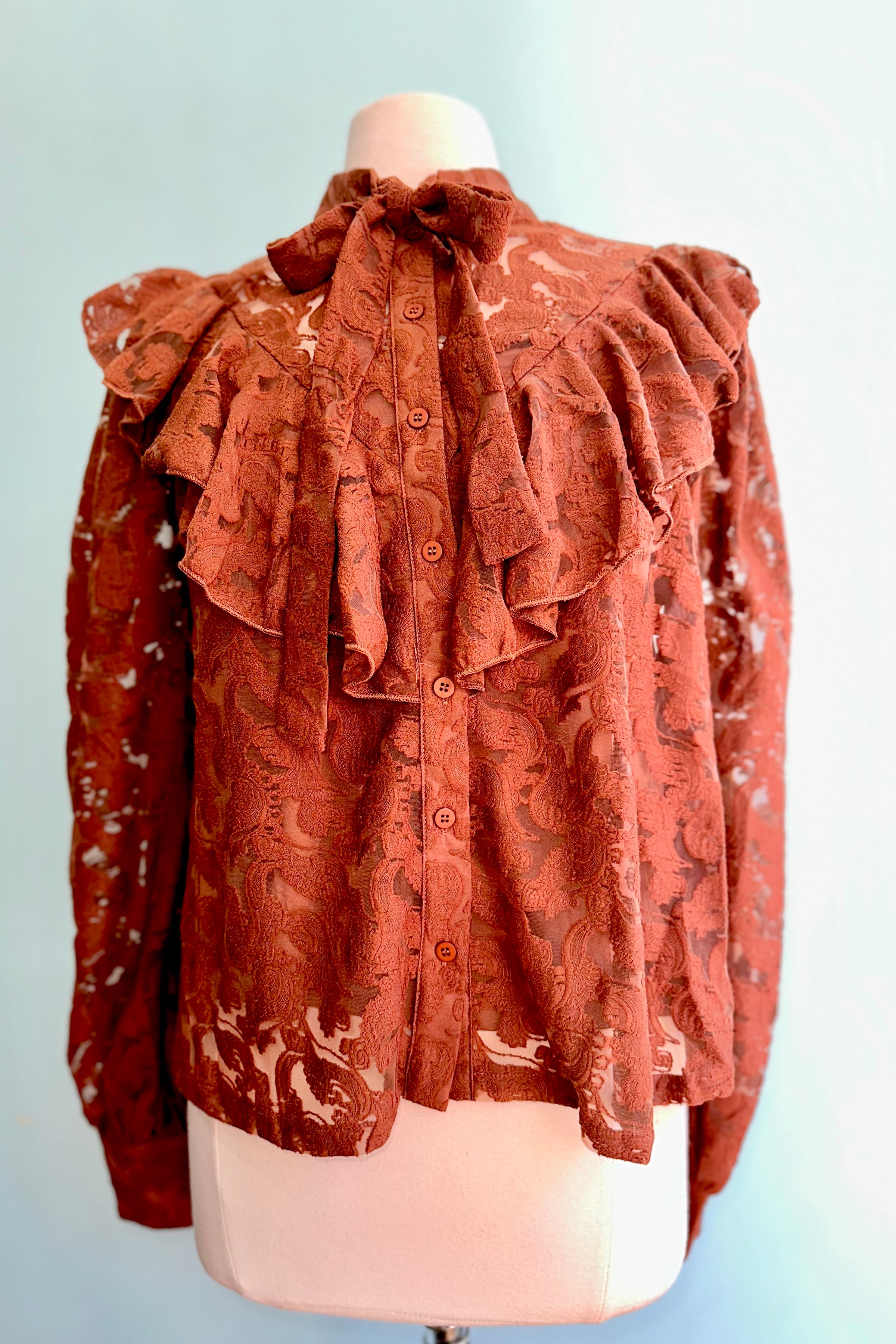 Brown lace button down top with a tie neck. This top has long sleeves that fasten at the wrist and a ruffled yoke. Lined in a tank top