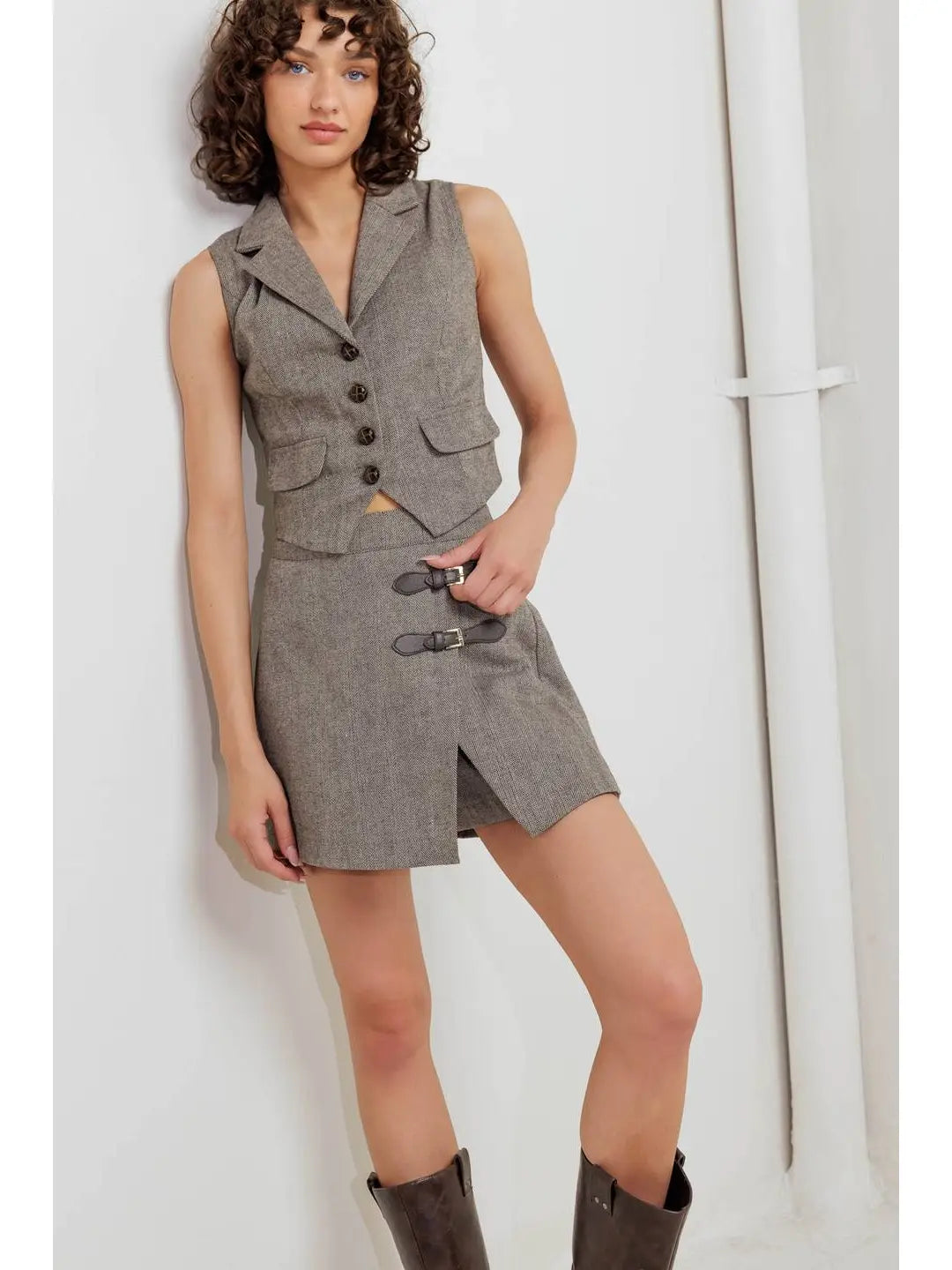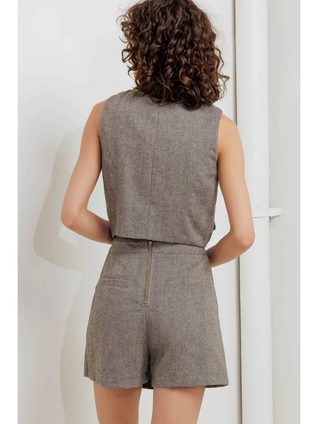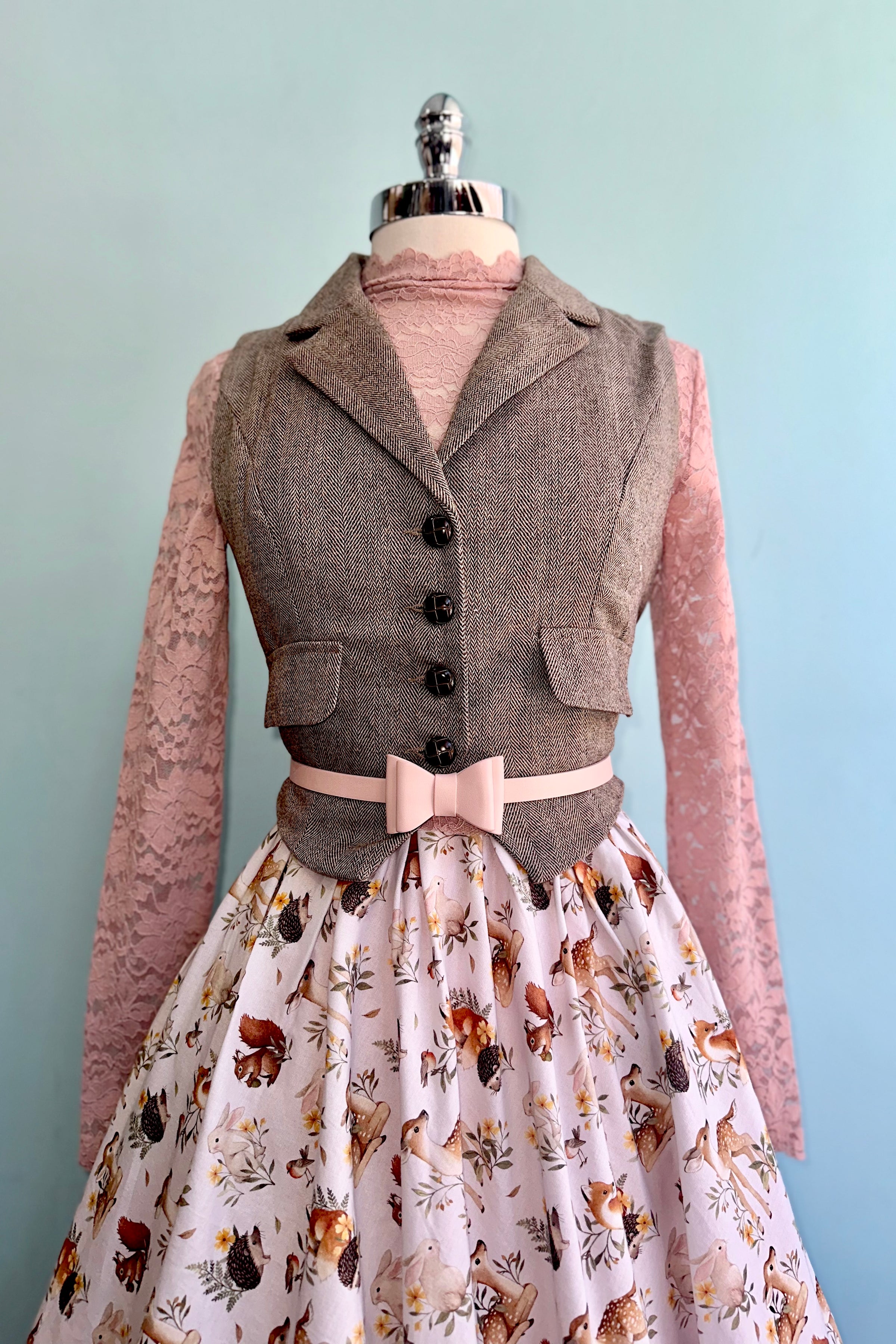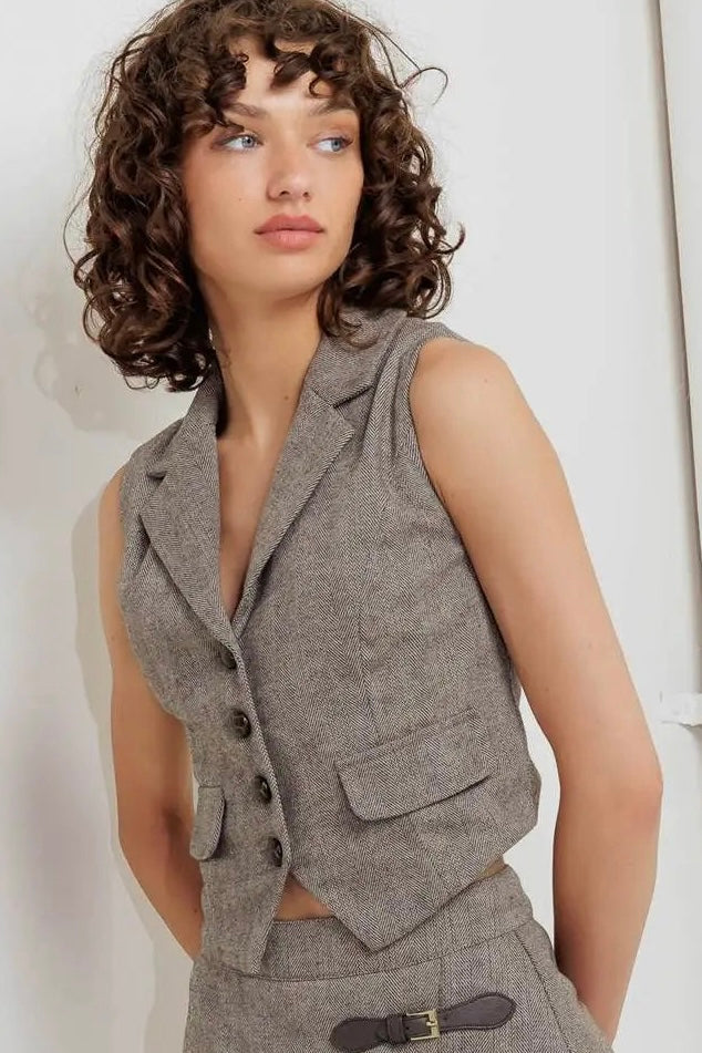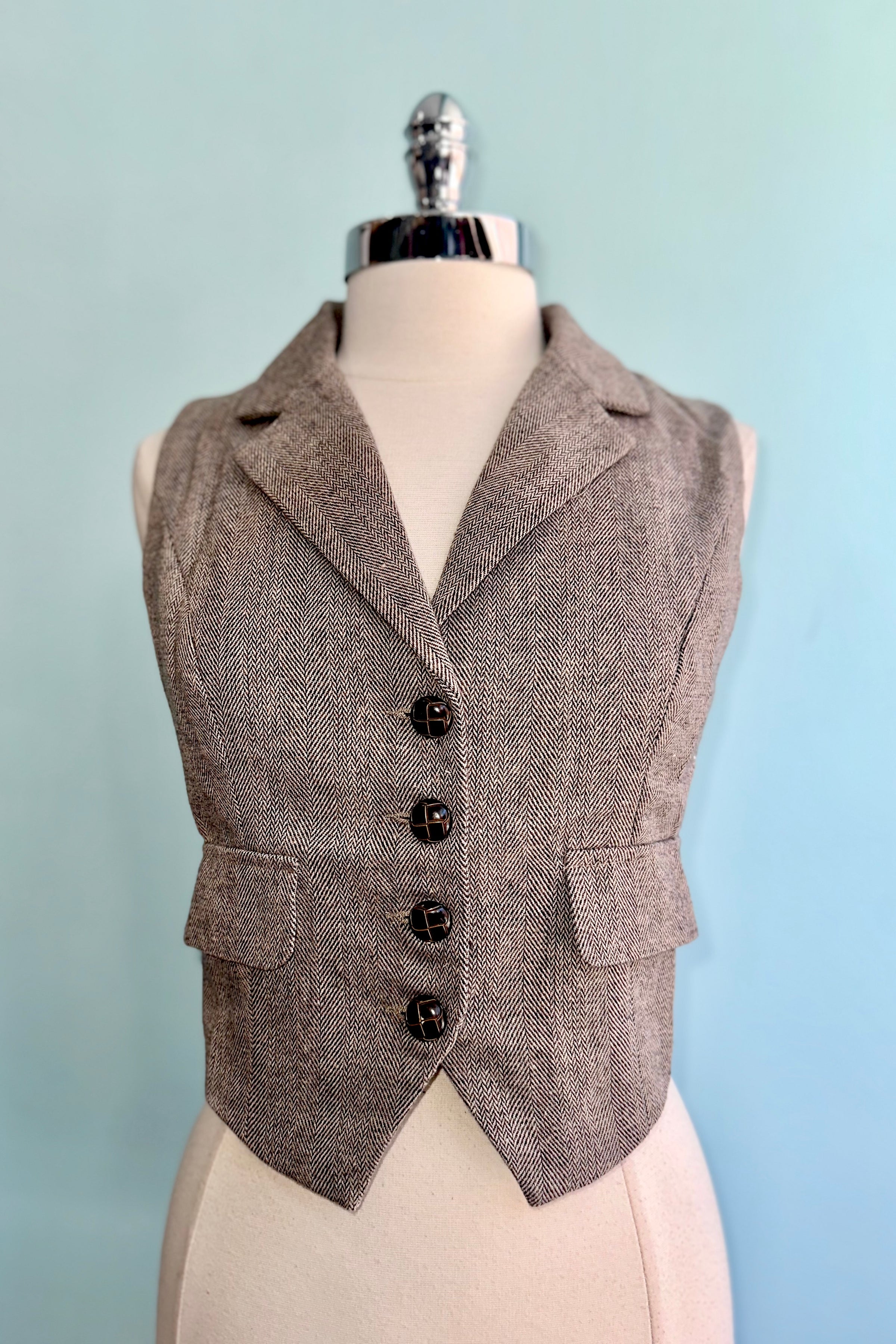 Brown tweed vest with a button front and fold over collar.  This vest is lined in satin.