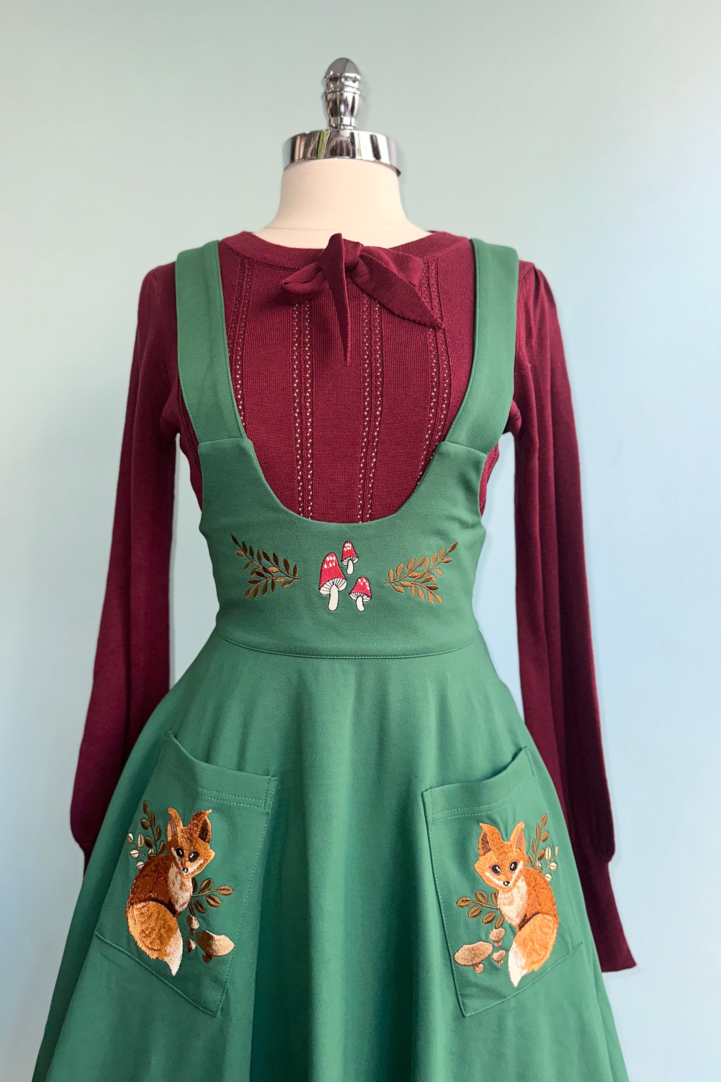 Green high waisted skirt with attached suspenders. There are embroidered mushrooms at the center waist and the pockets have the most adorable embroidered baby foxes! The straps are adjustable with a button in the back. The closure is a back zip. Not lined.