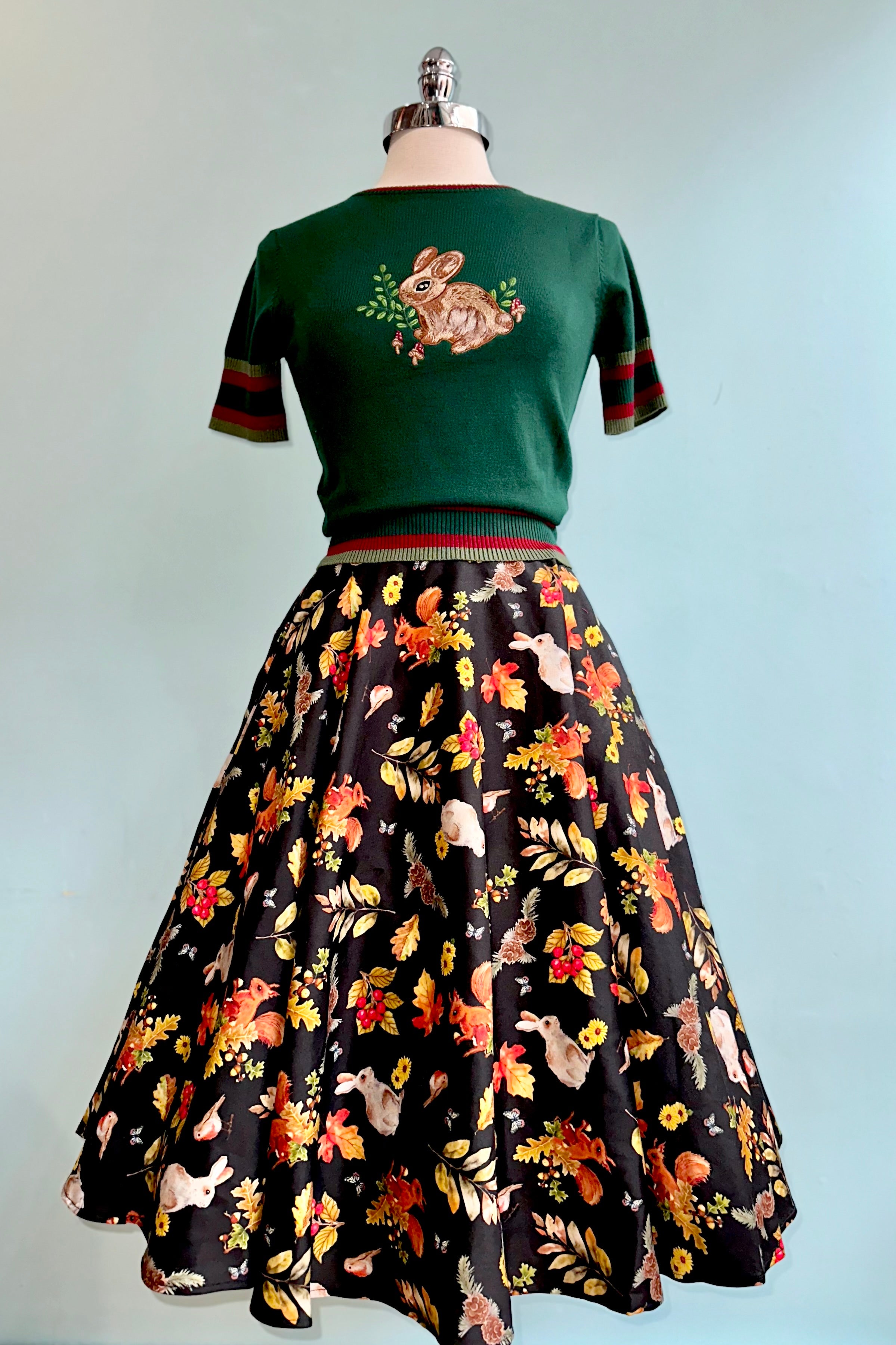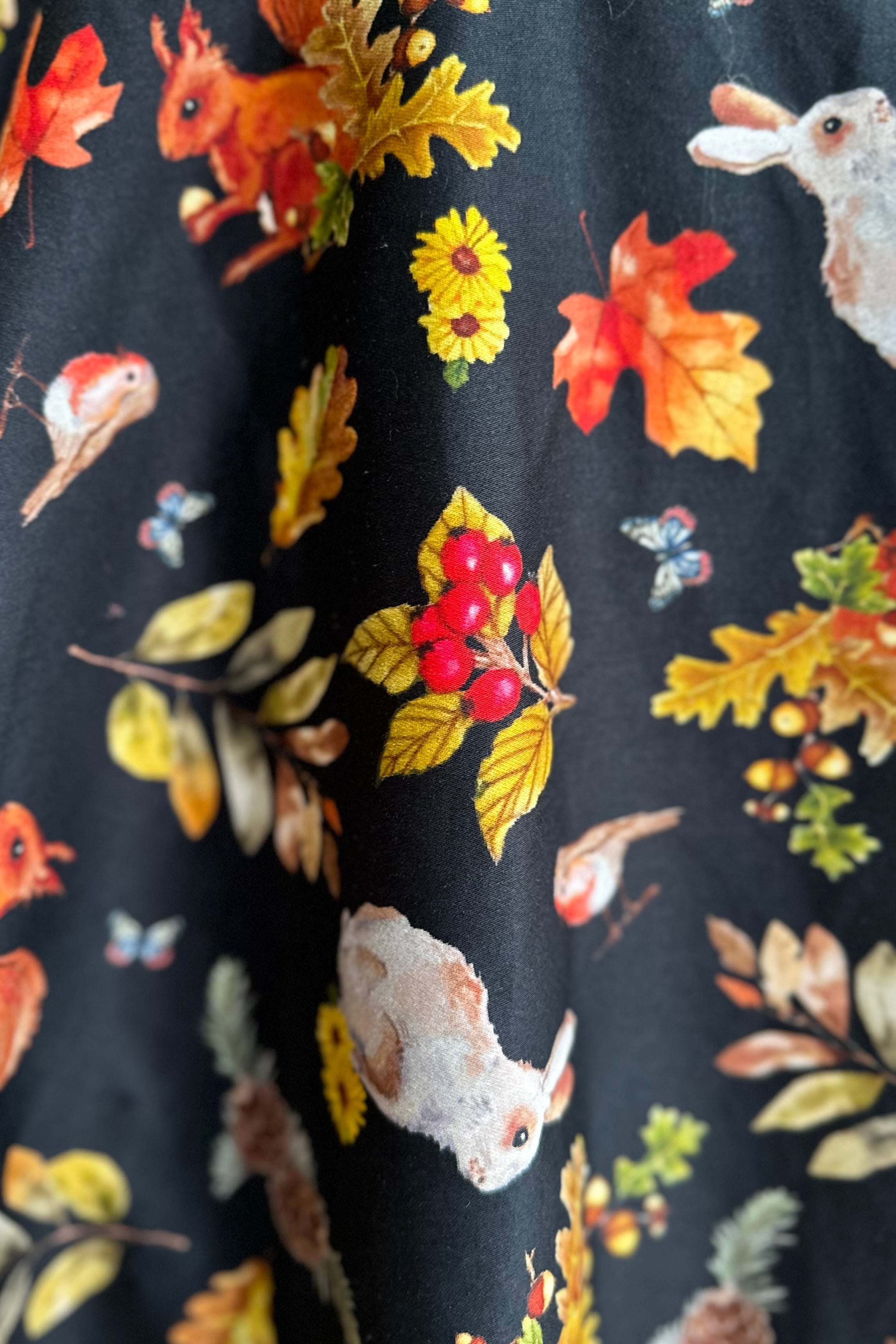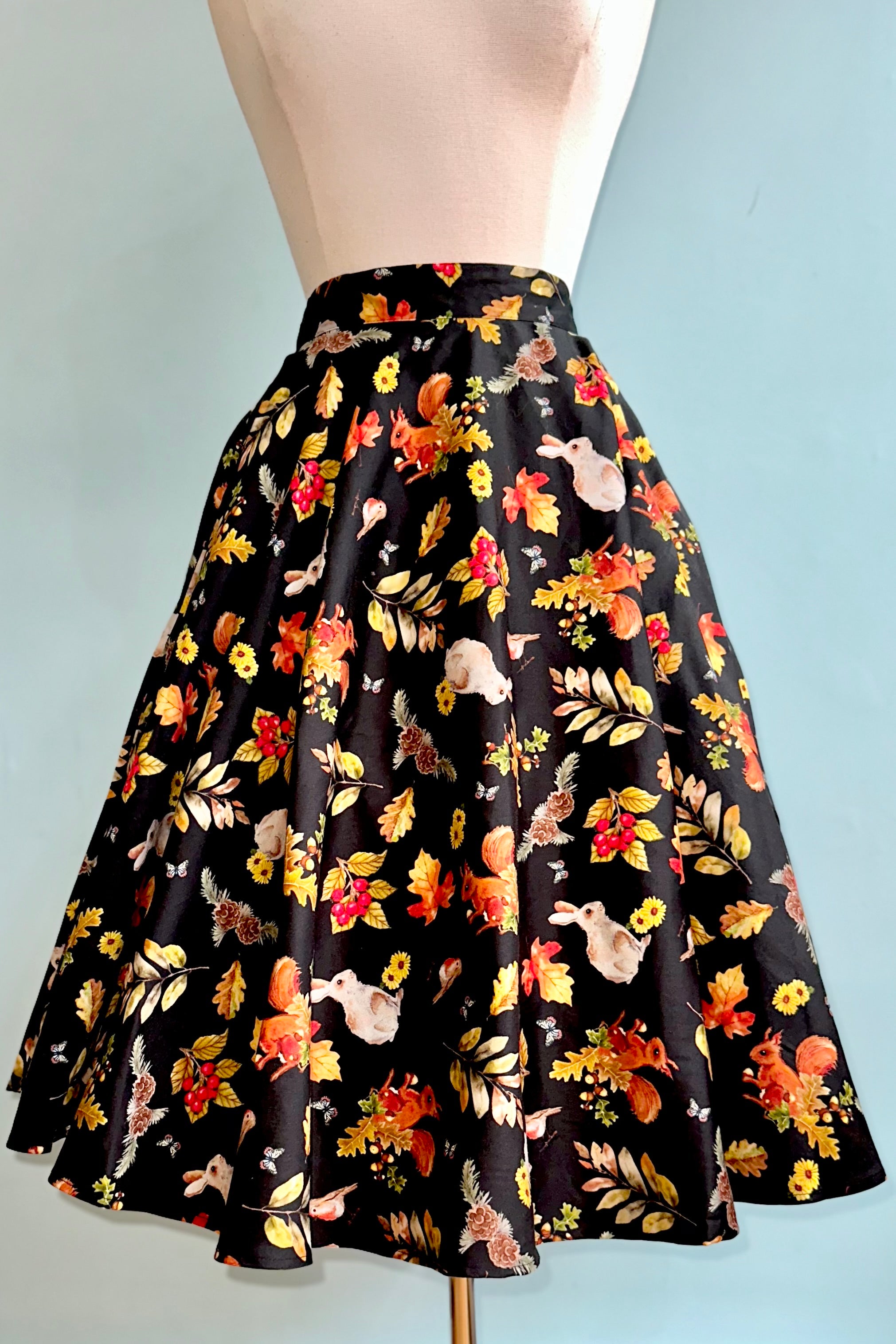 Circle skirt in black with a leaf and woodland animal print. This skirt is a full skirt with a back zip and button closure and side pockets.