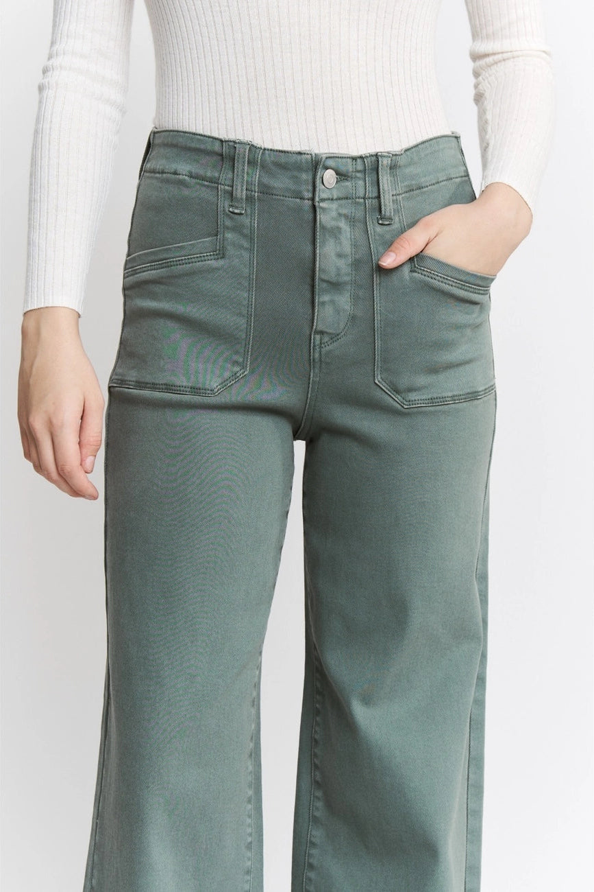 Light sage green colored twill pants with a button and zip closure and wide leg. These are high waisted and have a wide leg.