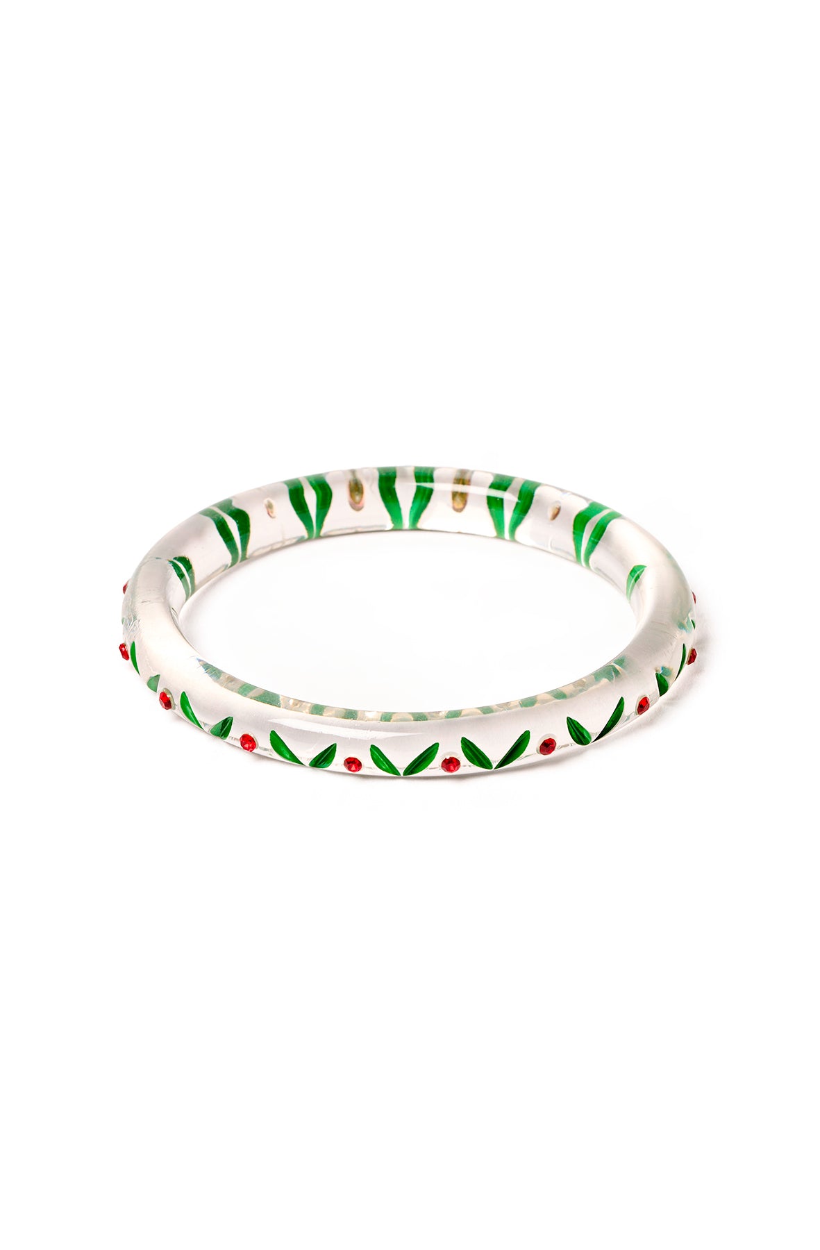 Love is in the details with the Narrow Lover’s Knot Bangle. The clear resin is packed with romantic red roses, reverse carved leaves and red gems that sparkle like a sweetheart’s eyes.