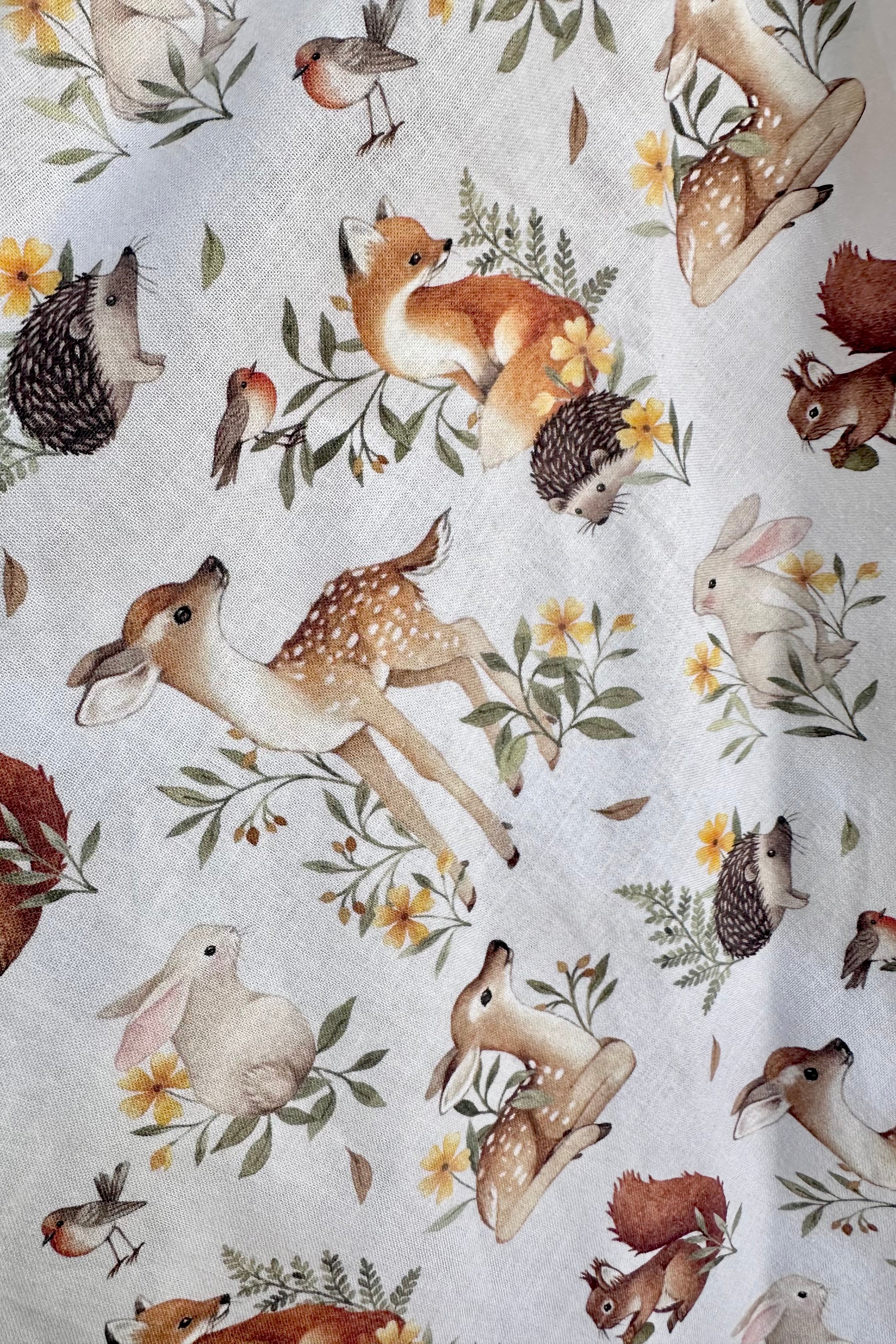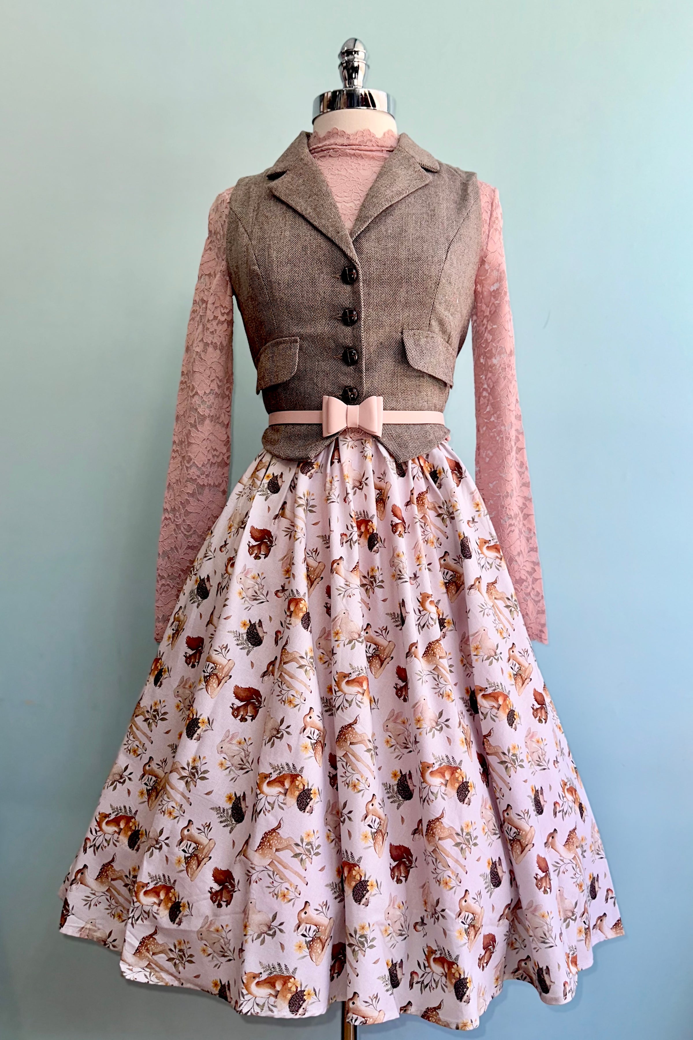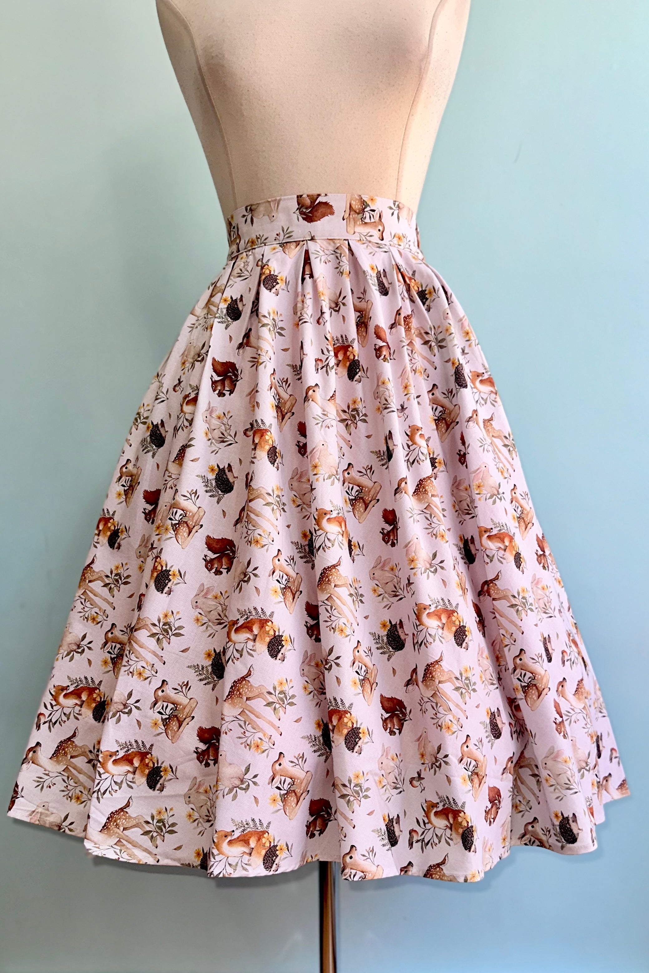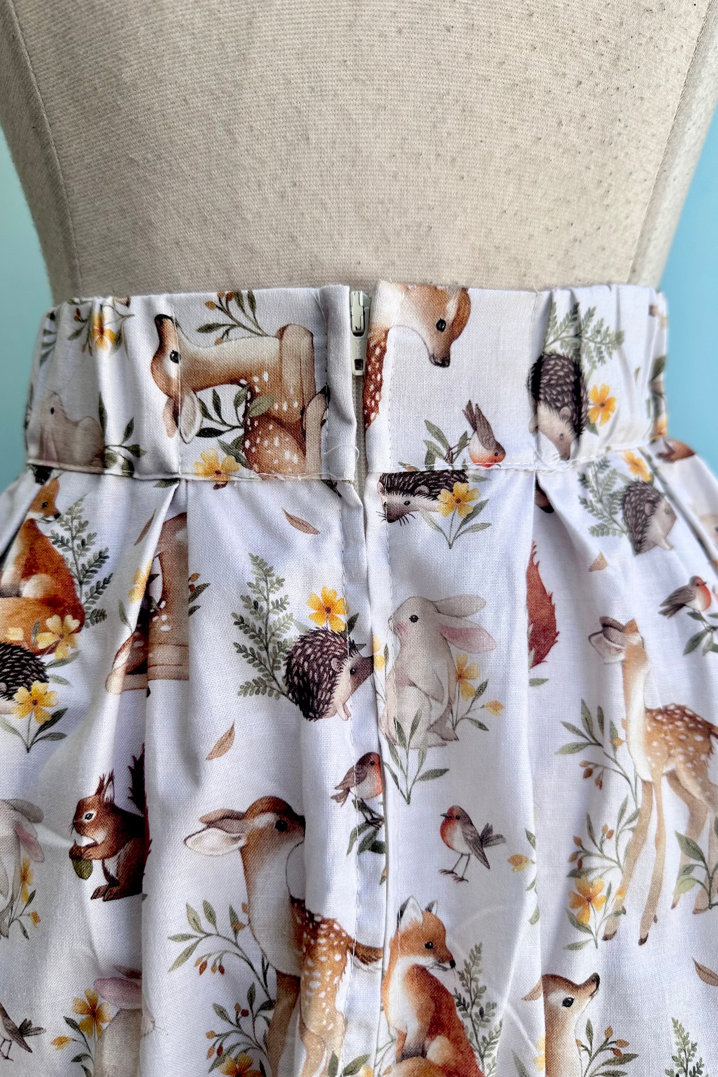 Full skirt in gray with a print of precious woodland animals. There are deer, bears, hedgehogs, bunnies, foxes, and birds! This skirt is 100% cotton and has an elasticized back waistband for ease of wear! Doris has a full pleated skirt with hidden side pockets, and a back zippered closure. Doris is made in a longer length so she can accentuate all your vintage-inspired outfits!