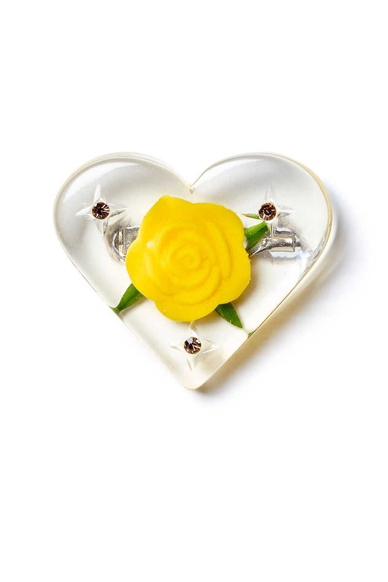 Add a delicate dash of floral charm with the Precious Gold Brooch. A soft yellow rose is inlaid into clear resin with reverse-carved leaves, finished with a sprinkle of warm gems for that Valentine’s sparkle.