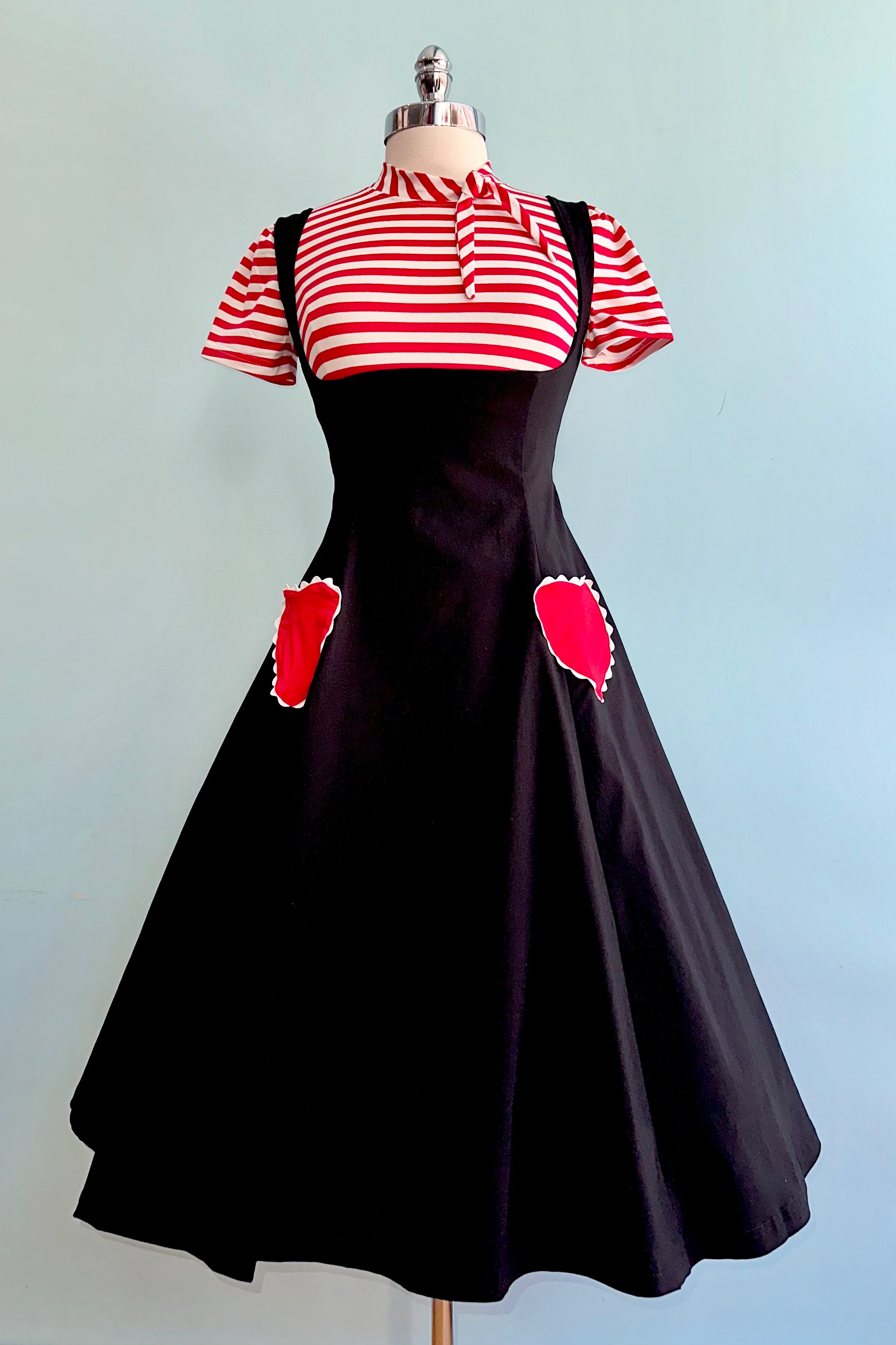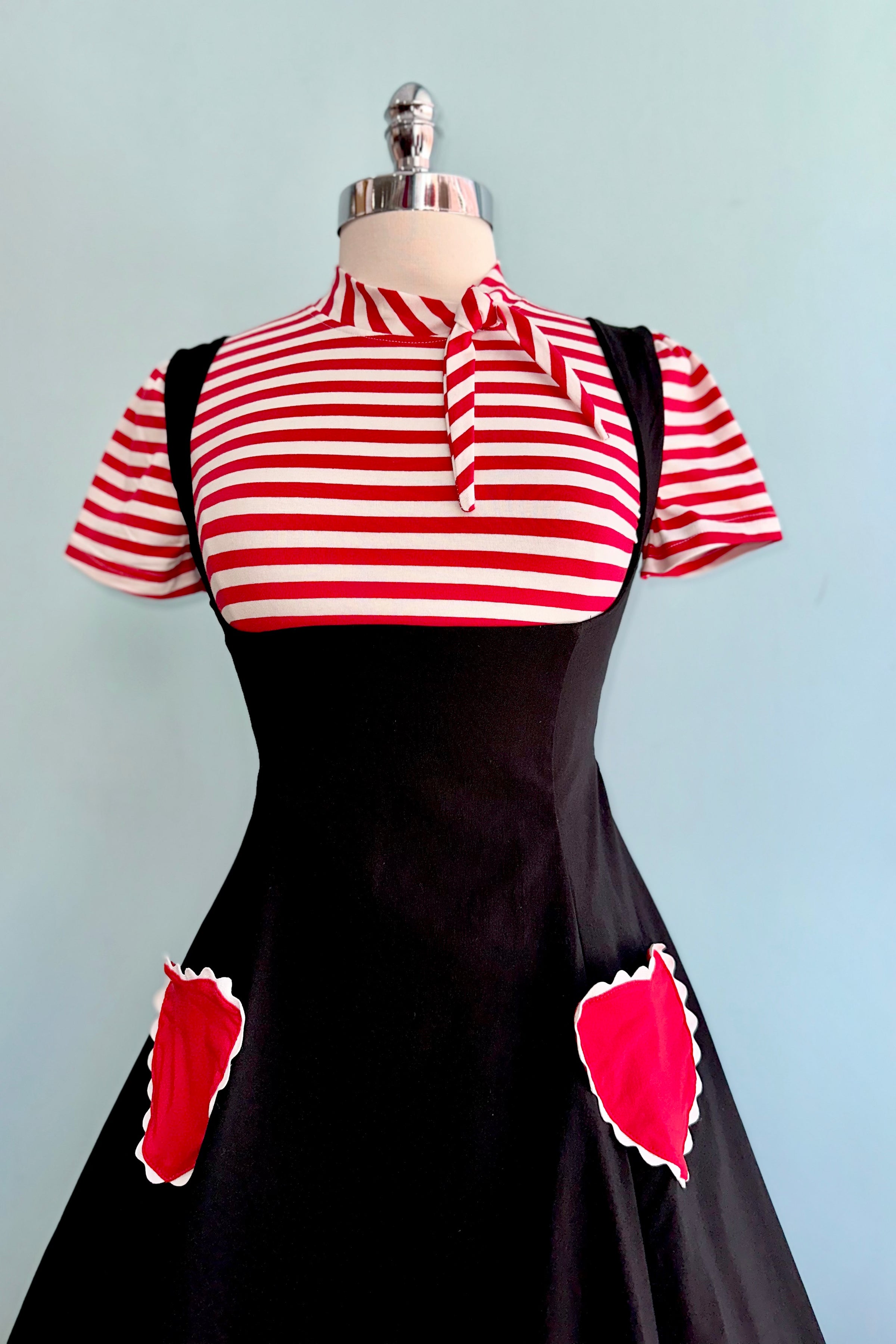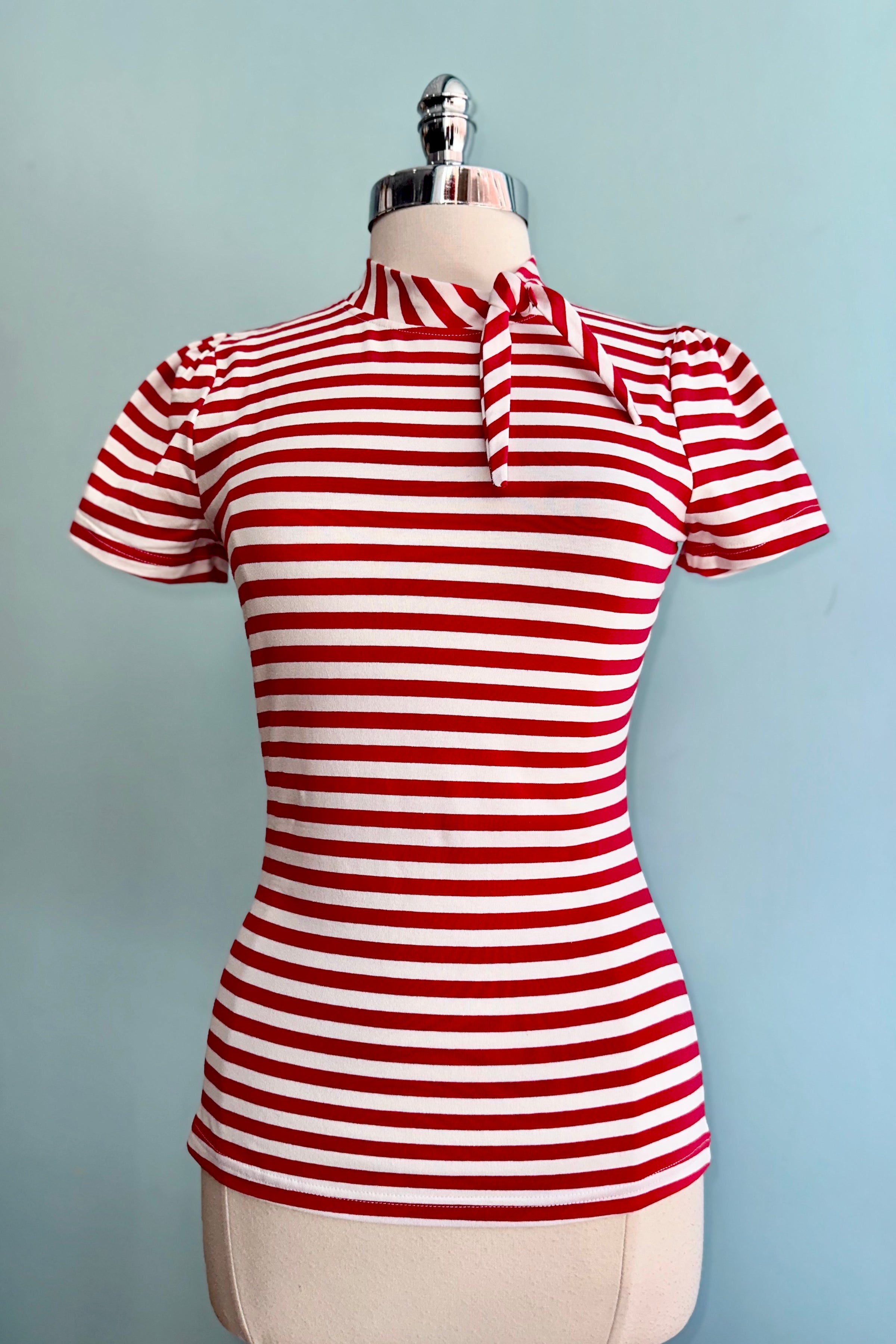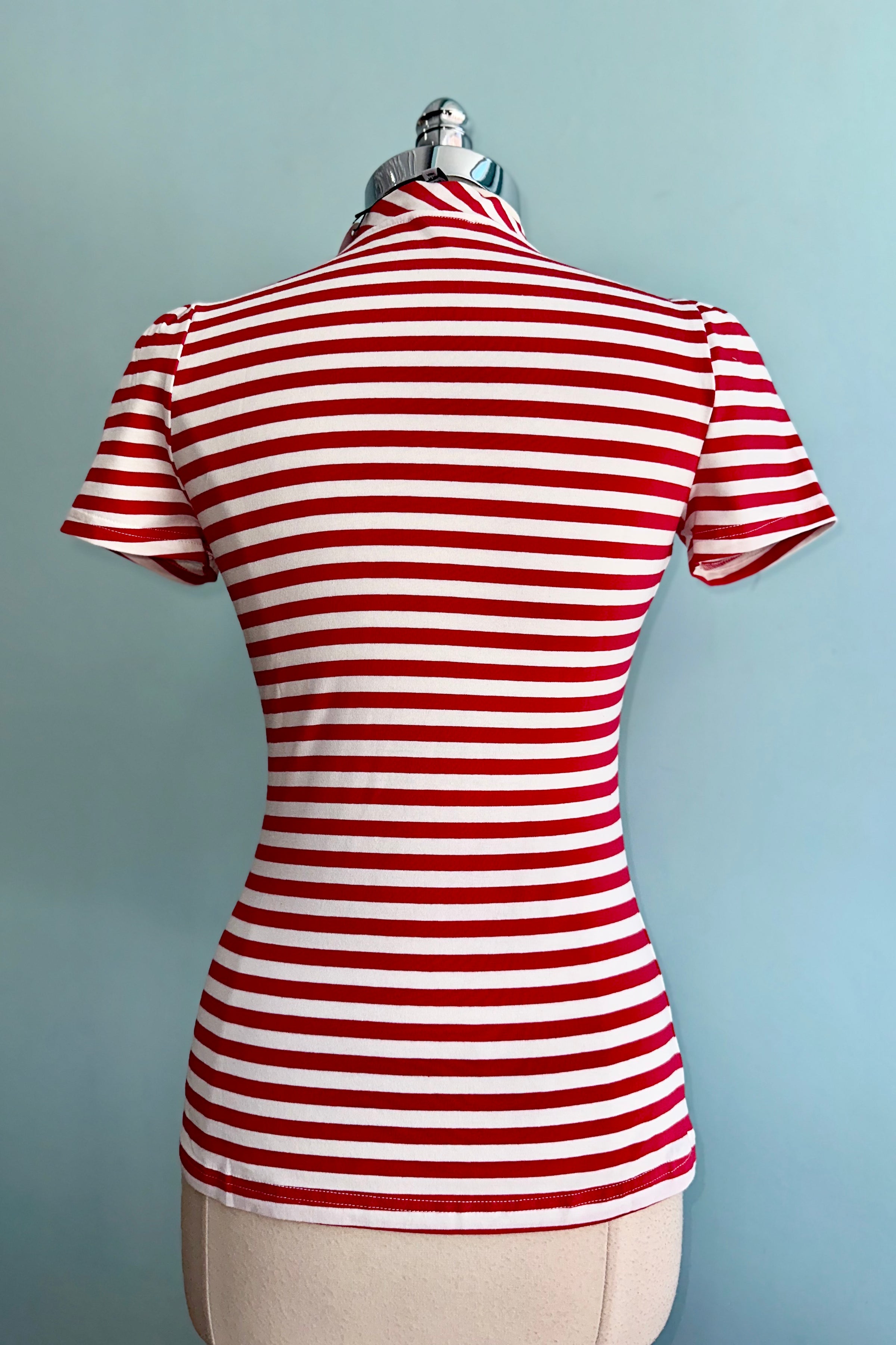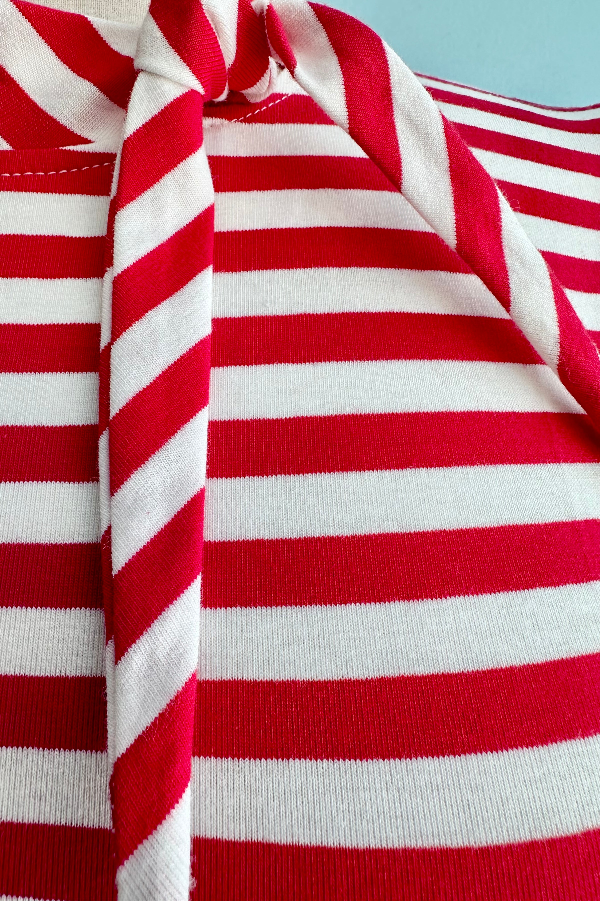 Red and white striped short sleeve knit top with a little tie.