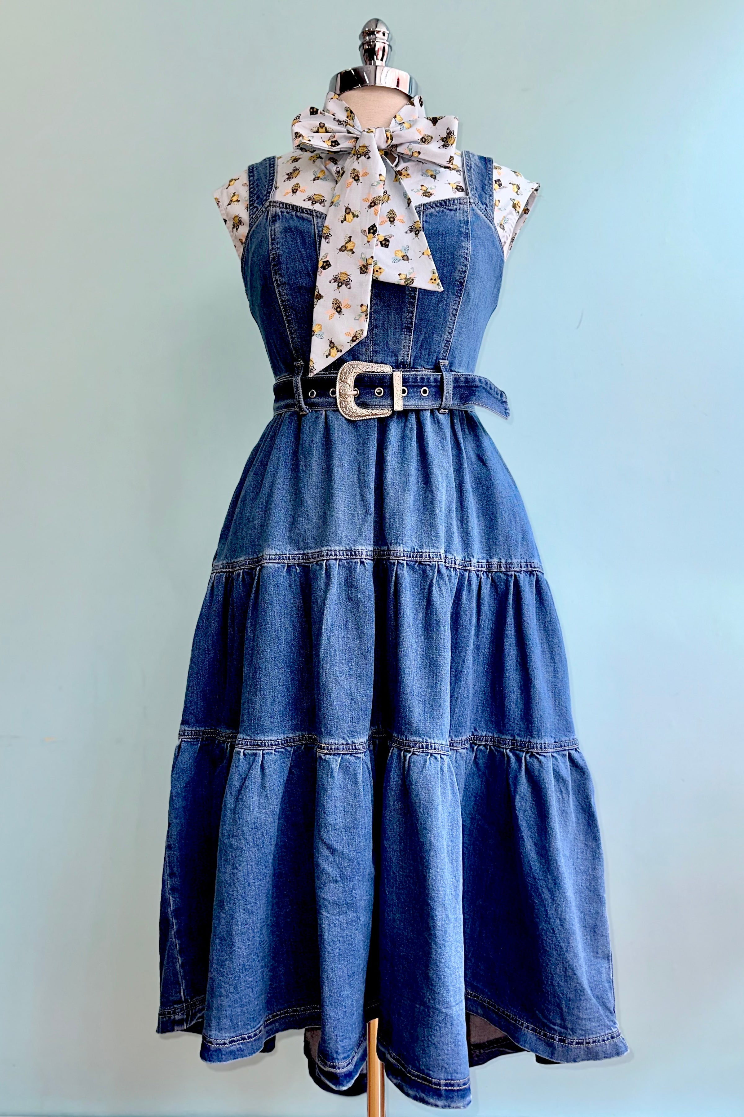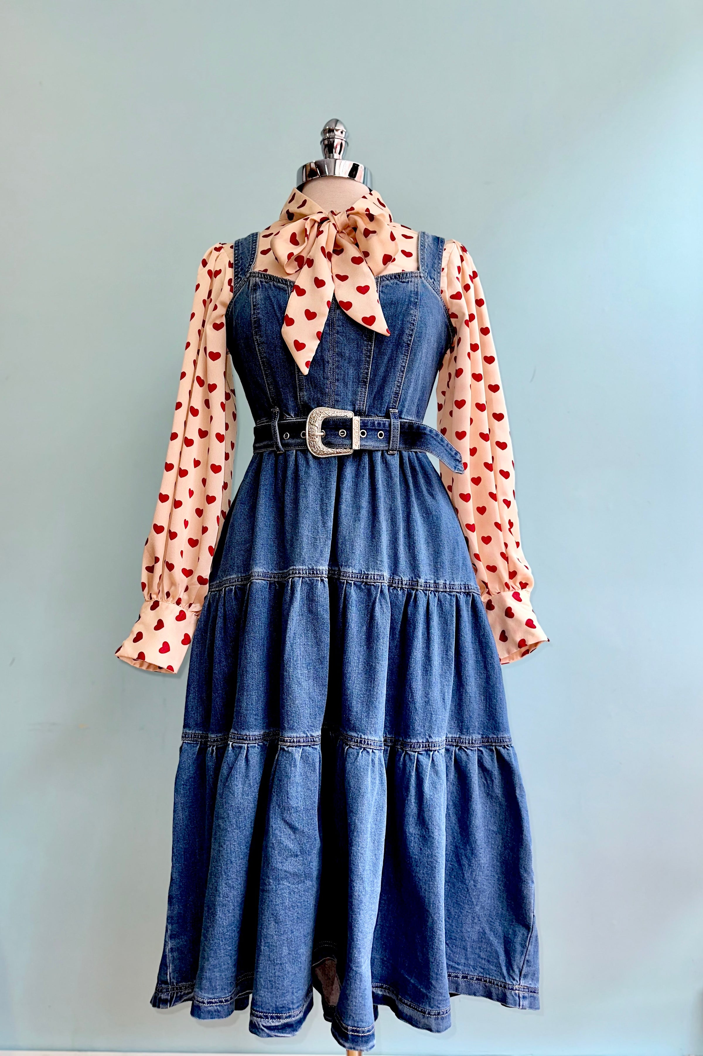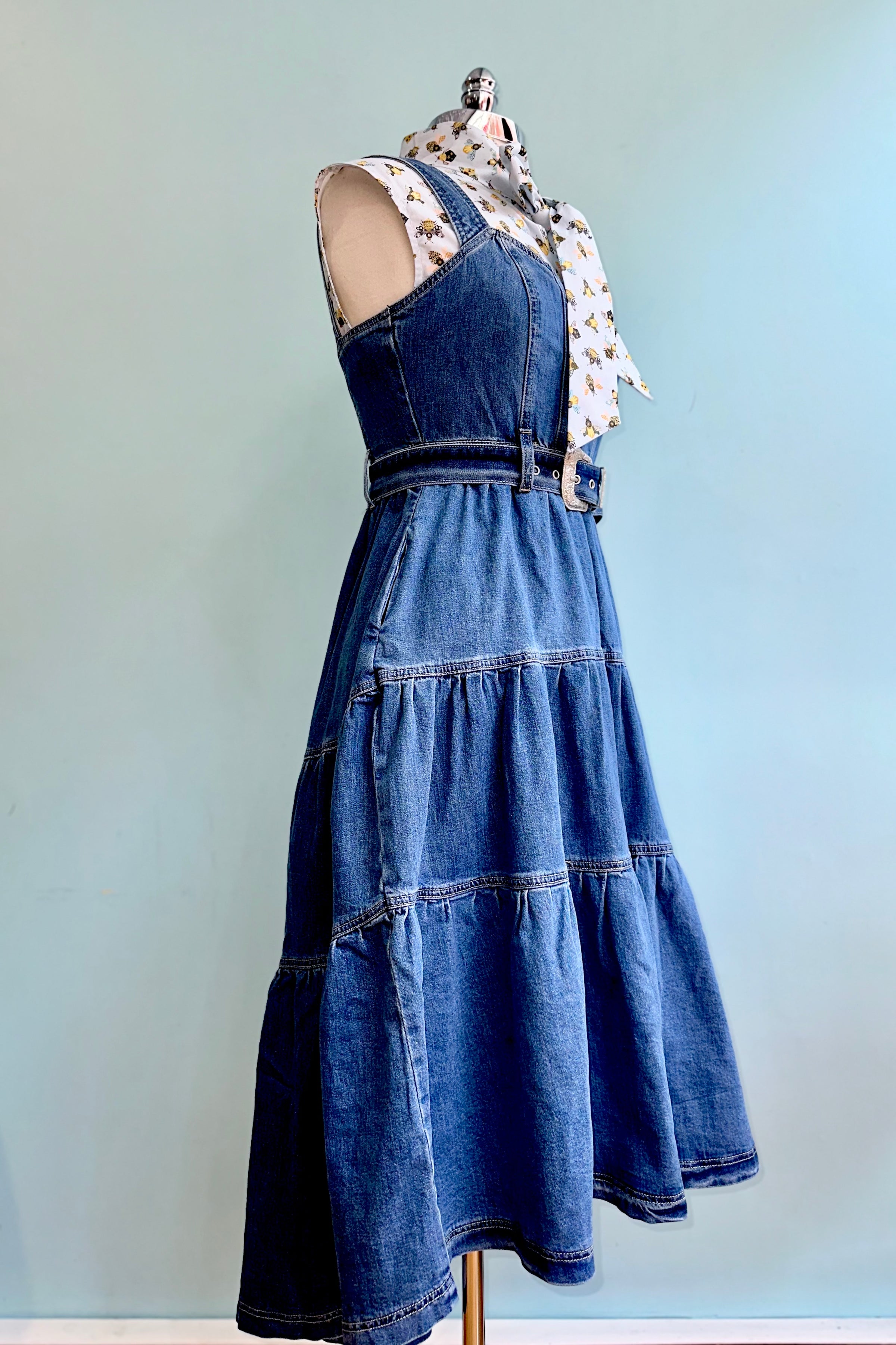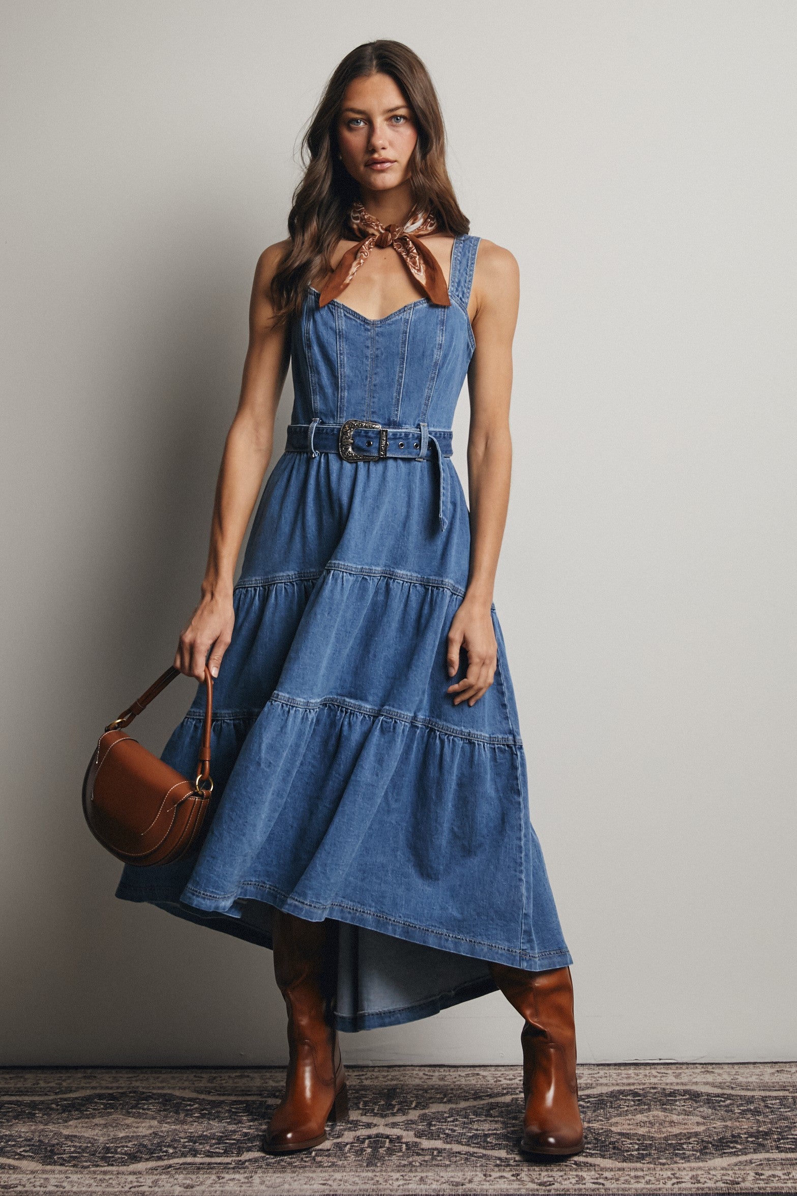 Washed denim dress with a structured yet comfortable drape and hi-low hem. This dress has a sweetheart neckline with wide straps. The skirt has side pickets and is is tiered with flowing panels create subtle volume and movement. The buckle belt is removable and western-inspired that cinches the waist for a defined silhouette. There is a smocked back panel and a back zip closure.