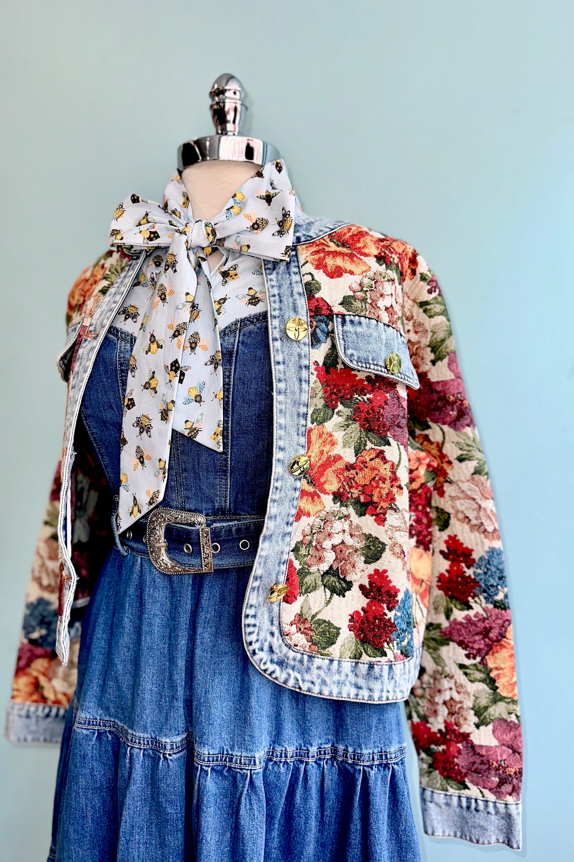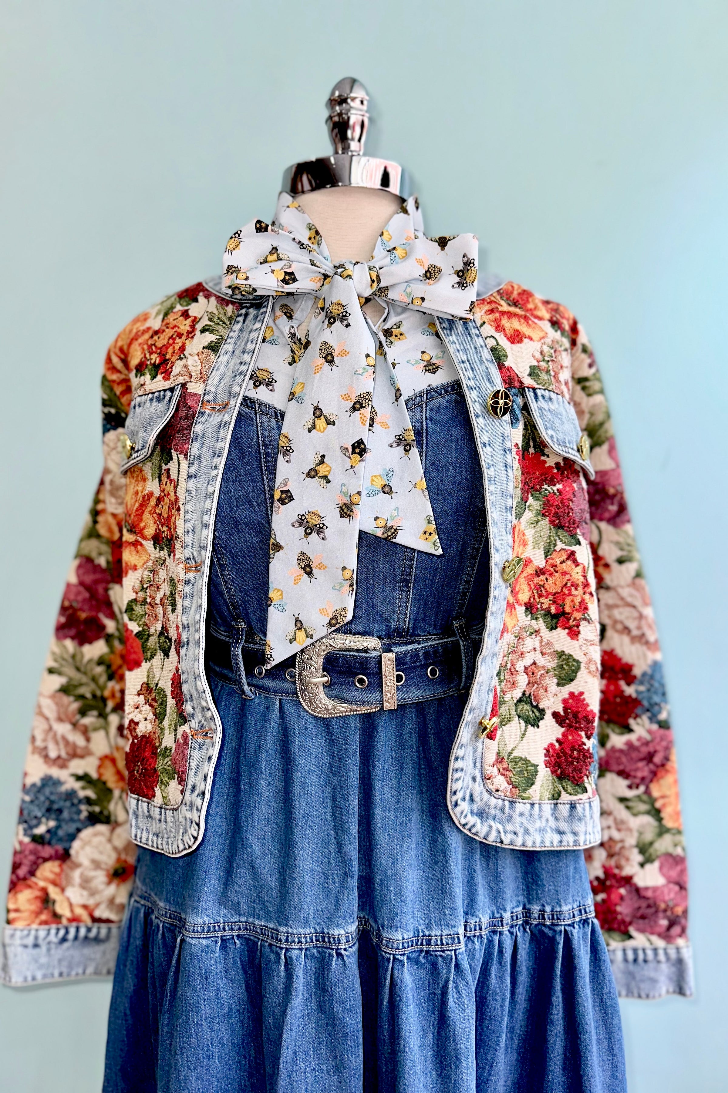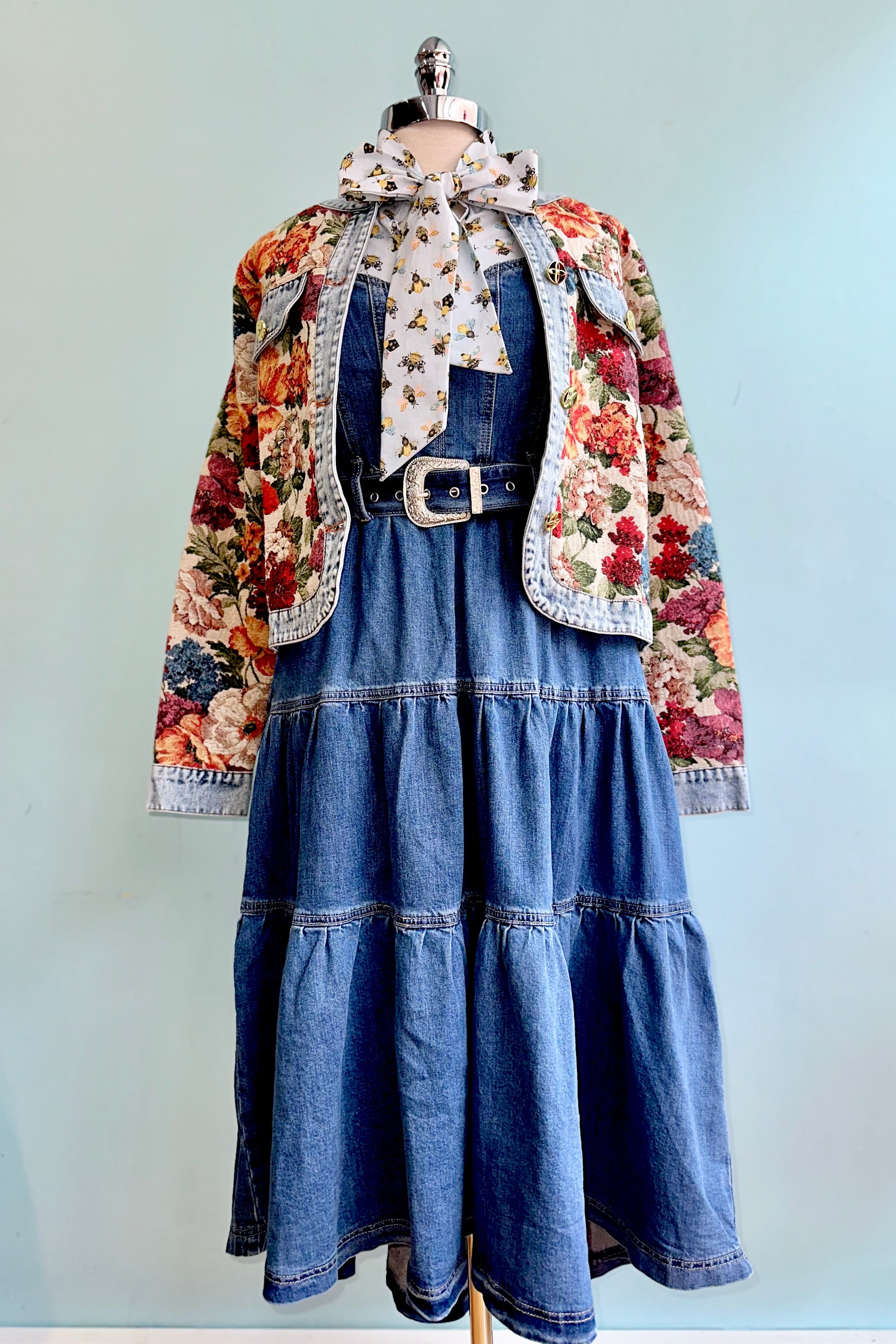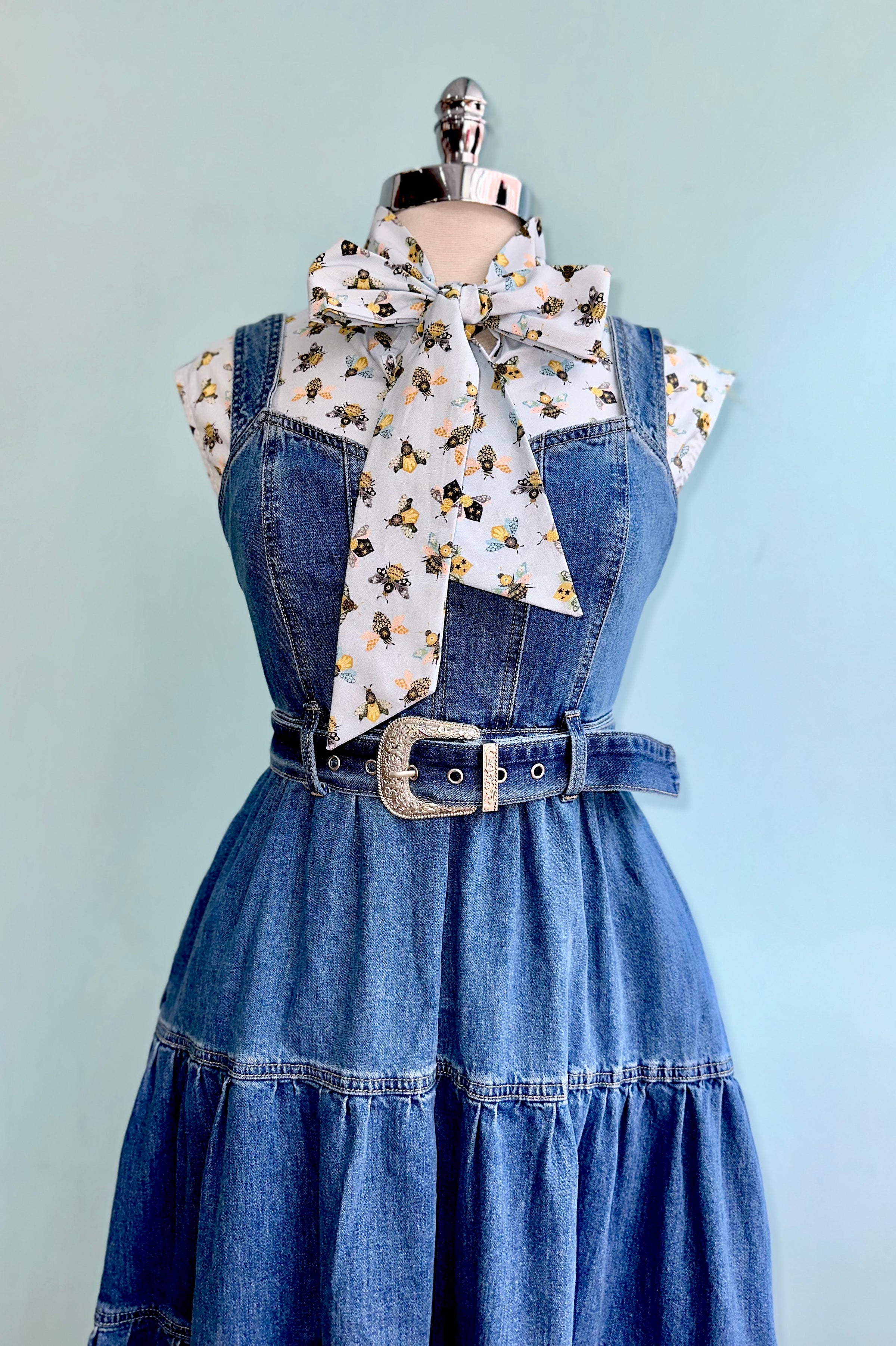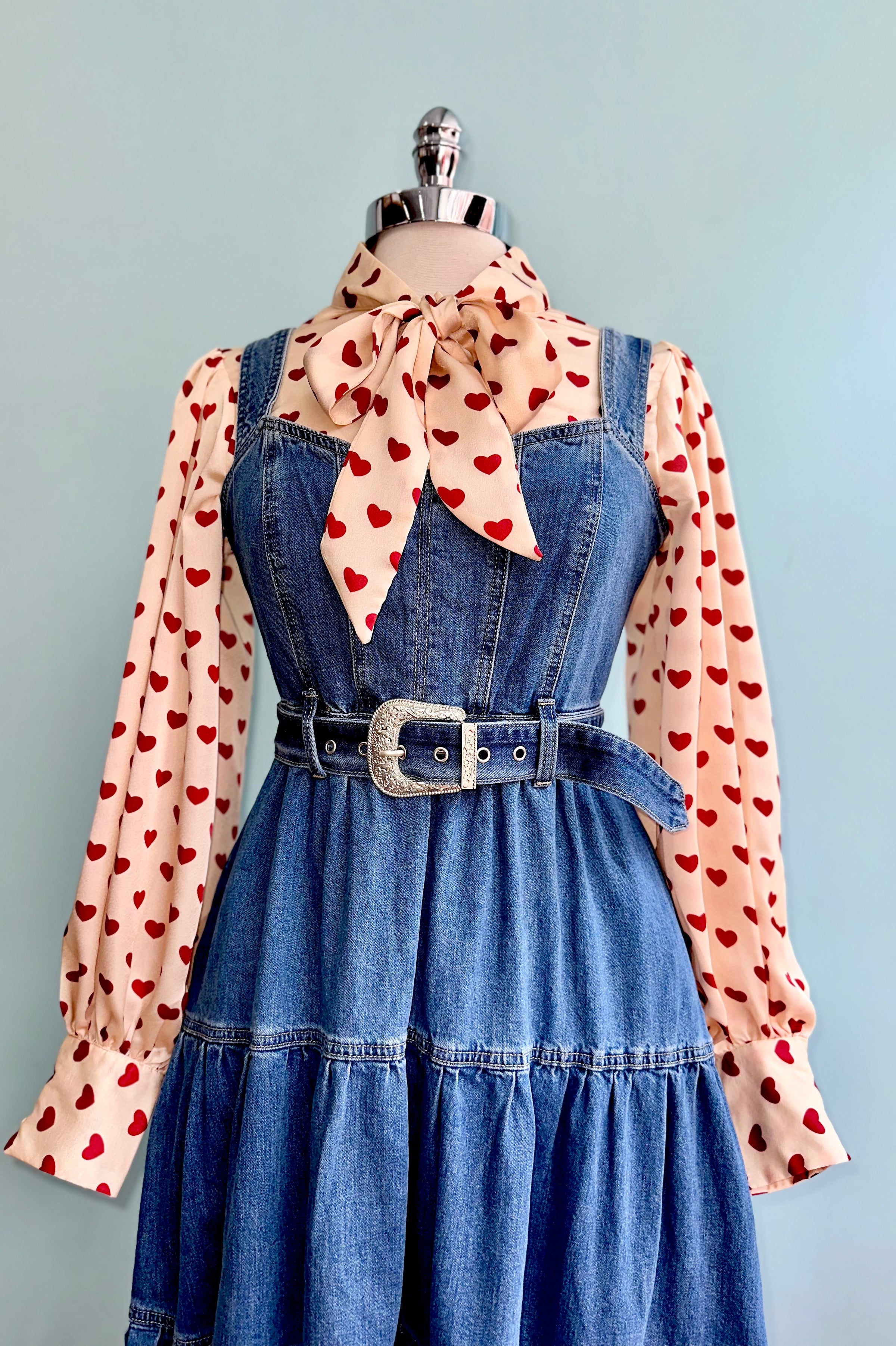 Washed denim dress with a structured yet comfortable drape and hi-low hem. This dress has a sweetheart neckline with wide straps. The skirt has side pickets and is is tiered with flowing panels create subtle volume and movement. The buckle belt is removable and western-inspired that cinches the waist for a defined silhouette. There is a smocked back panel and a back zip closure.
