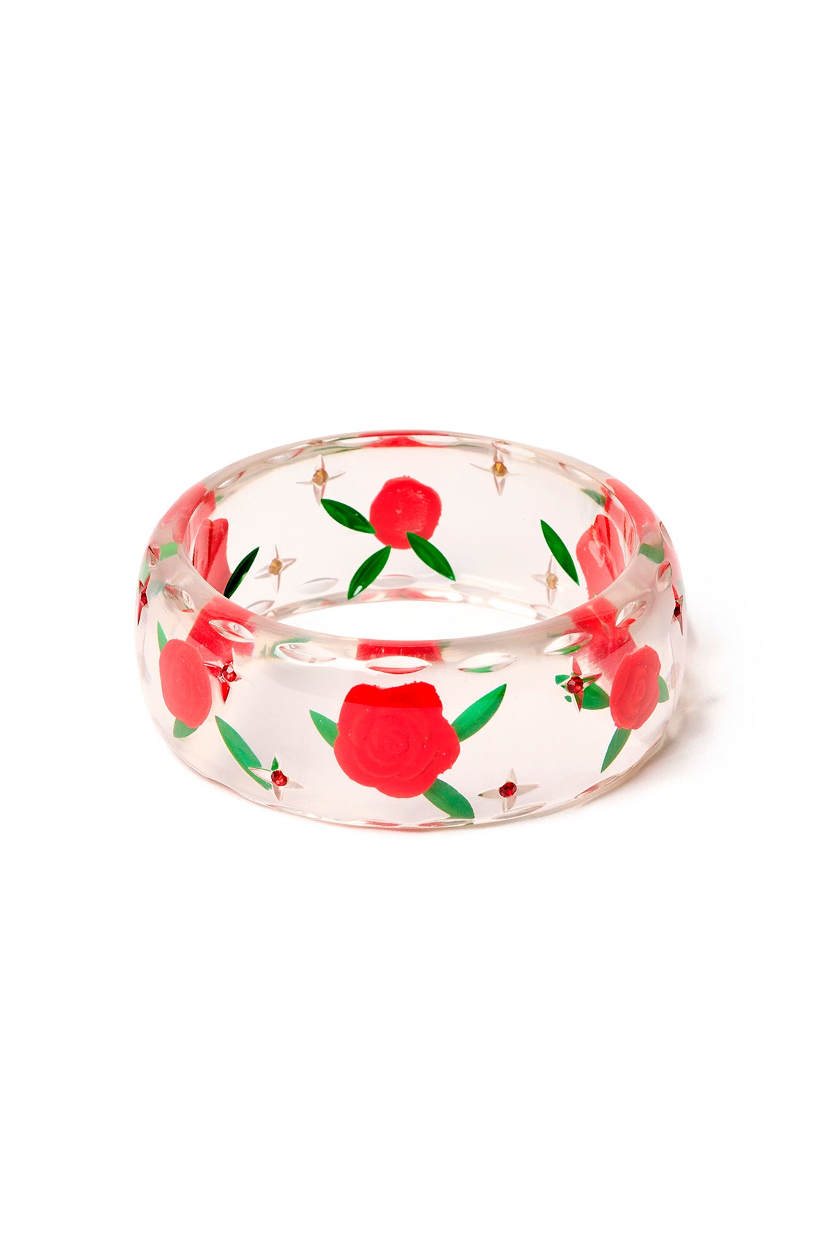 The Wide Lover’s Knot Bangle is all about classic romance with a vintage twist. Clear resin reveals a blooming red rose, complete with reverse carved leaves, coloured gems and delicately carved details. The scalloped edge adds an extra touch of elegance to this Valentine’s showstopper.