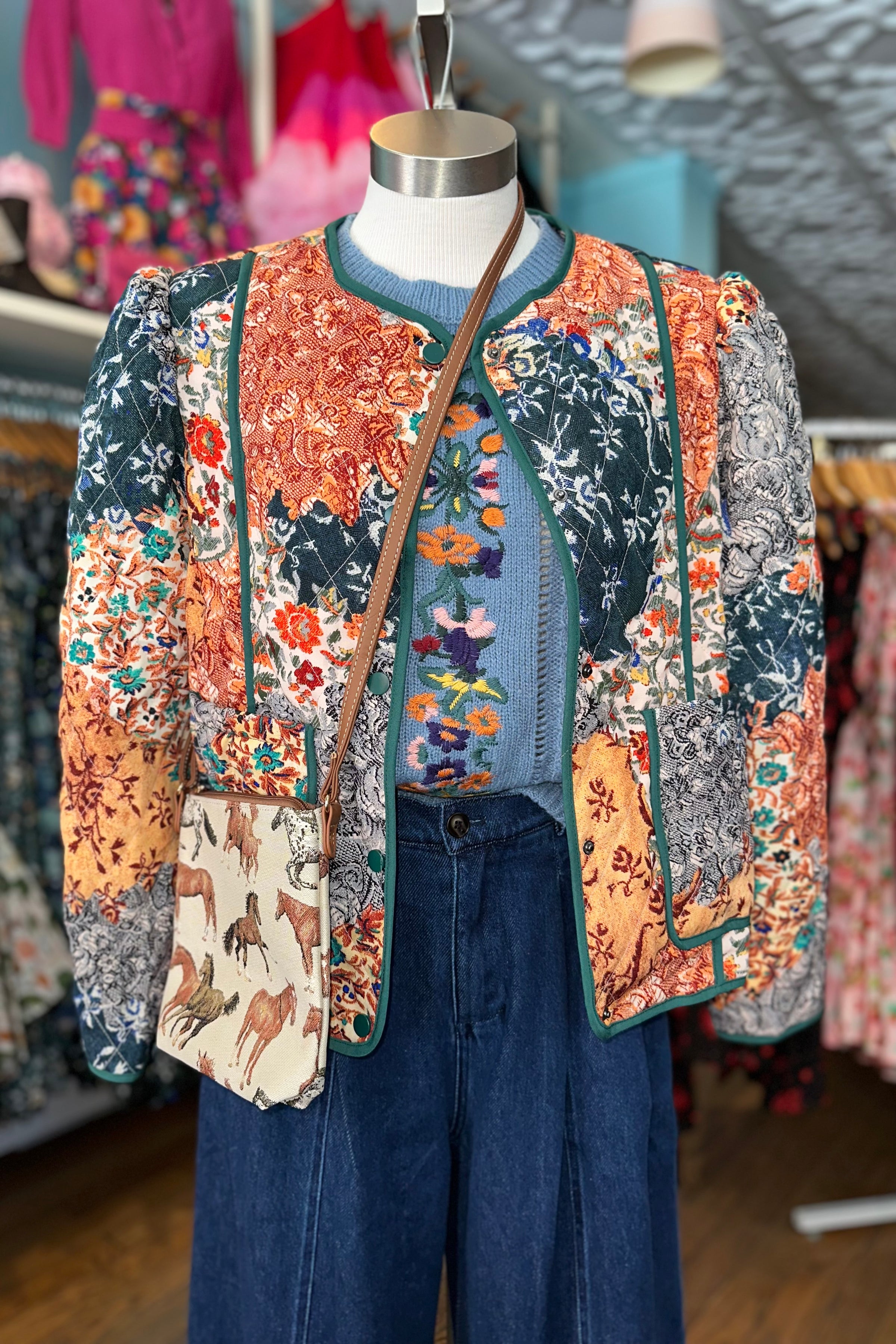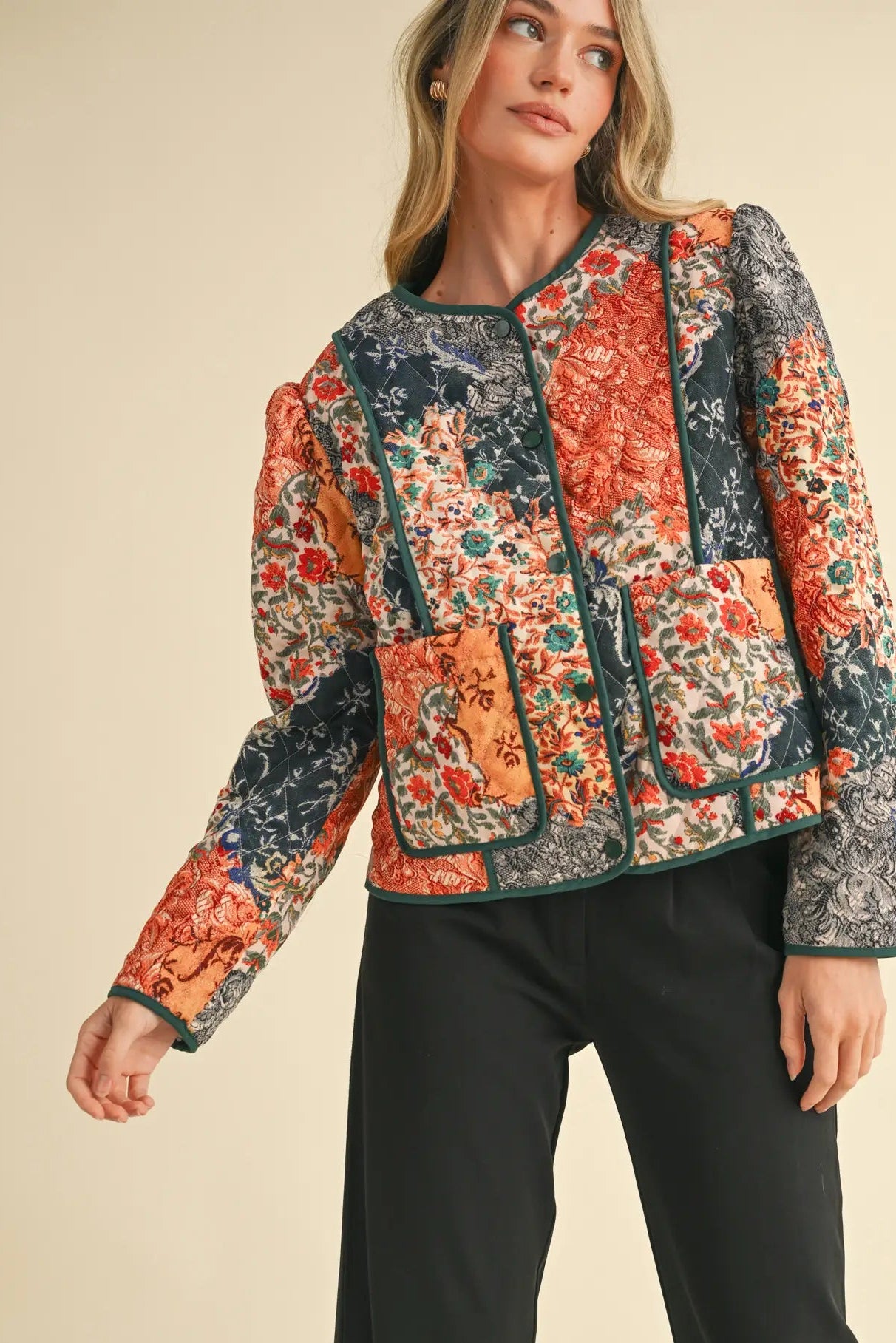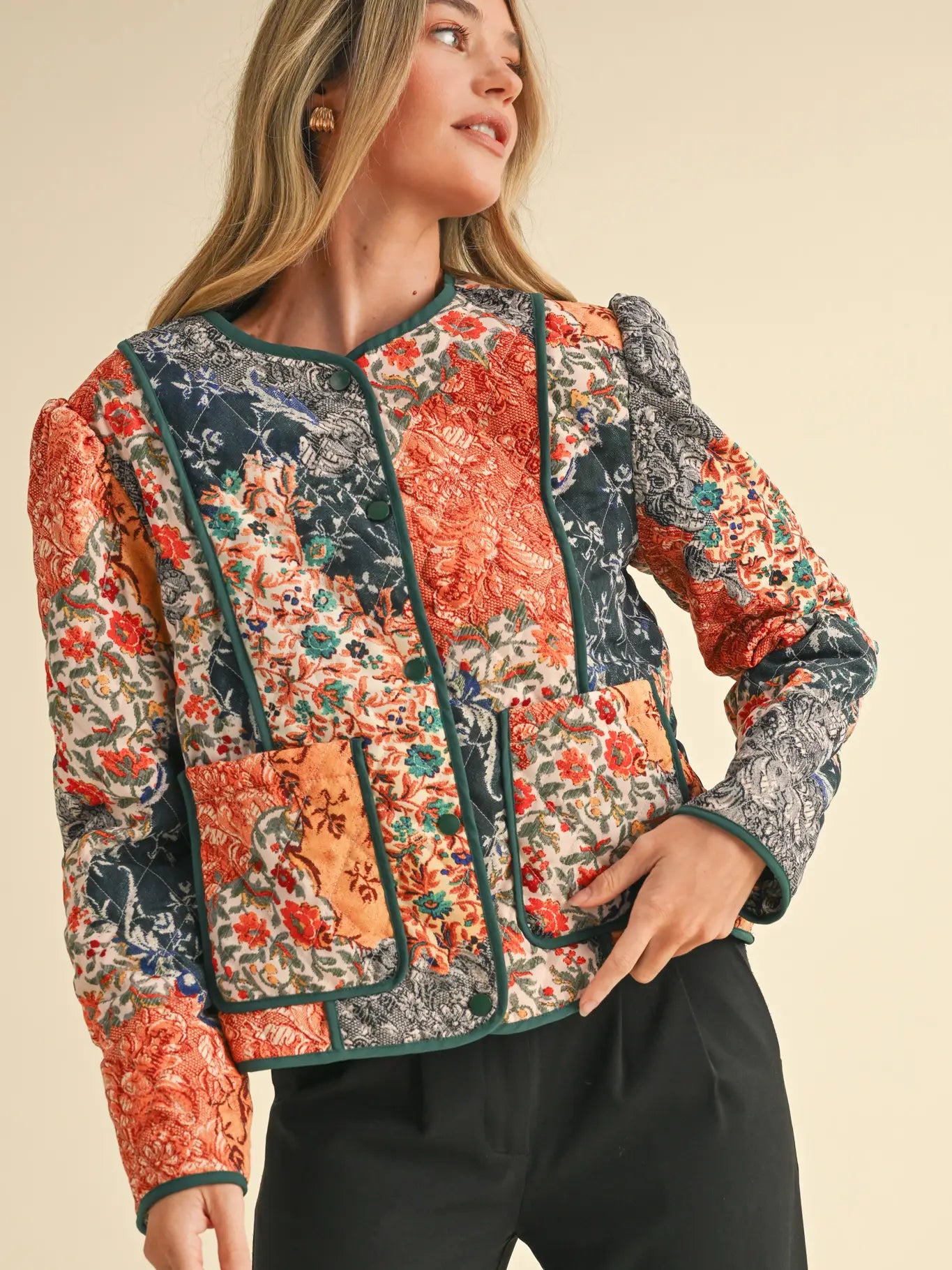 Quilted cropped jacket in navy and orange floral with green contrast piping.  This jacket has two front pockets. Buttons up the front with green snap closures. Great to be worn as a blazer or a lightweight fall jacket!