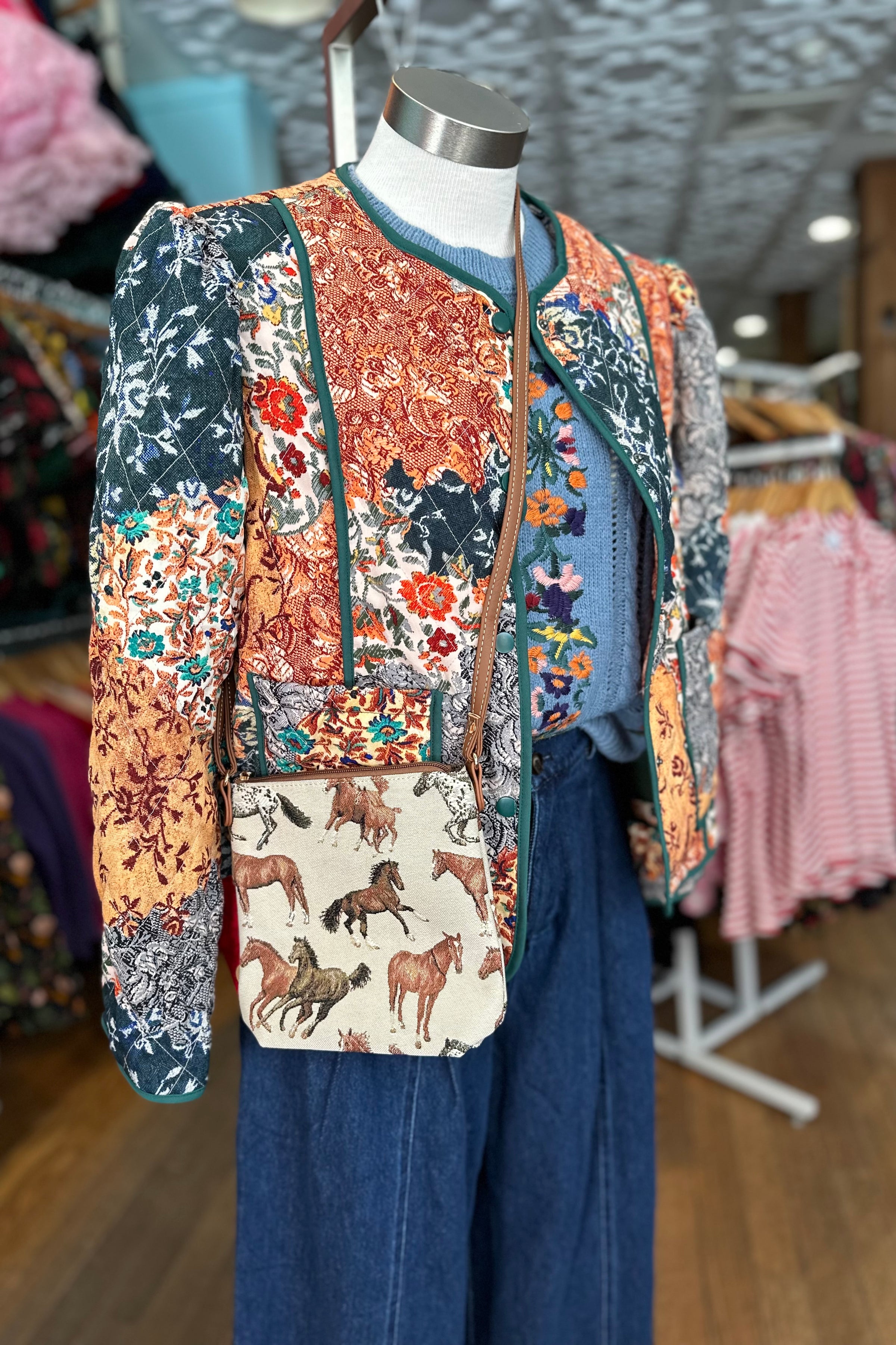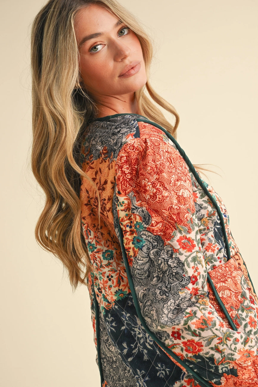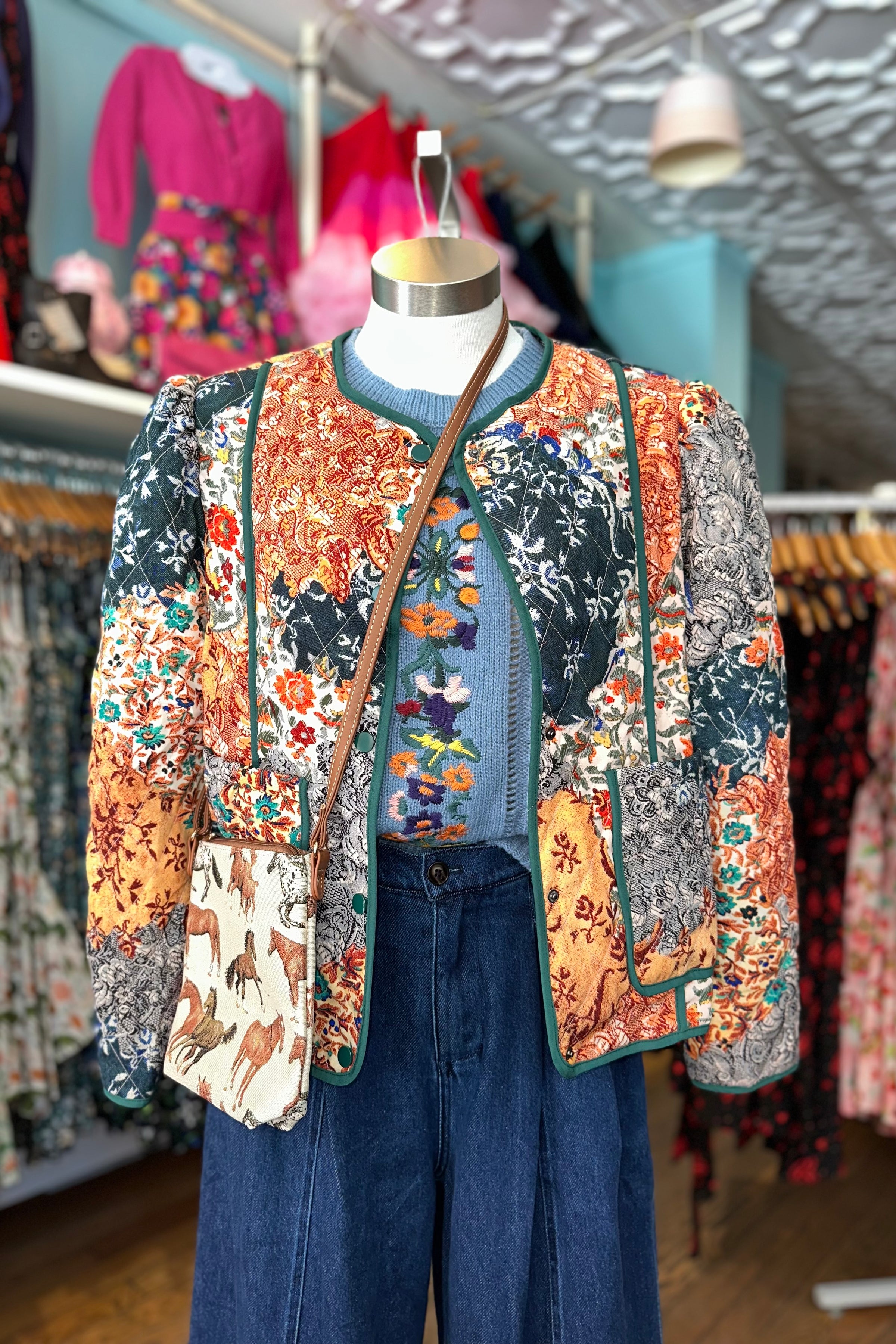 Quilted cropped jacket in navy and orange floral with green contrast piping.  This jacket has two front pockets. Buttons up the front with green snap closures. Great to be worn as a blazer or a lightweight fall jacket!