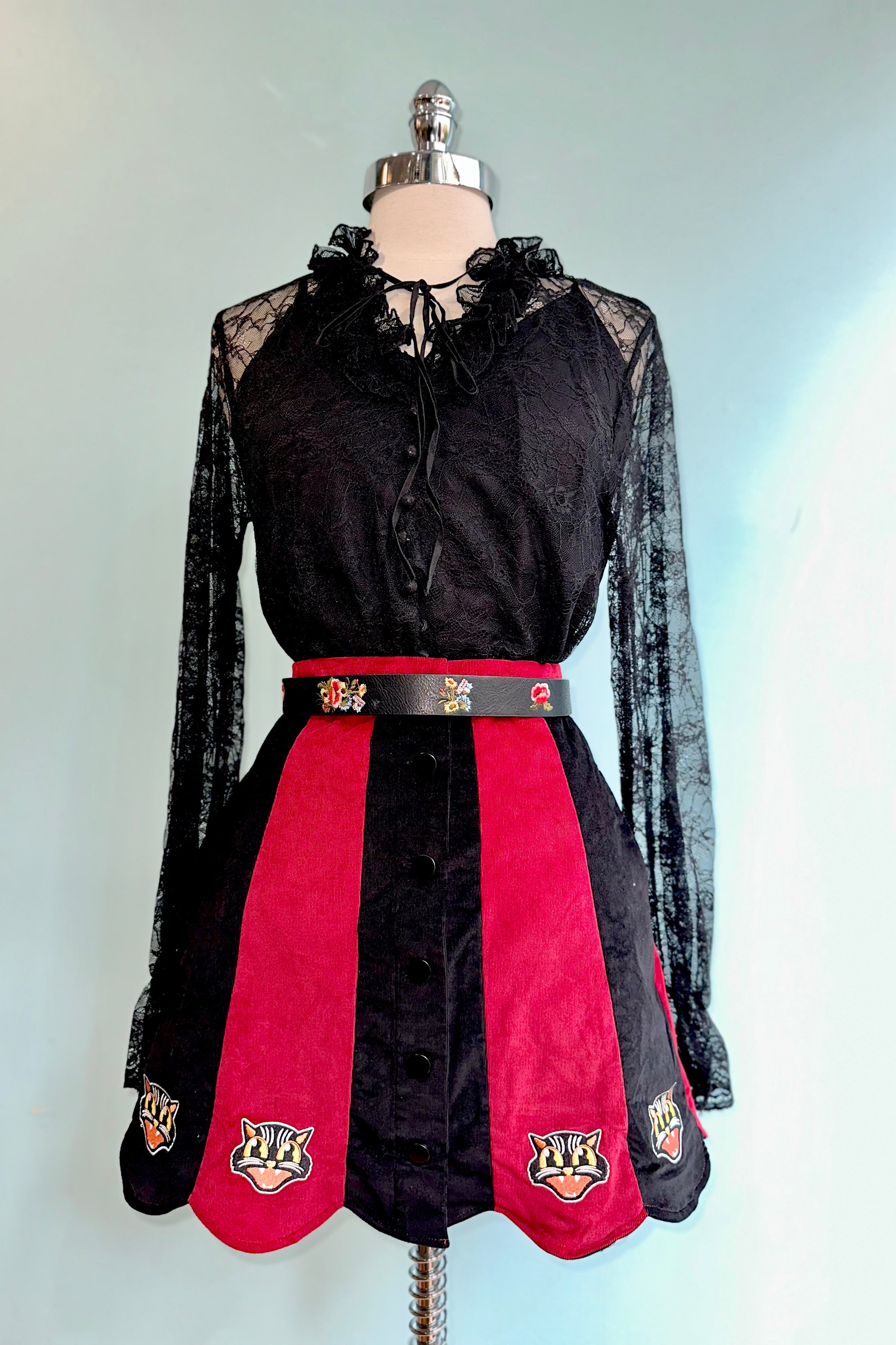A semi-sheer black lace tunic top with a V-neck and long sleeves. This top is lined with a removable camisole and has long balloon sleeves with elastic tightened cuffs. The bodice has a V-neckline, enhanced with a scalloped lace band and a ribbon tie to tie on the neckline.