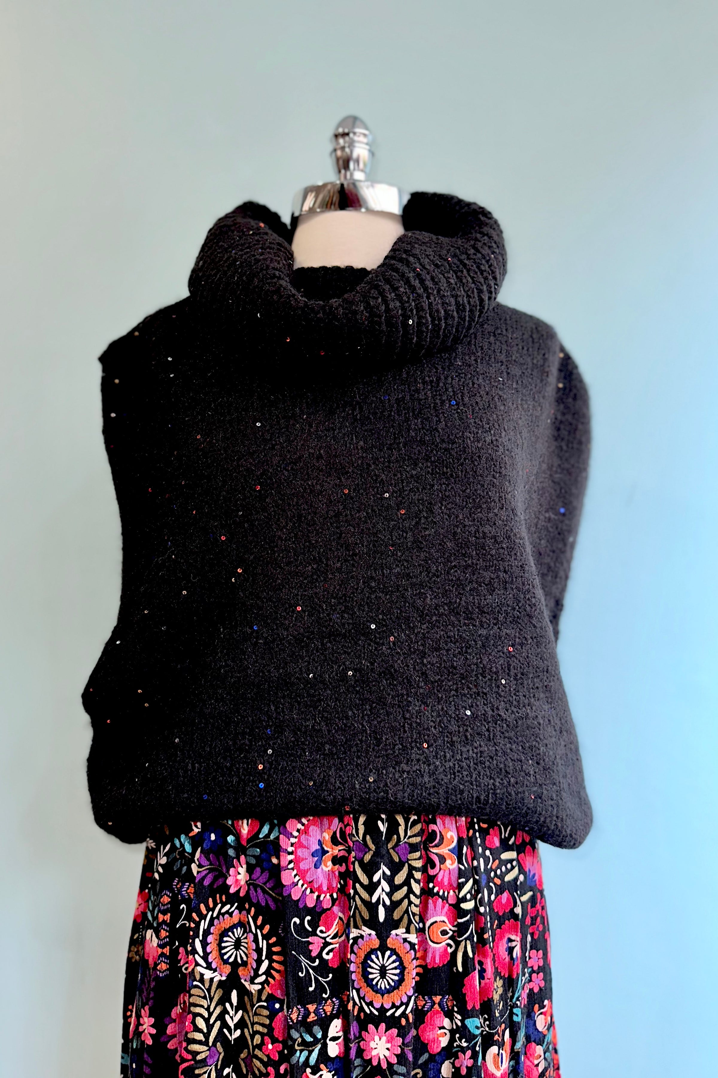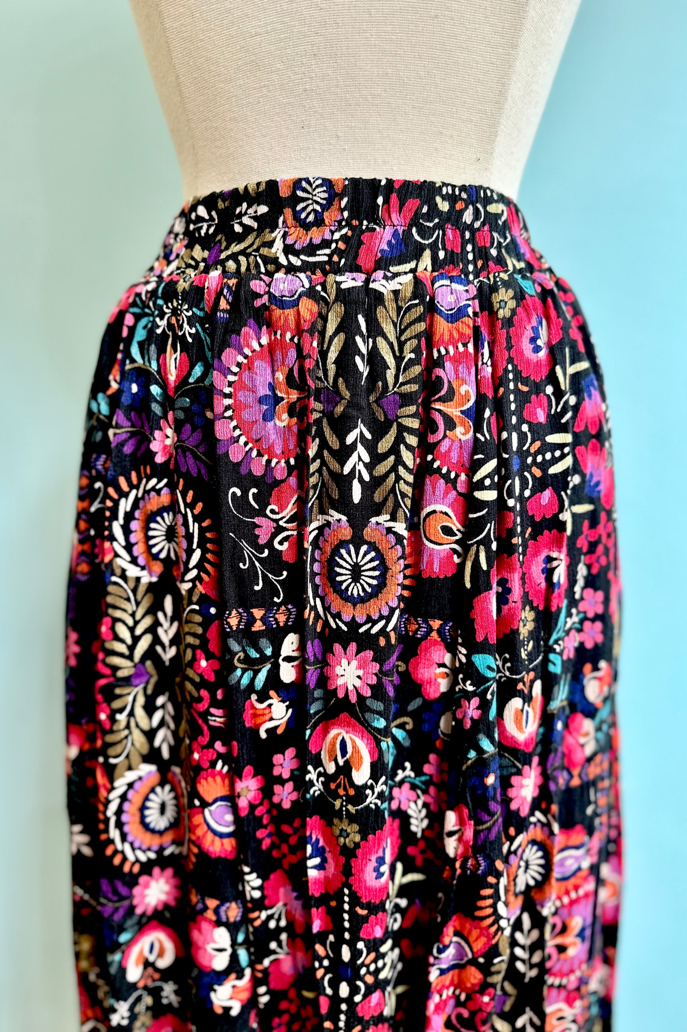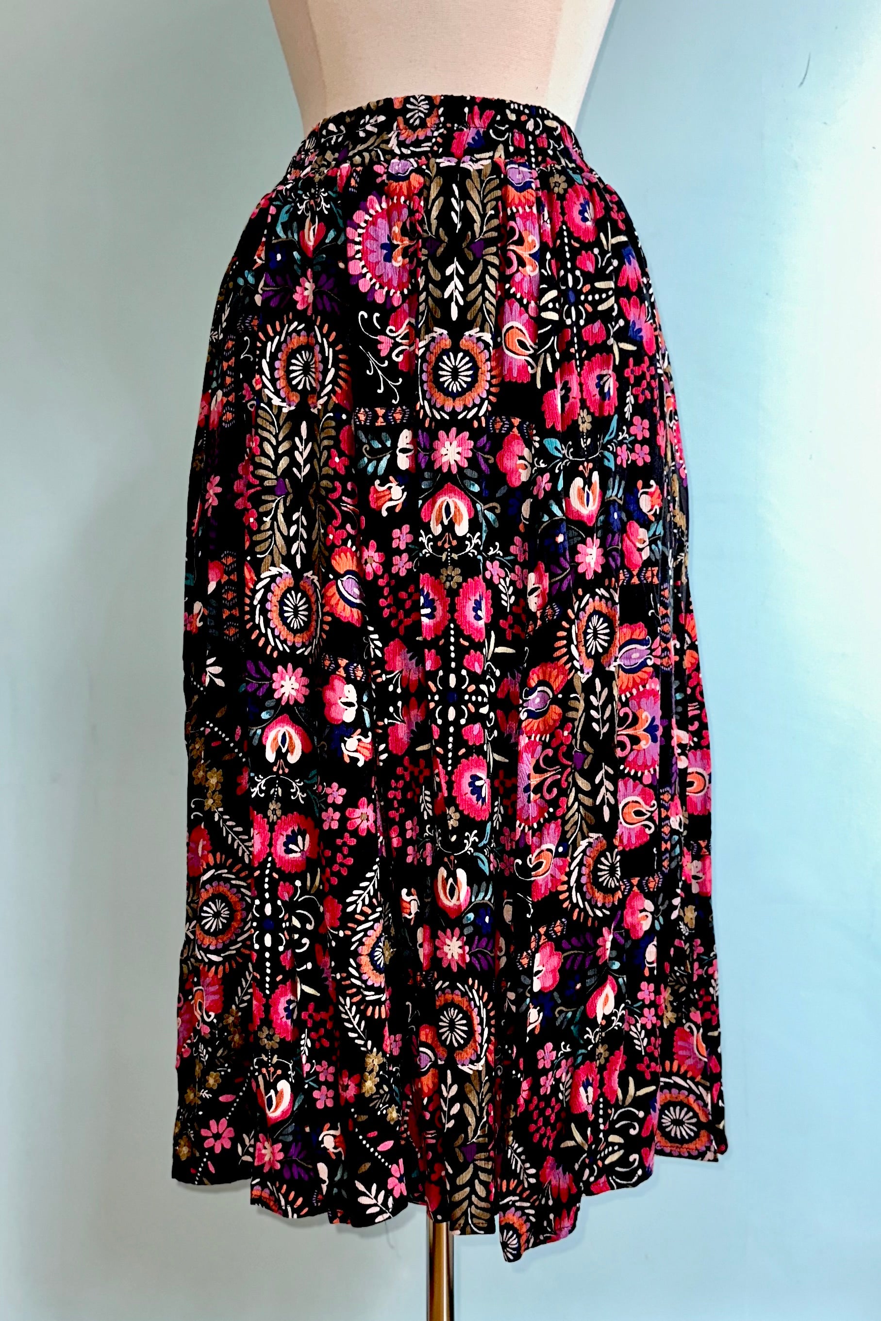Folk floral print midi skirt with a black background.  This skirt is pleated with an elastic waist.