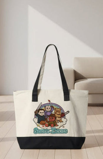 Tote bag in ivory canvas with a navy bottom and straps. There is a main large compartment with a zipper closure and a small back zip pocket.