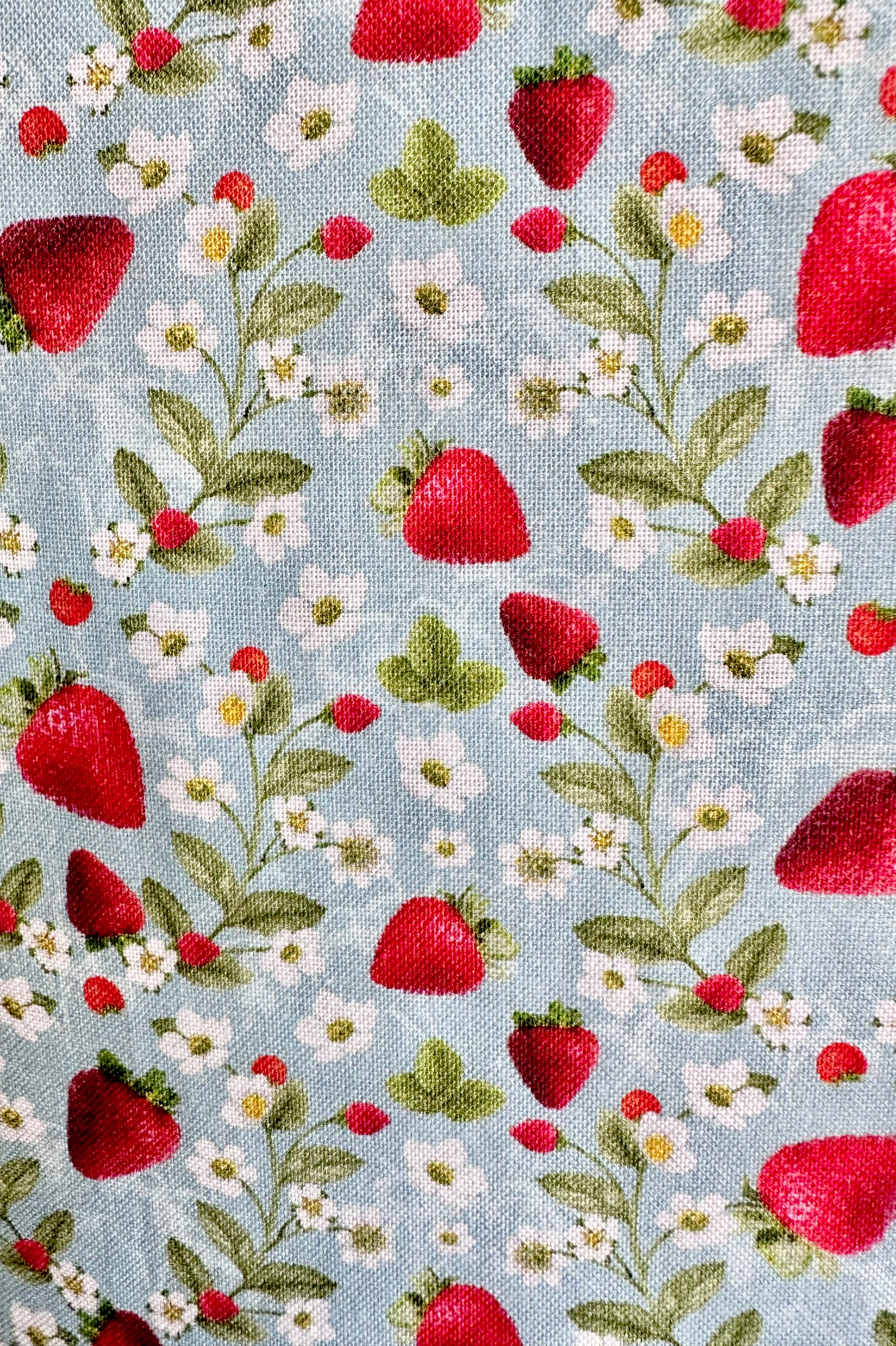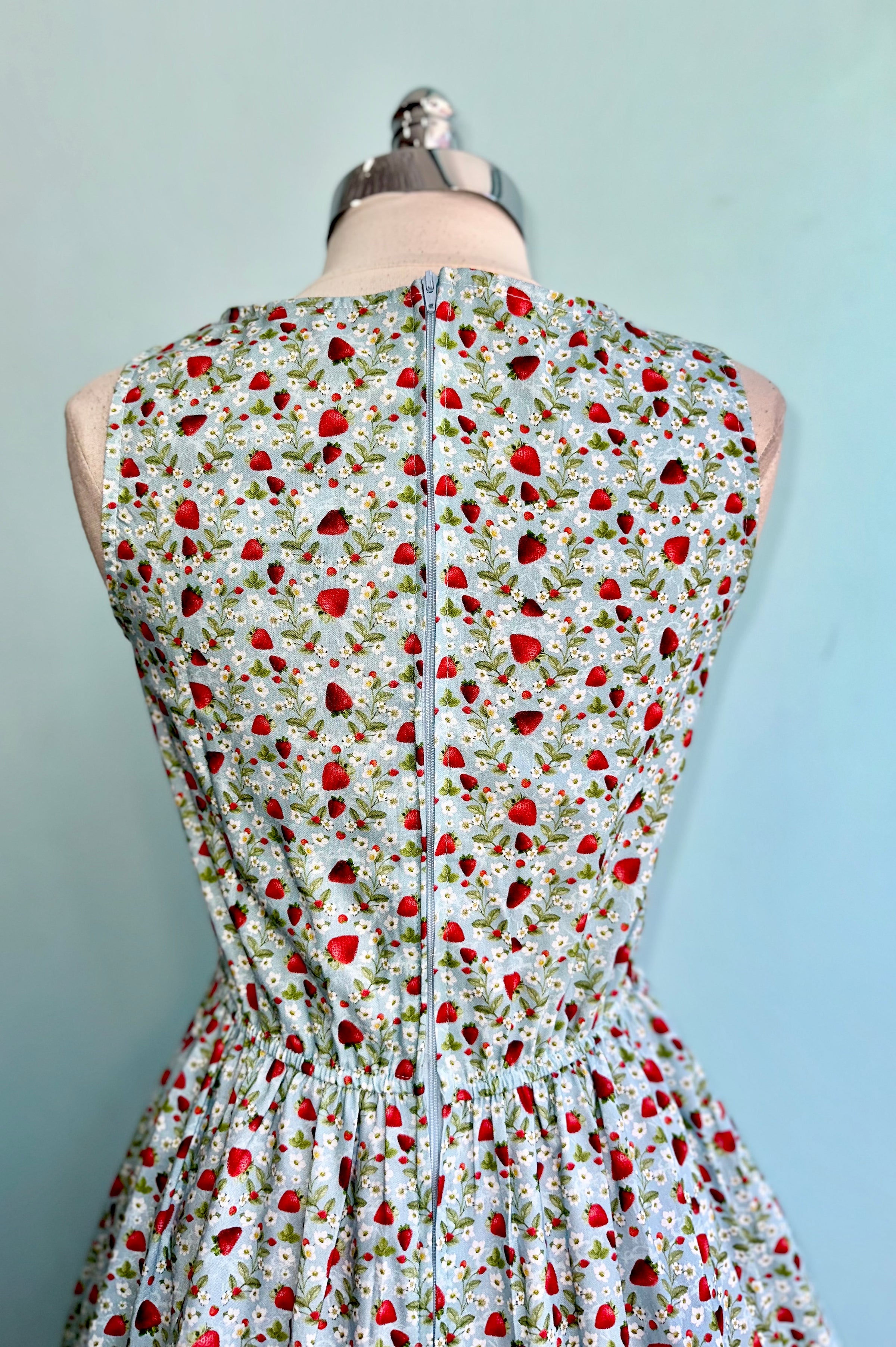 Light blue dress with a print of strawberries and their white flowers with green stems. Made of 100% cotton and a great layering piece! The back waist is elastic for added comfort. Pockets on the side and zips up the back!