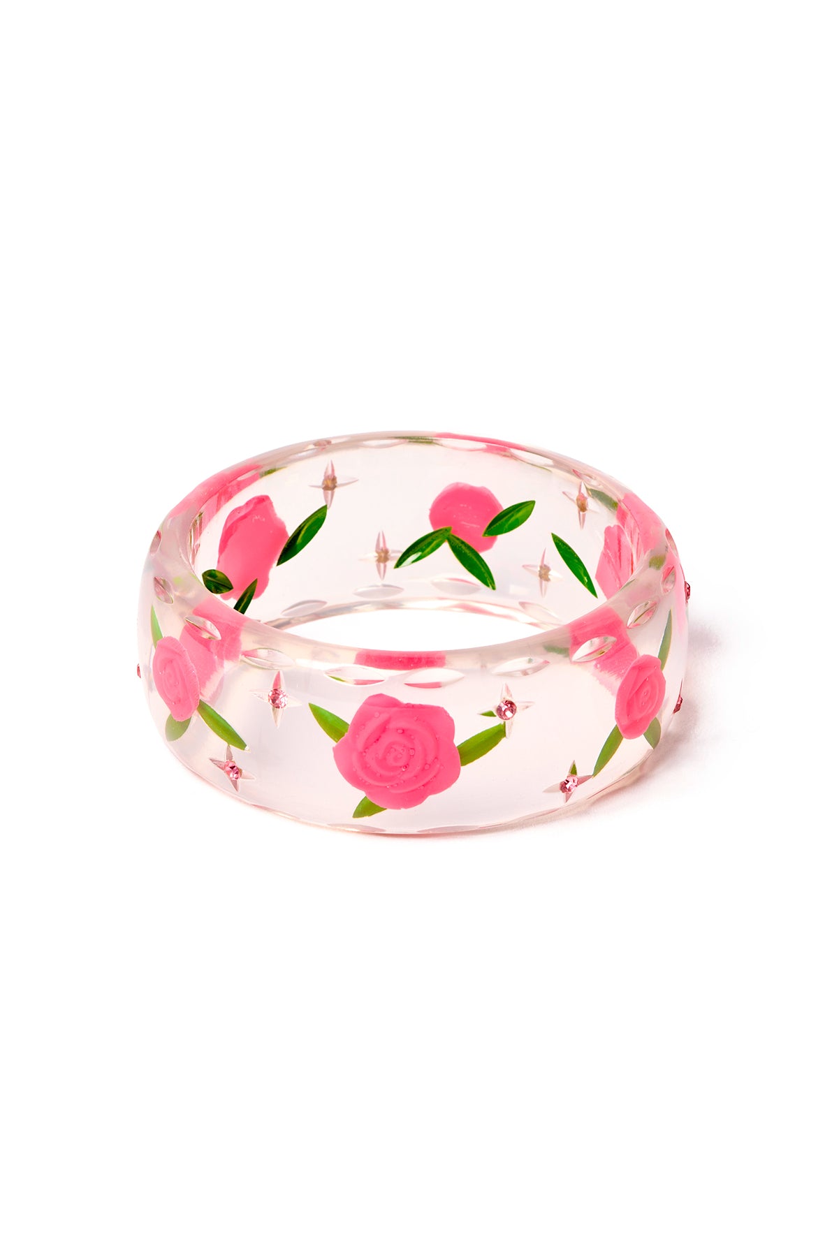 The Wide Sweet Juliet Bangle is full of floral romance, featuring carved detailing, reverse leaves, and a blooming pink inlaid rose. With glittering gems embedded in the clear resin, it's a statement piece for anyone who loves vintage style.