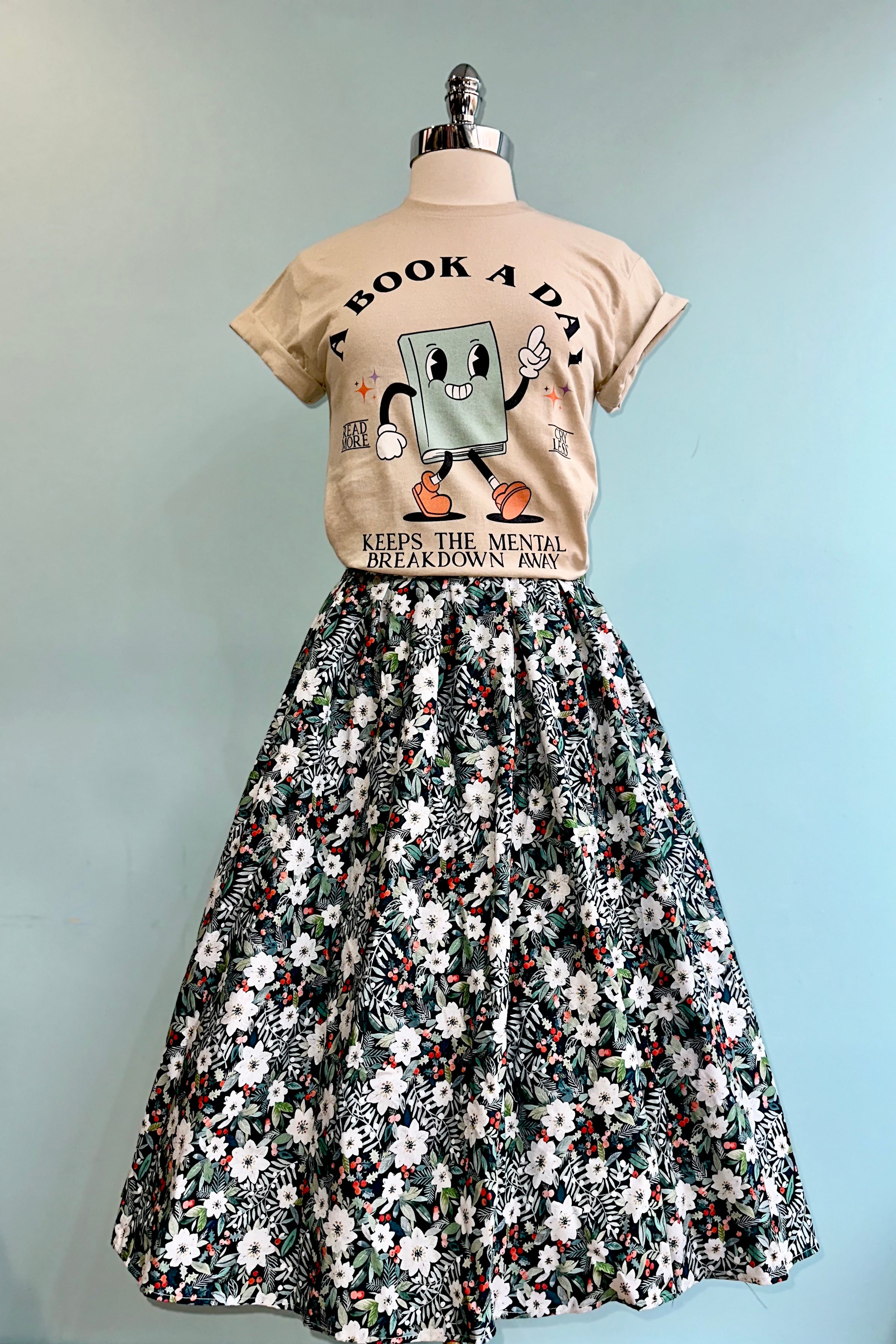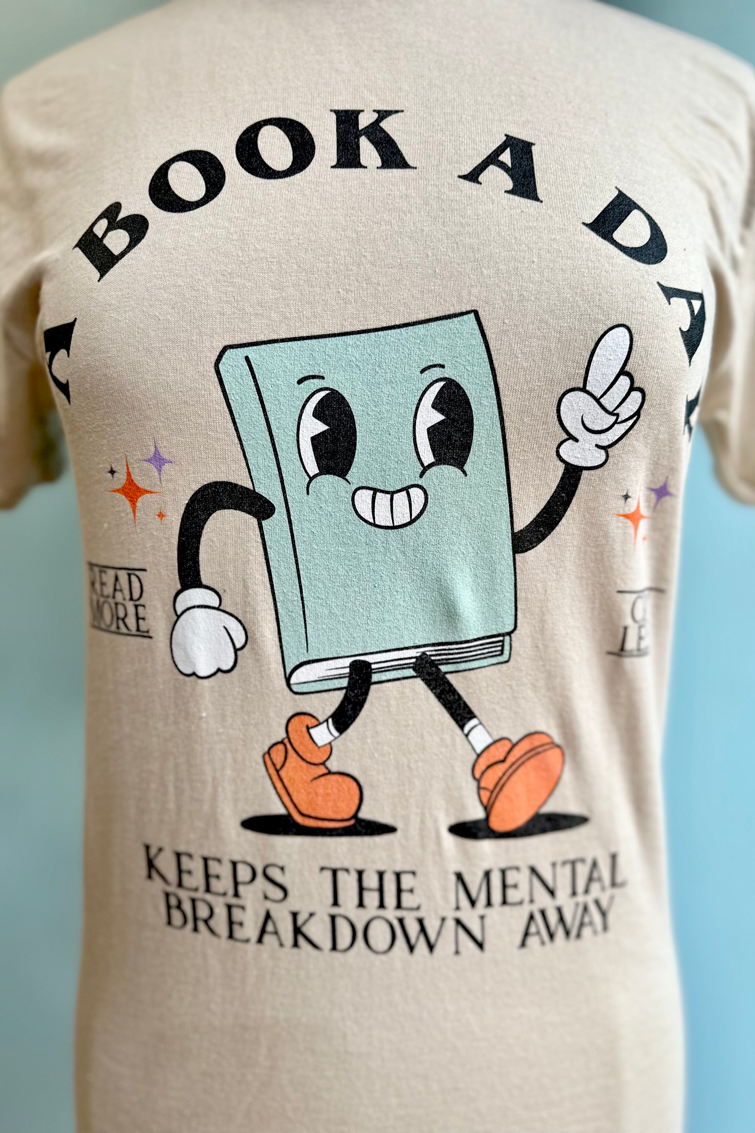 An off white t-shirt featuring an adorable walking book with the words, "A book a day keeps the mental breakdown away." This design is a perfect gift for book lovers. The tee is crafted from soft, breathable cotton for all-day comfort.
