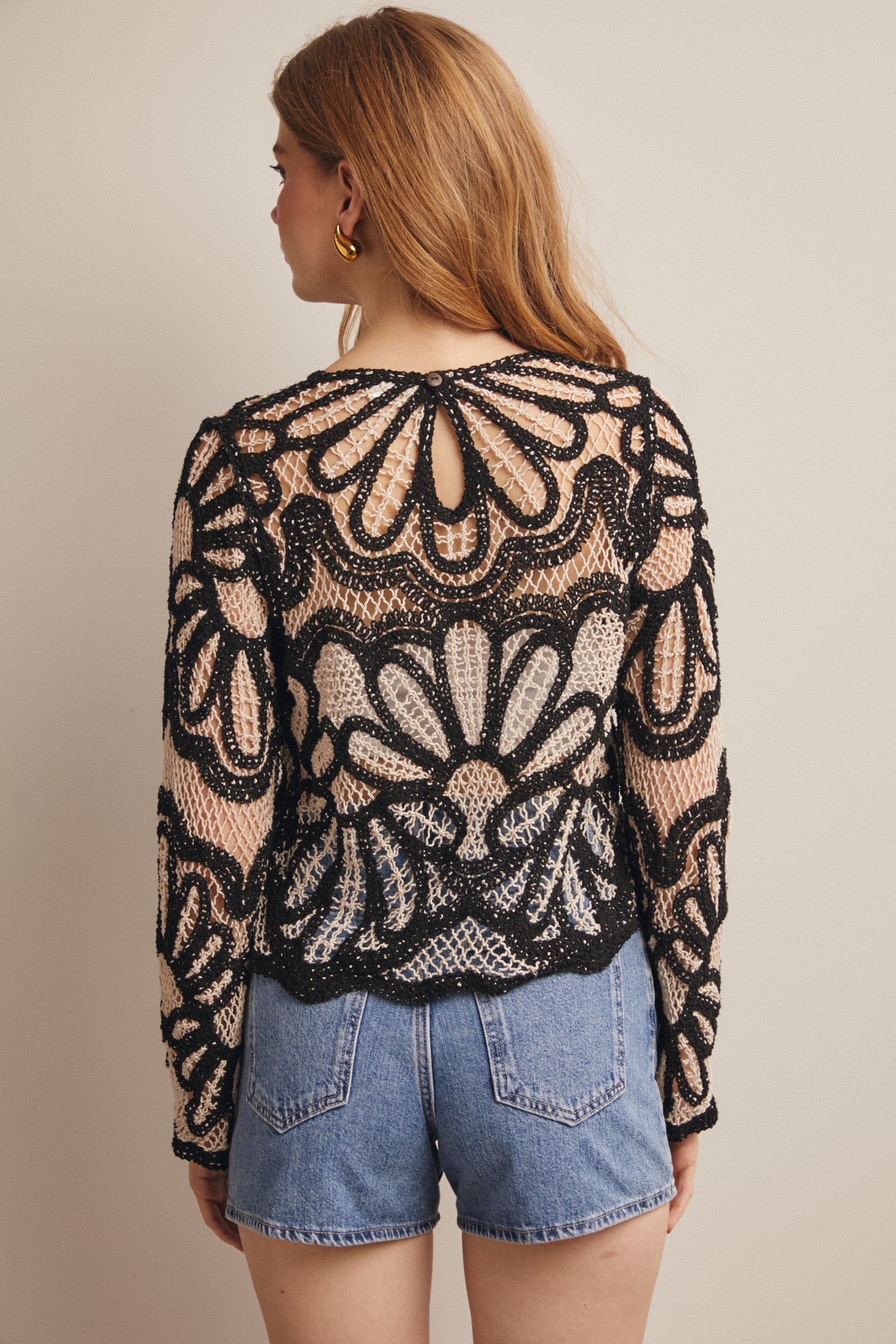 Black and white flower crocheted sweater with long bell sleeves.  This sweater has a keyhole fastener at the back neck and a scalloped hem.  There is some give to the knit not as much as a sweater.