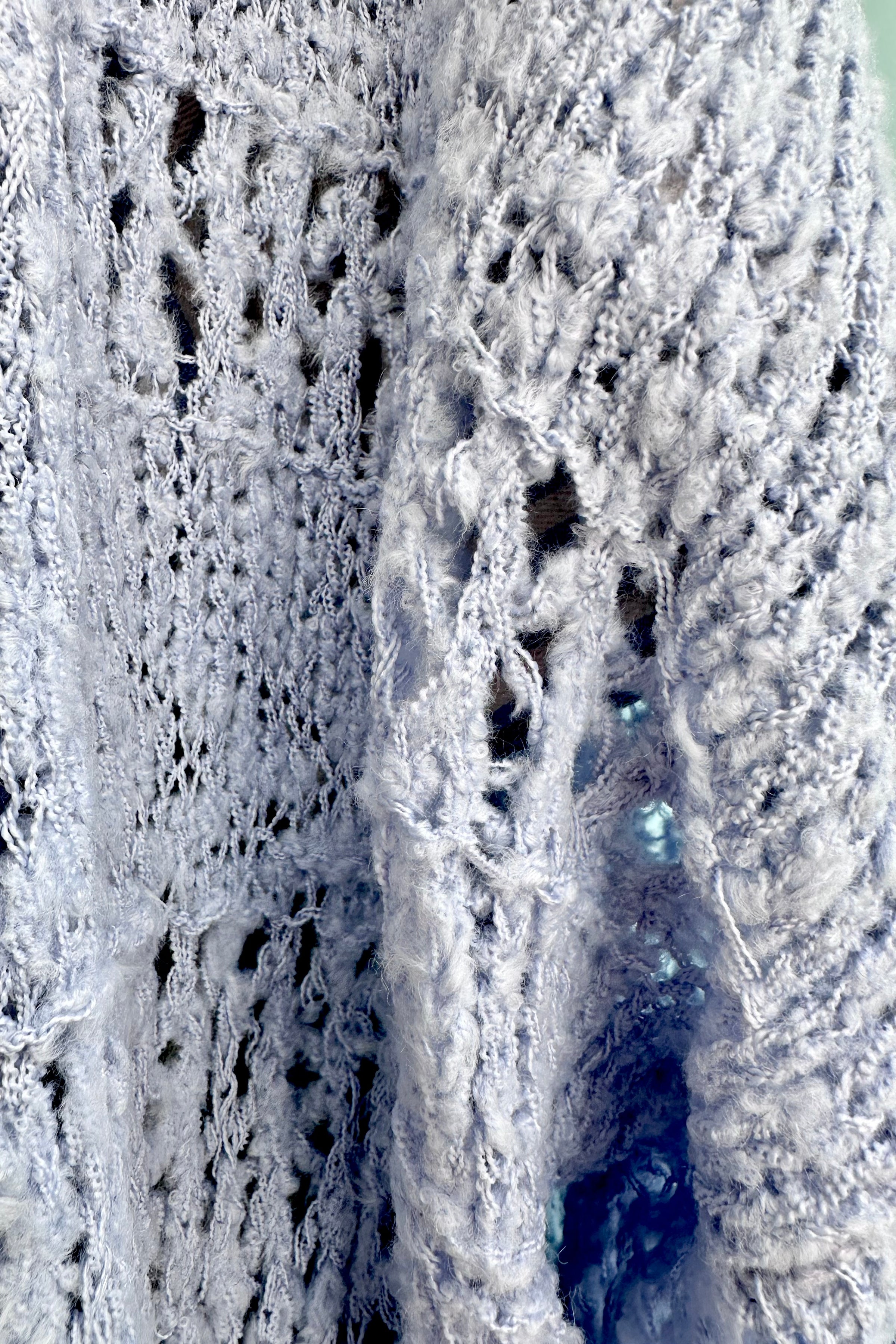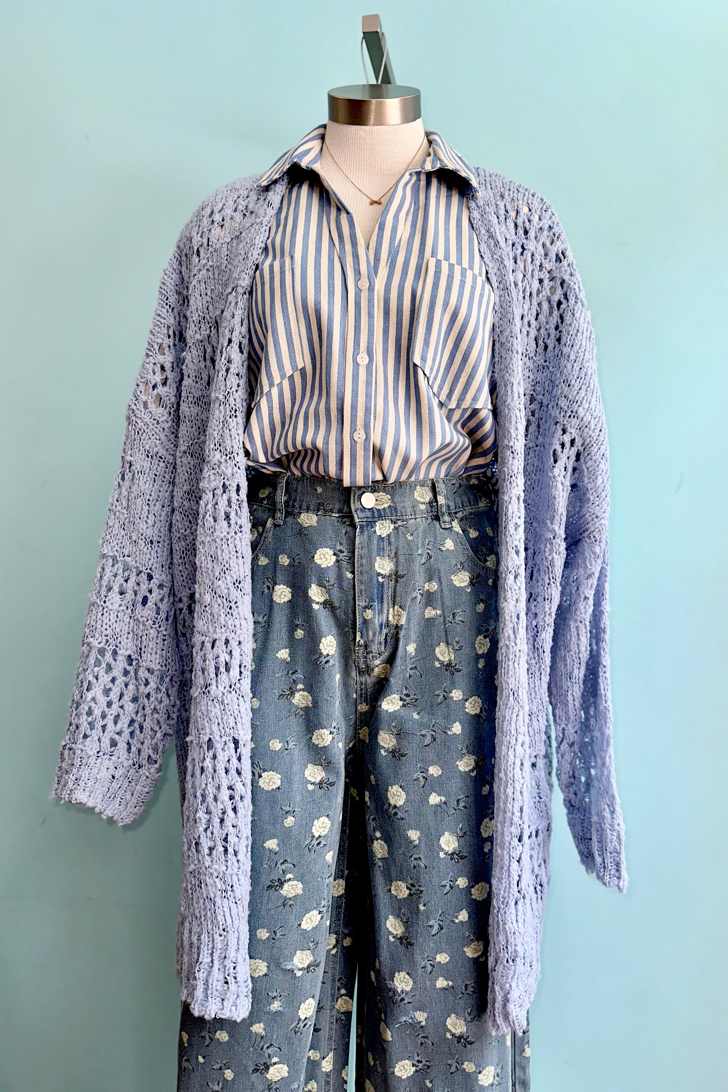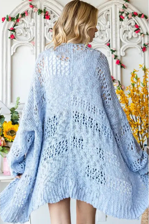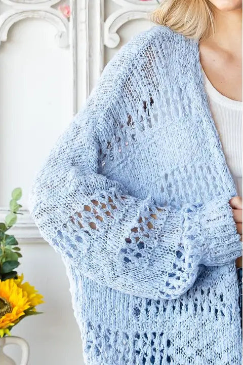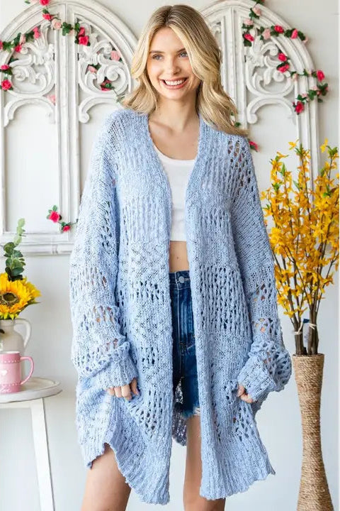A midi length open light blue crocheted cardigan.  The fit is oversized and super comfortable! We suggest going with your usual size or sizing down for a more fitted look.