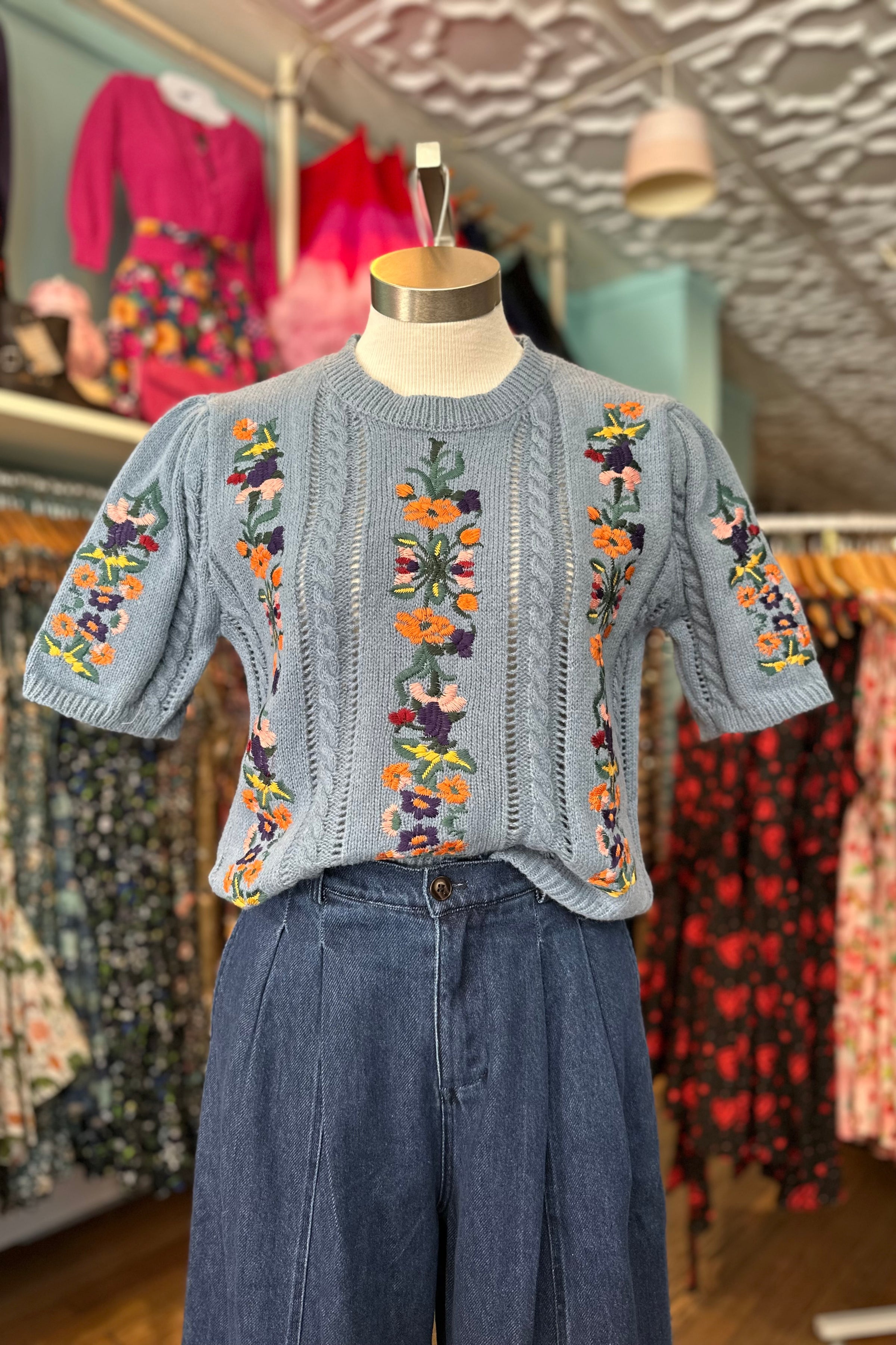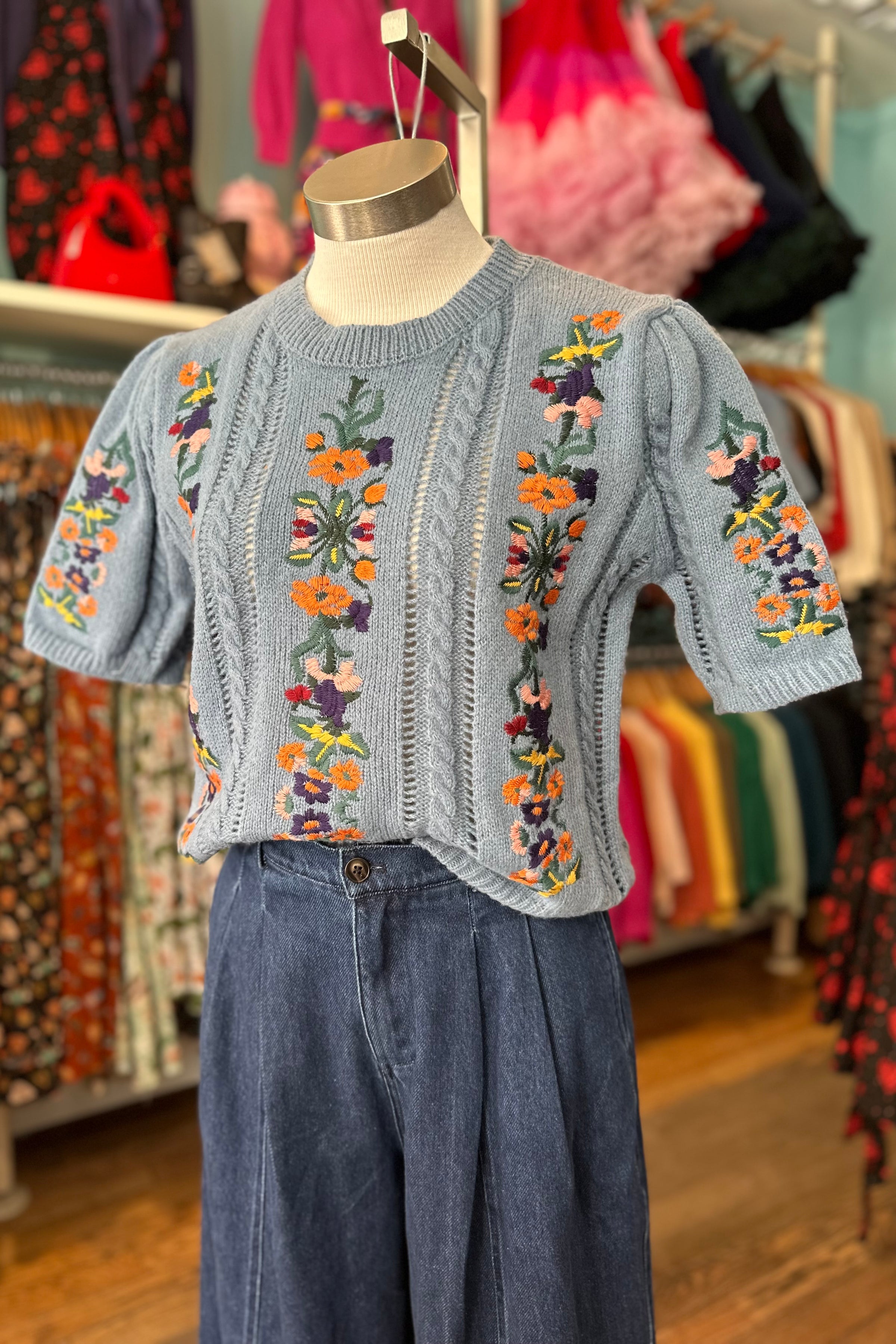Blue rounded neck sweater with vertical embroidered flower vines. The sweater has full, elbow length puff sleeves. There is a good amount of stretch to the fabric.