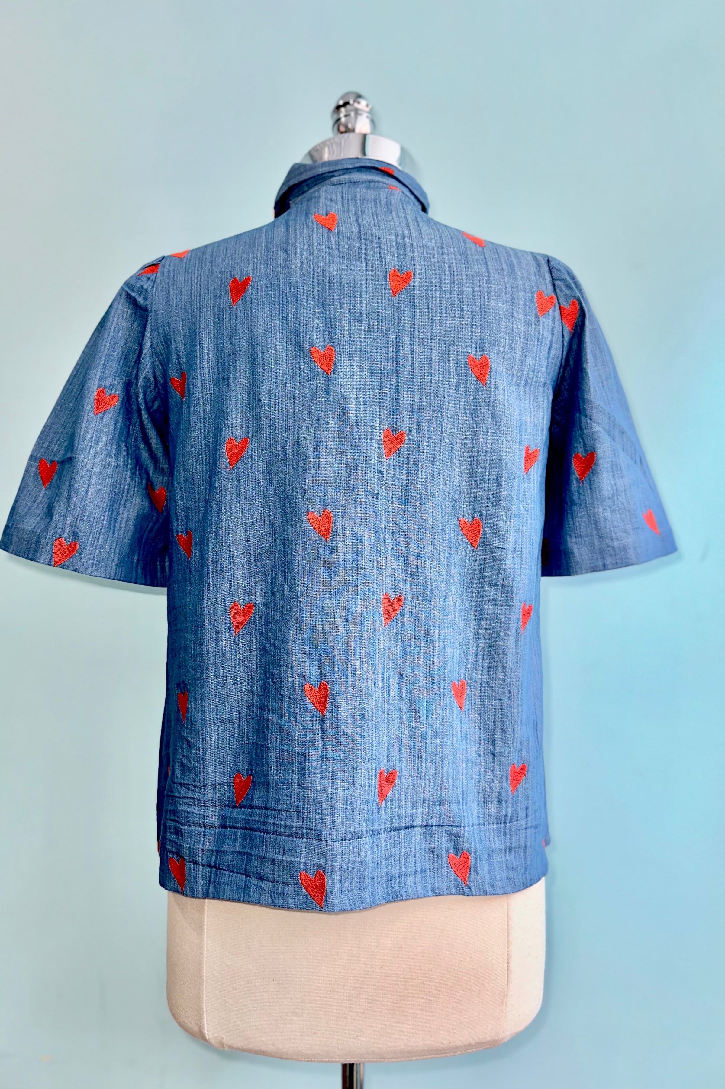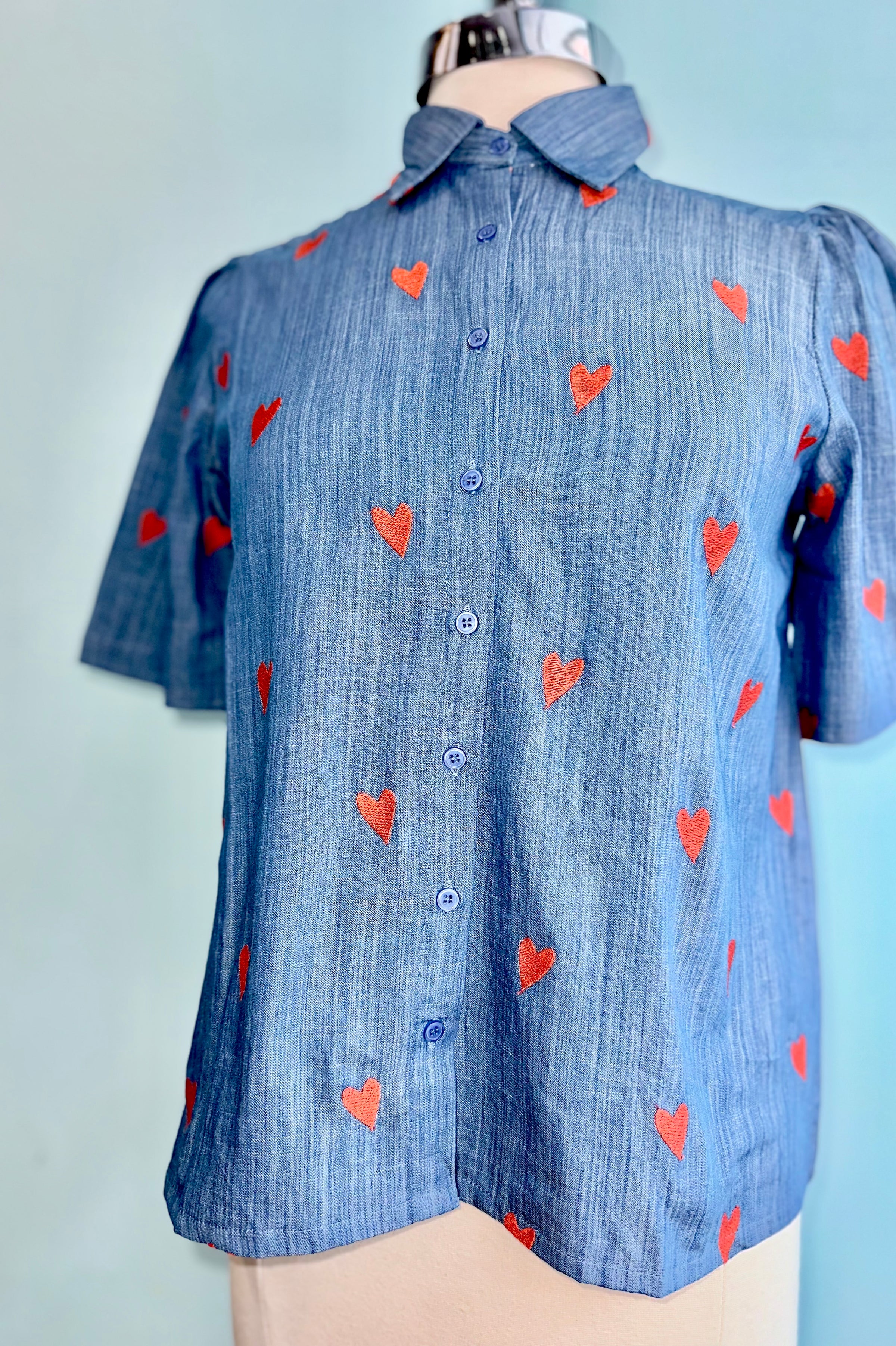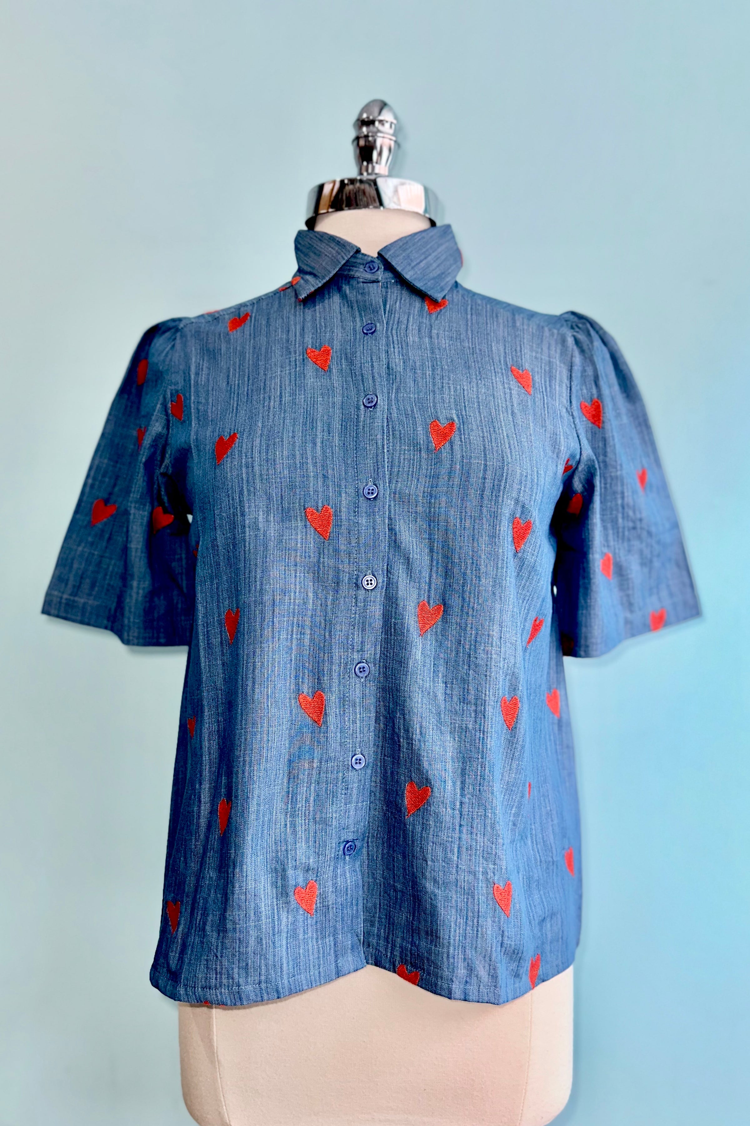 A blue shortsleeve blouse with a print of red hearts. This top has a collar and buttons up the front. It is unlined and does not have stretch.