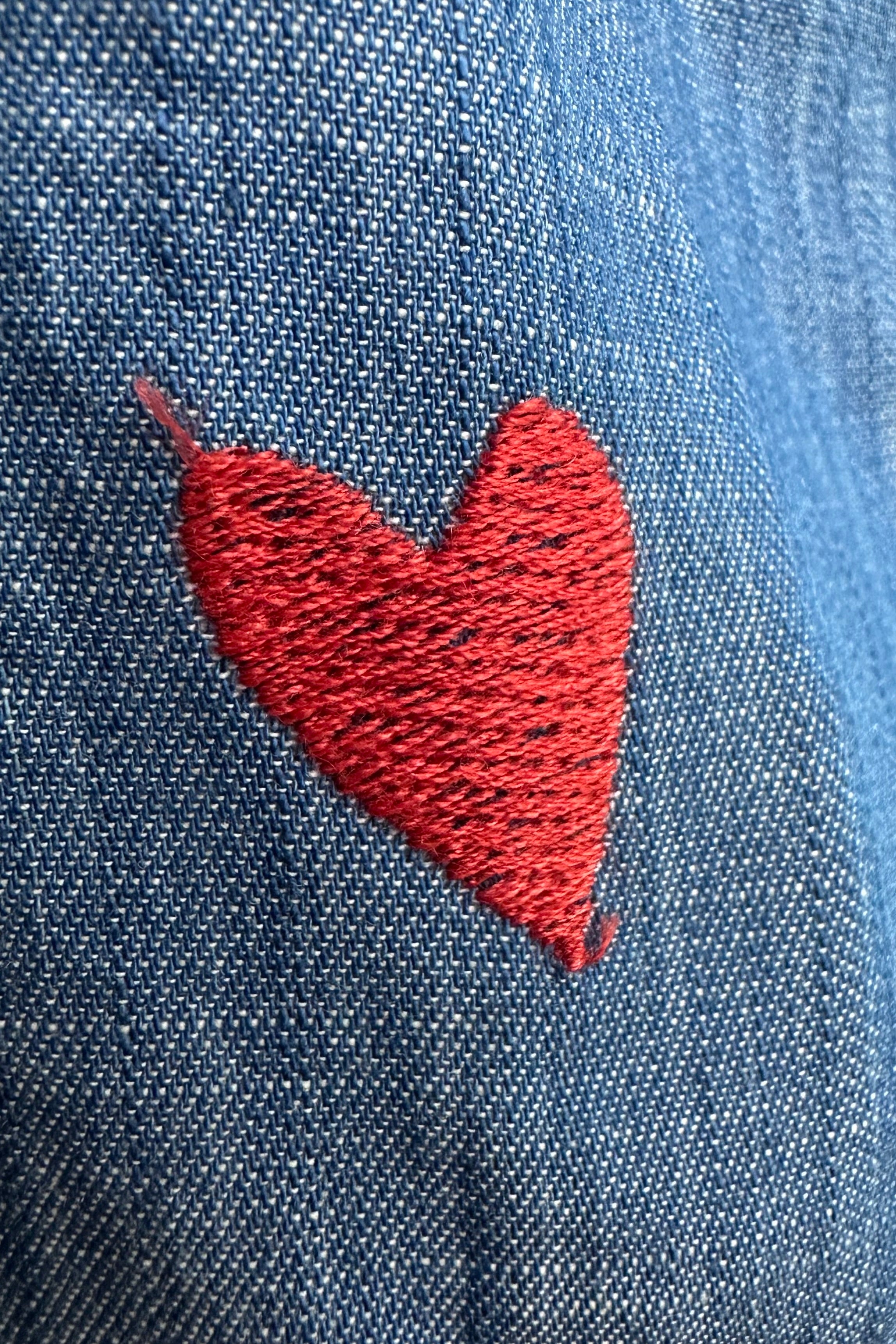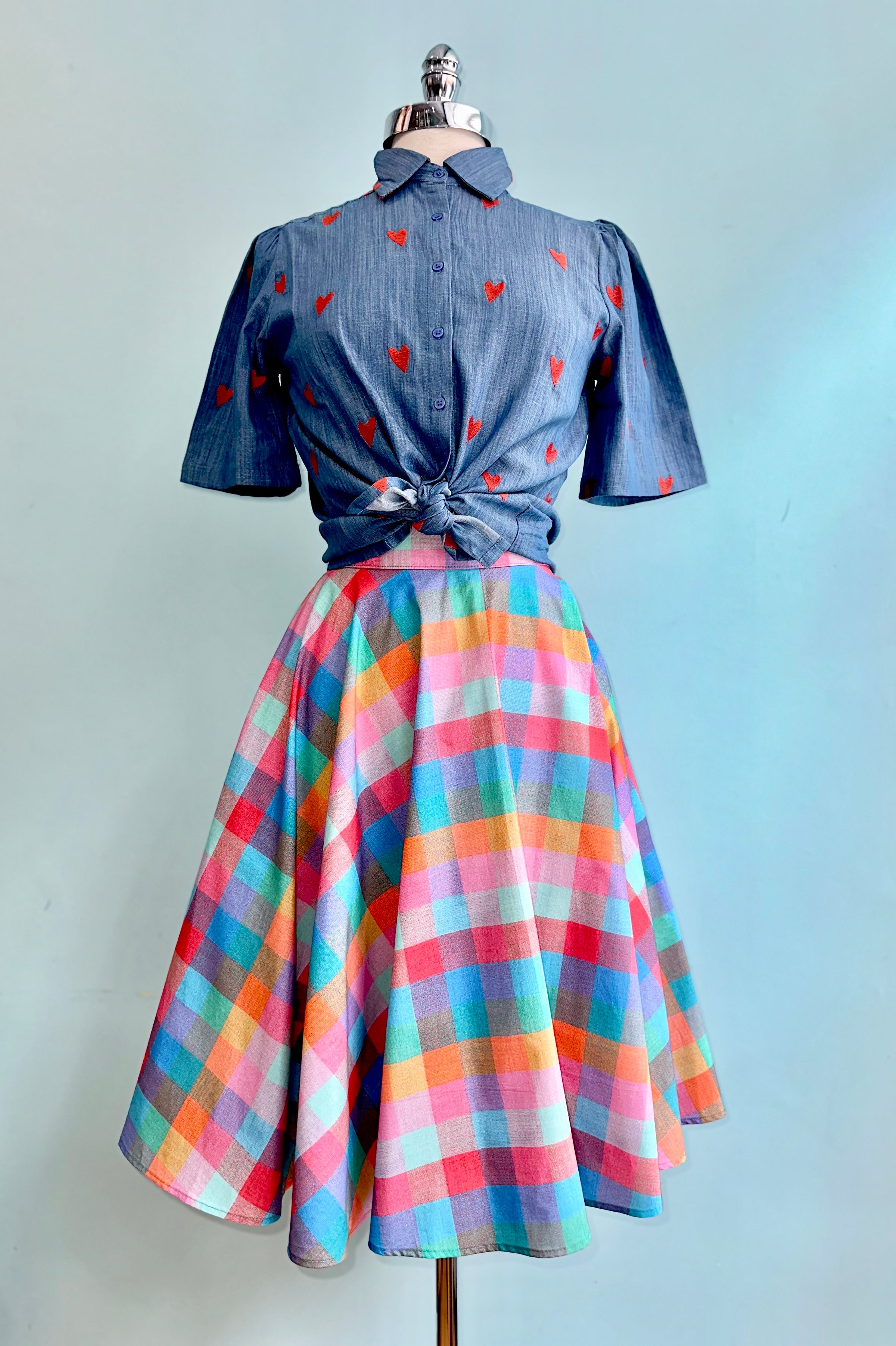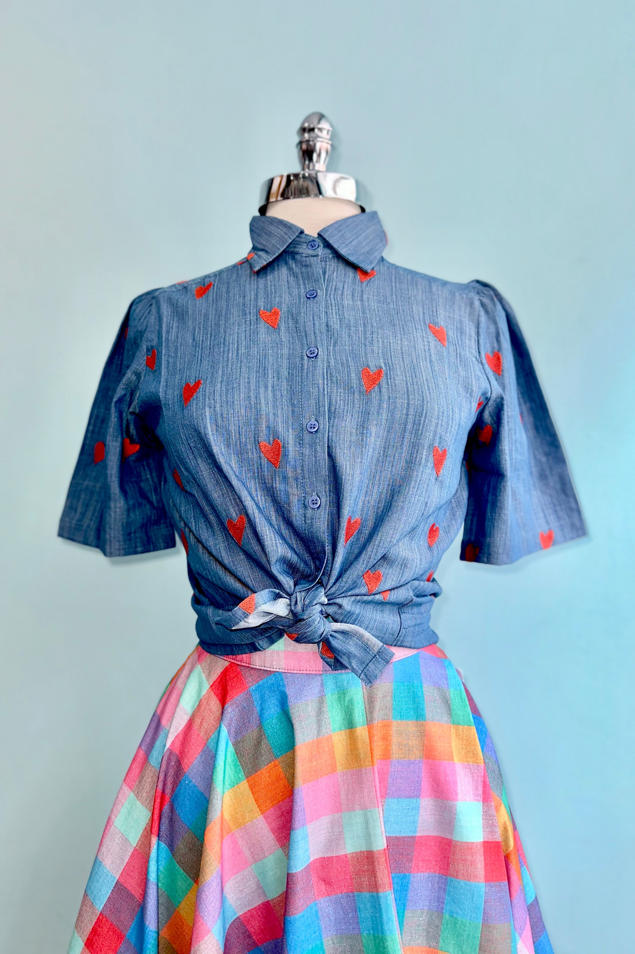 A blue shortsleeve blouse with a print of red hearts. This top has a collar and buttons up the front. It is unlined and does not have stretch.