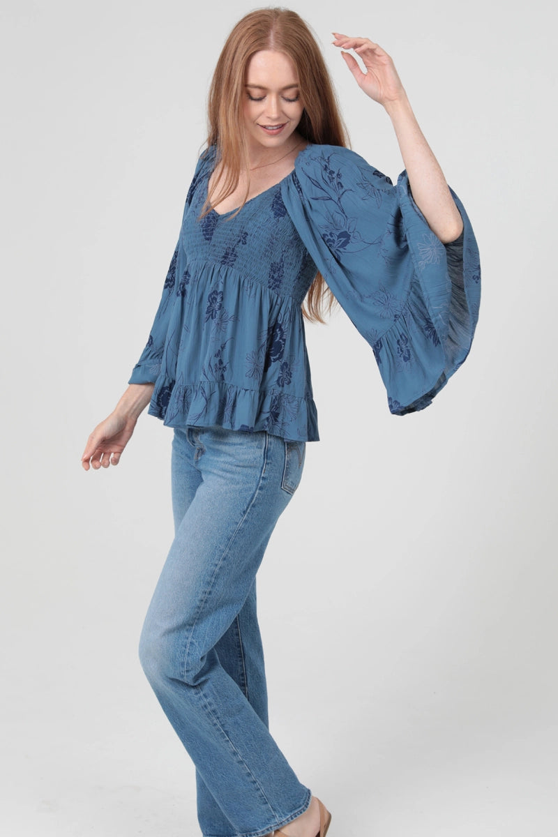 Bell sleeve top in blue with a dark blue rose print. This top has a fully smocked bodice with an empire waist. The front has a V-neckline and a square back.