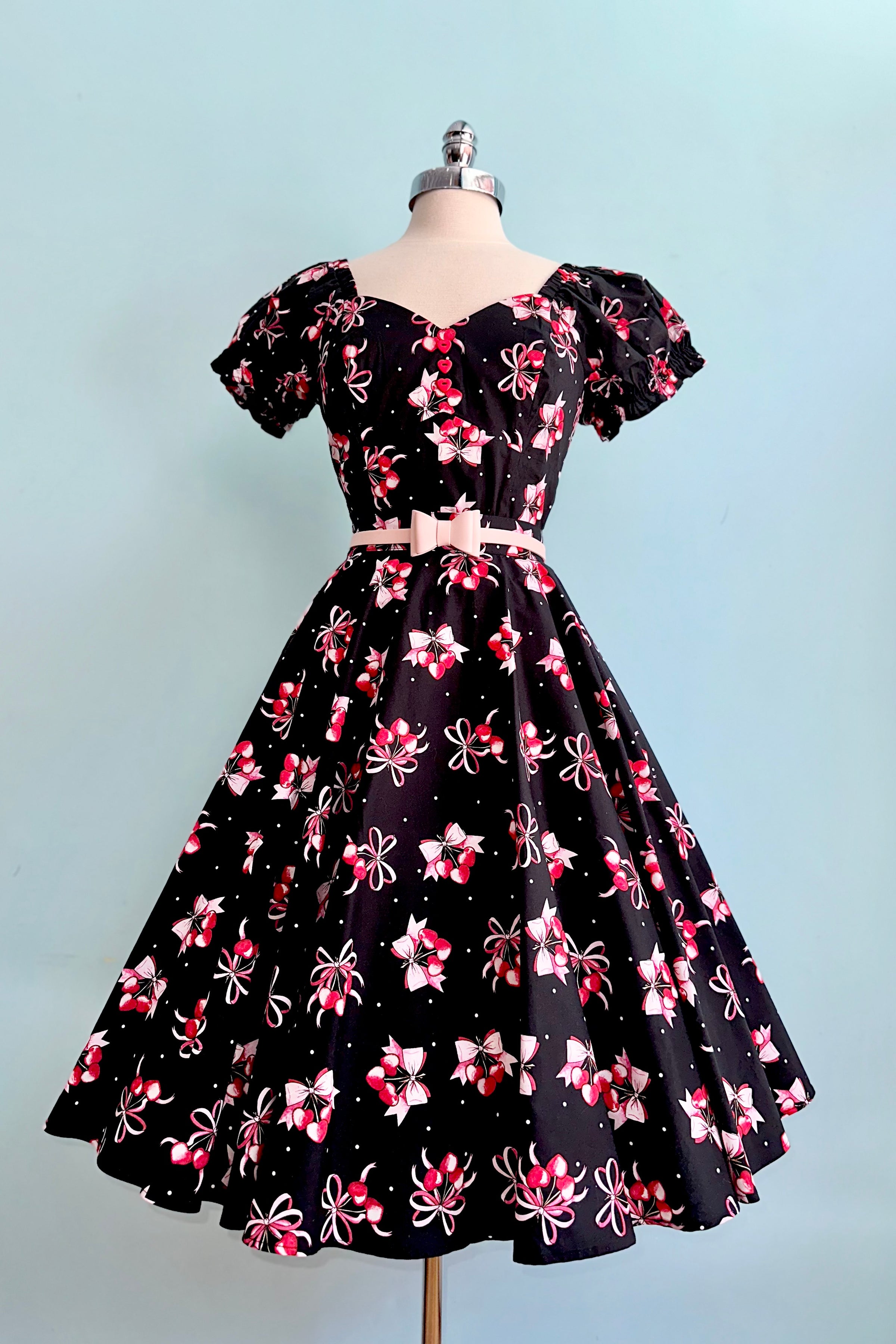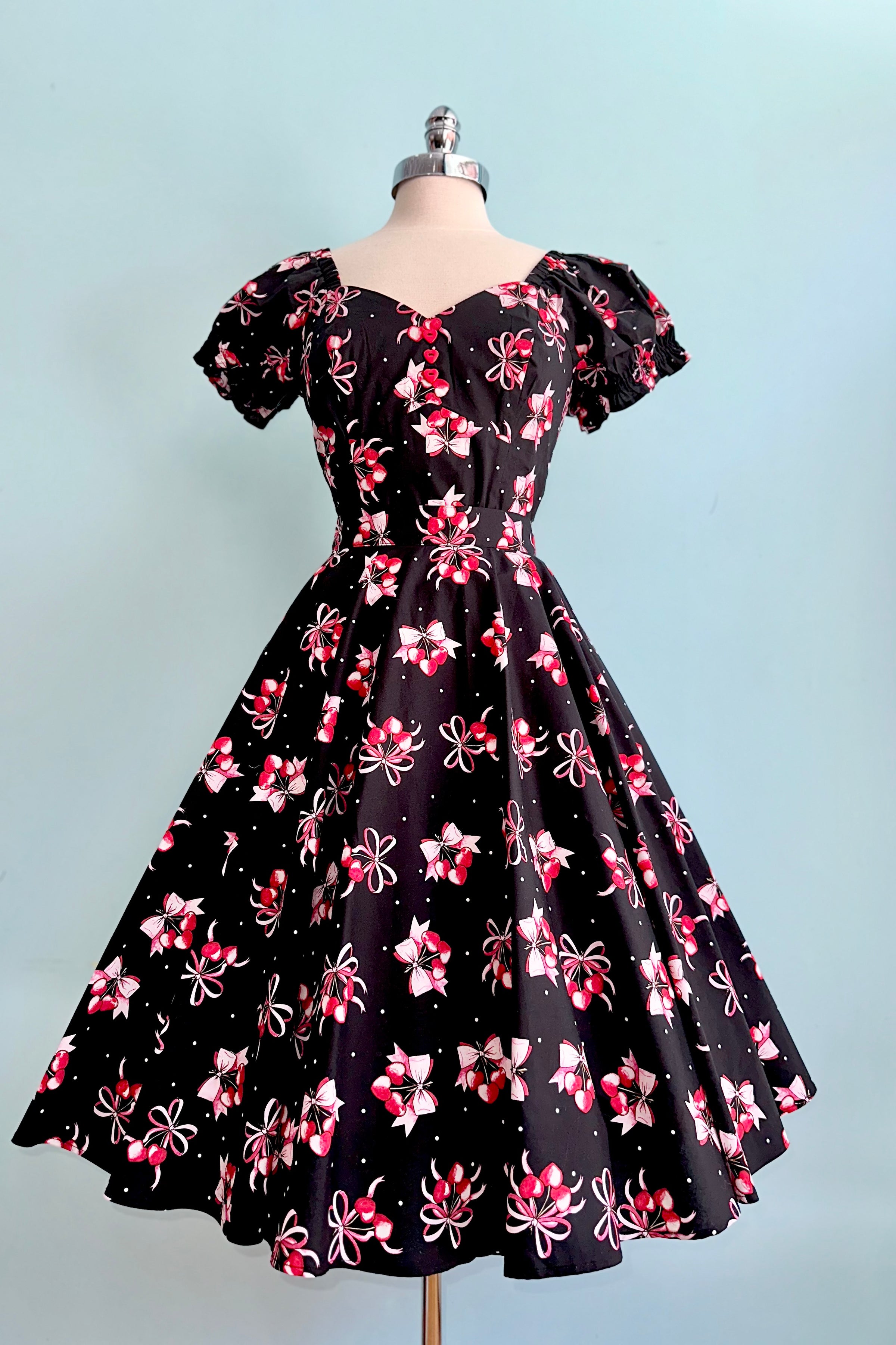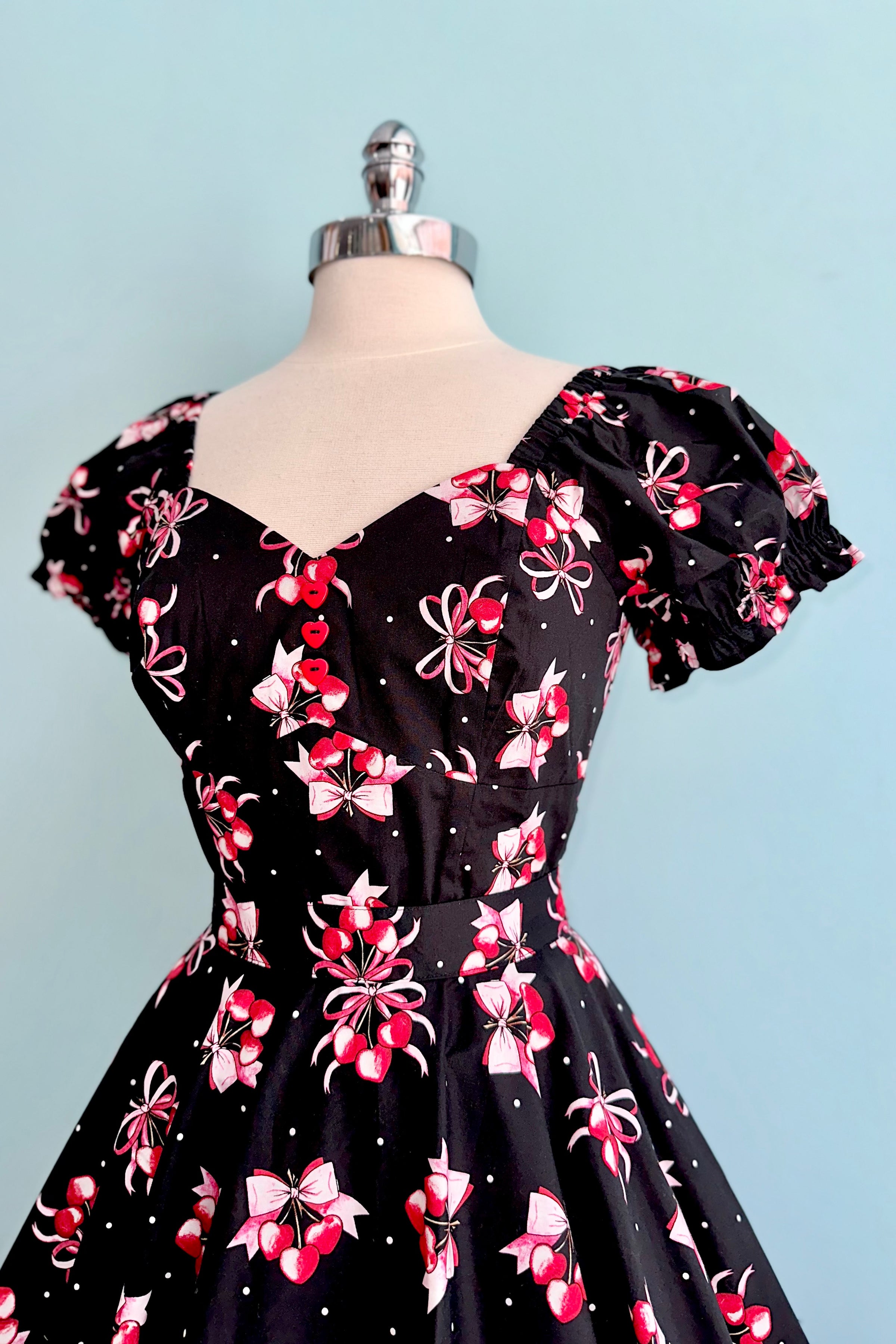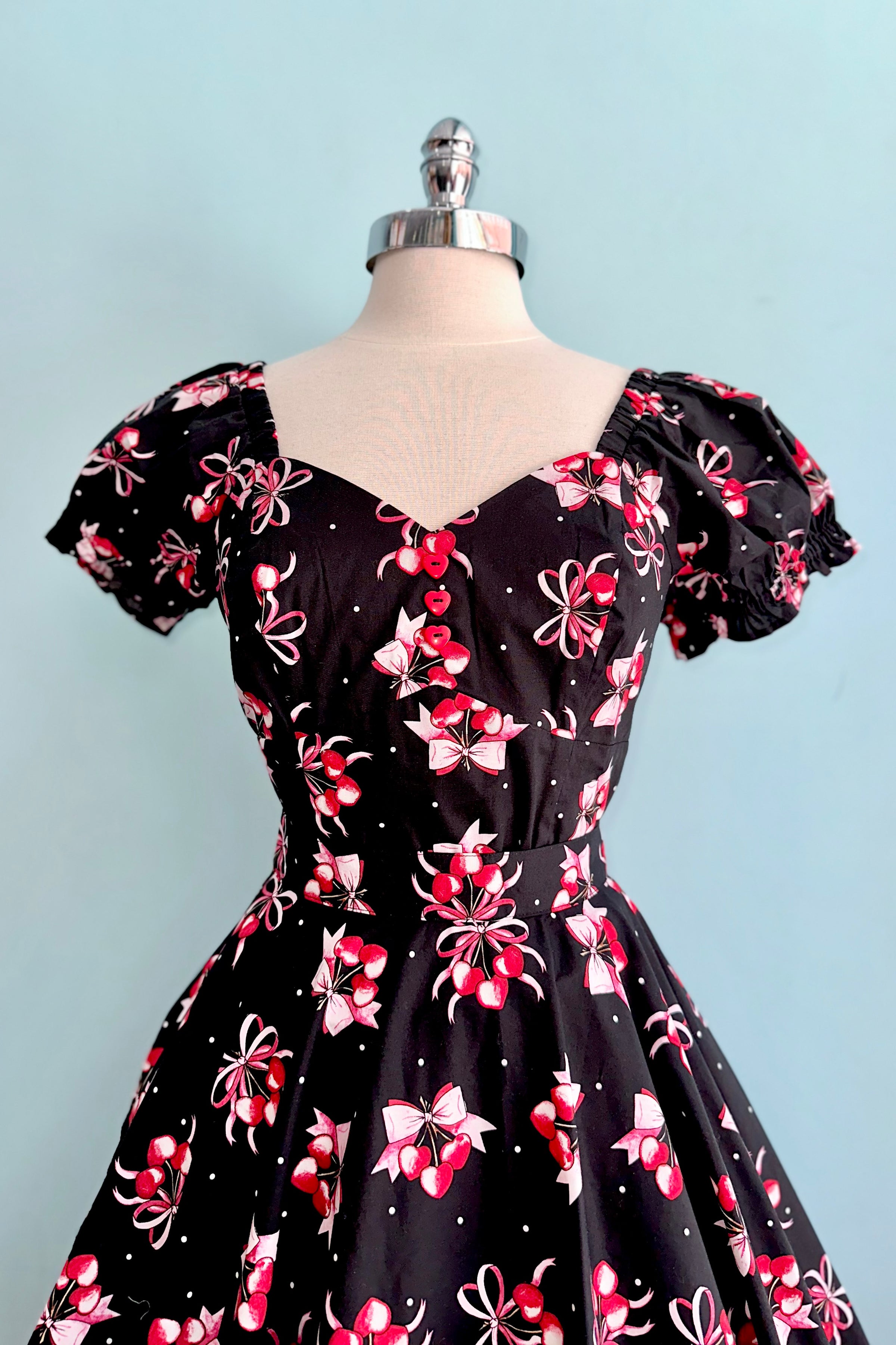 Black top with a print of cherry hearts and bows on a black. The sleeves are short puffs with elasticized cuffs. The bodice has a sweetheart neckline and is hip length. There is a middle back zipper closure.