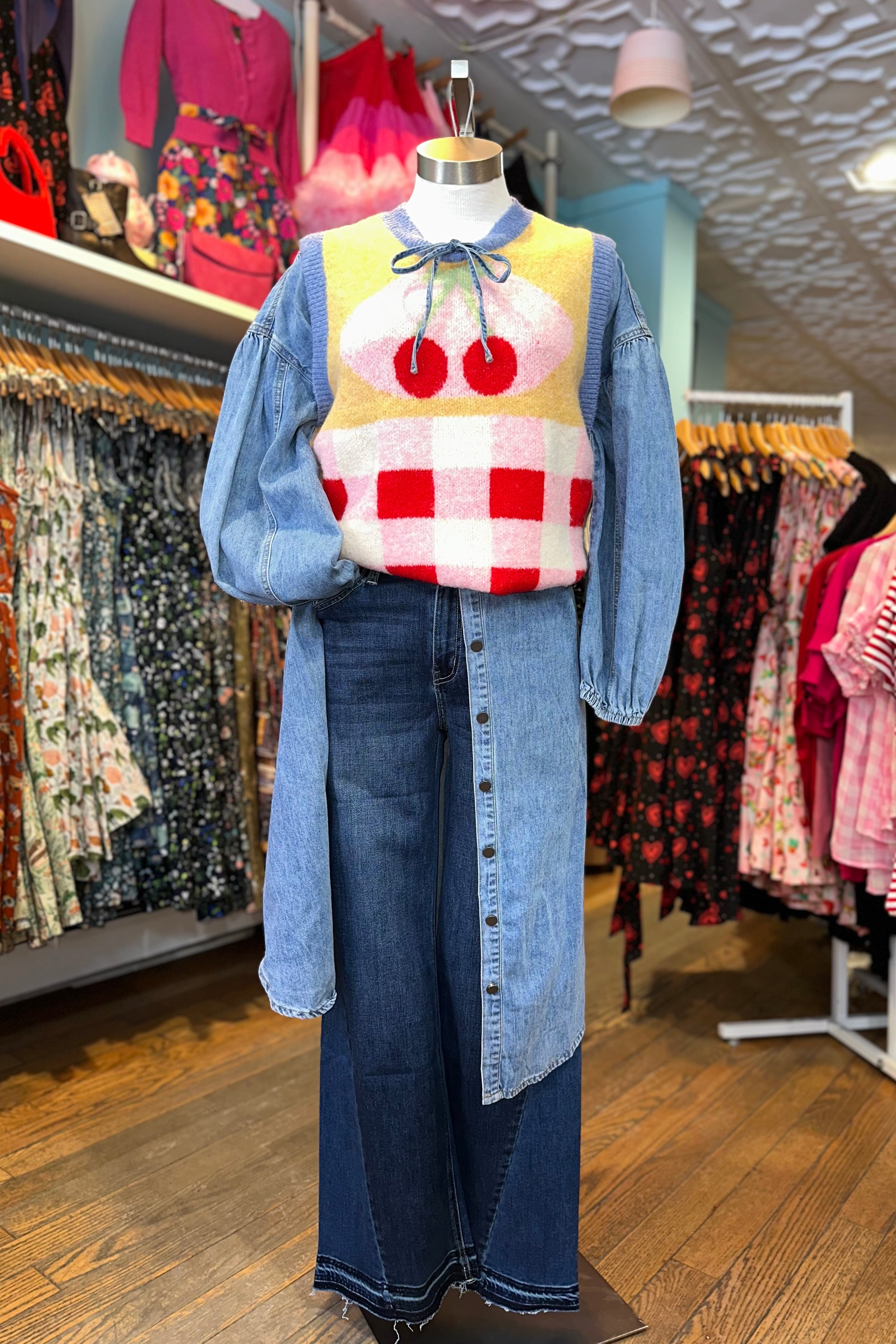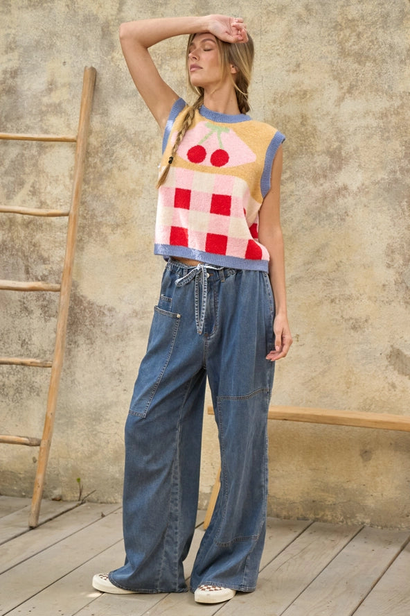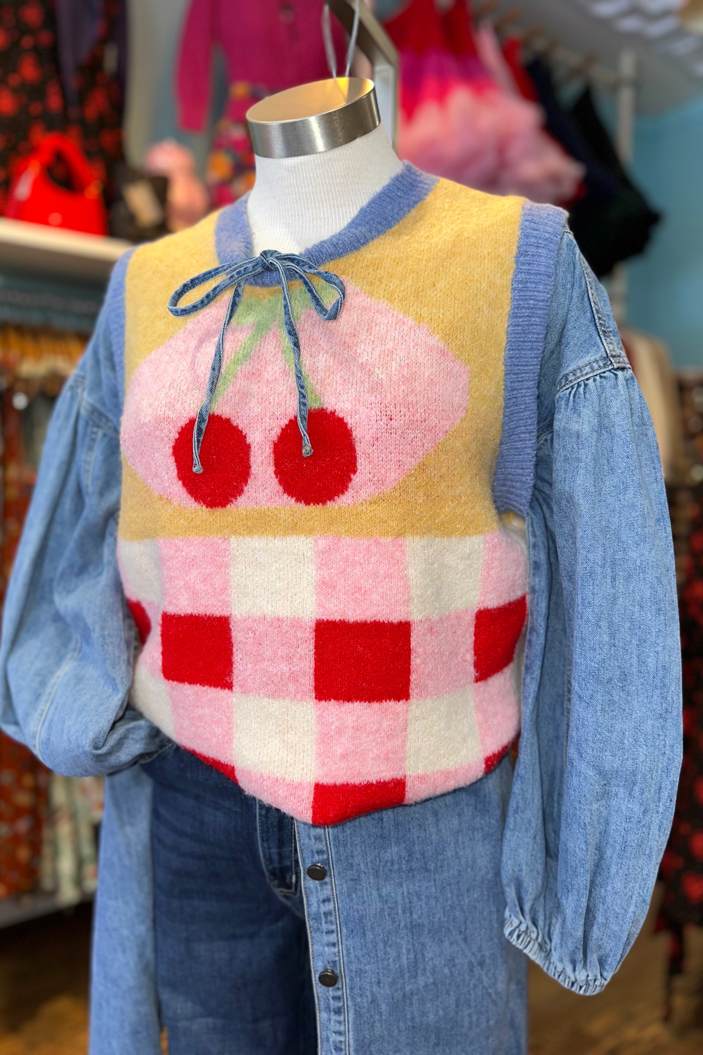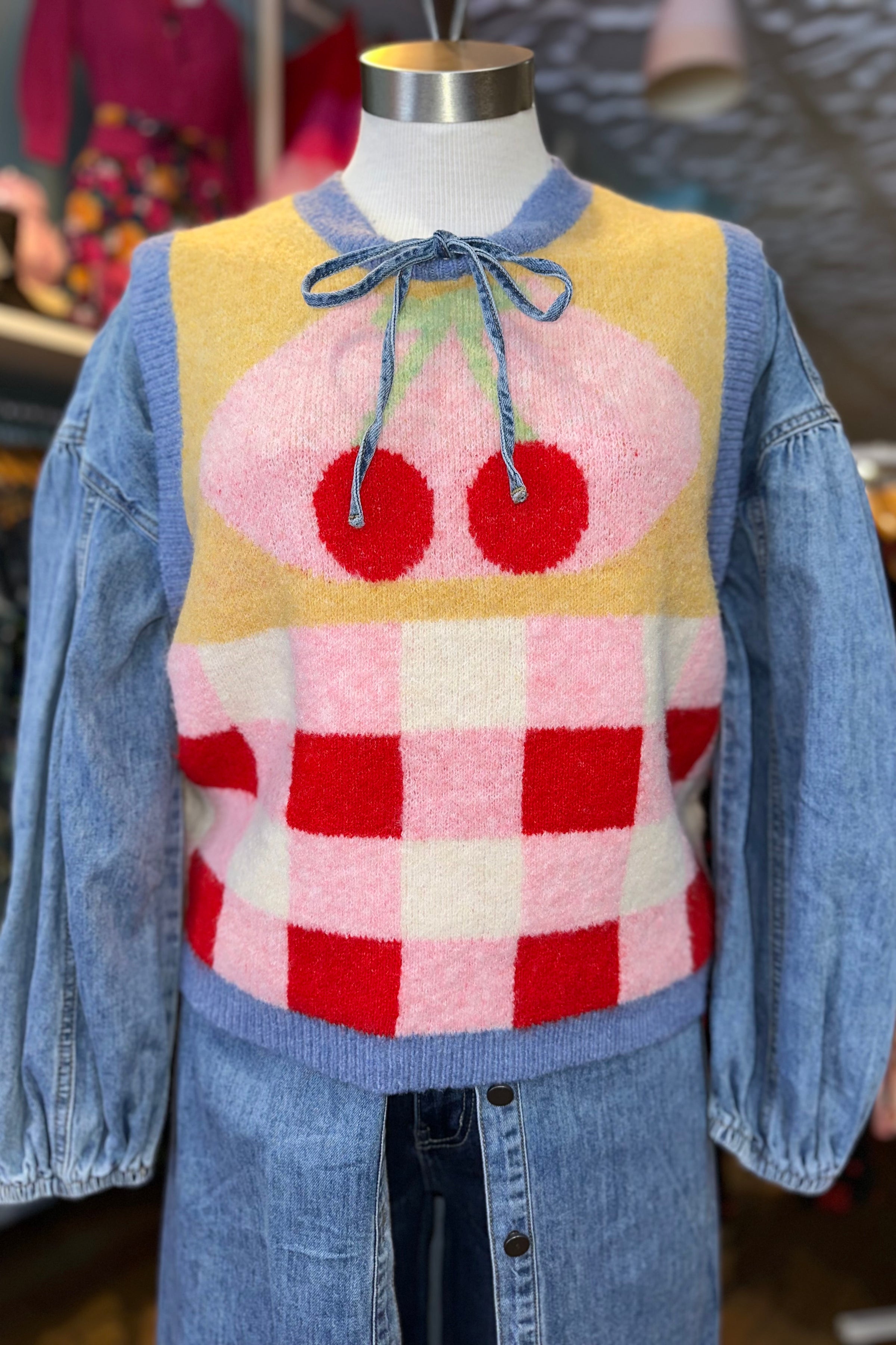 A sleeveless top with a red, pink, yellow, and white checkered print and two cute cherries at the neckline and ribbed blue trim at the collar and sleeves. This top has a loose fit and is meant to fit oversized so we suggest going with your usual size.