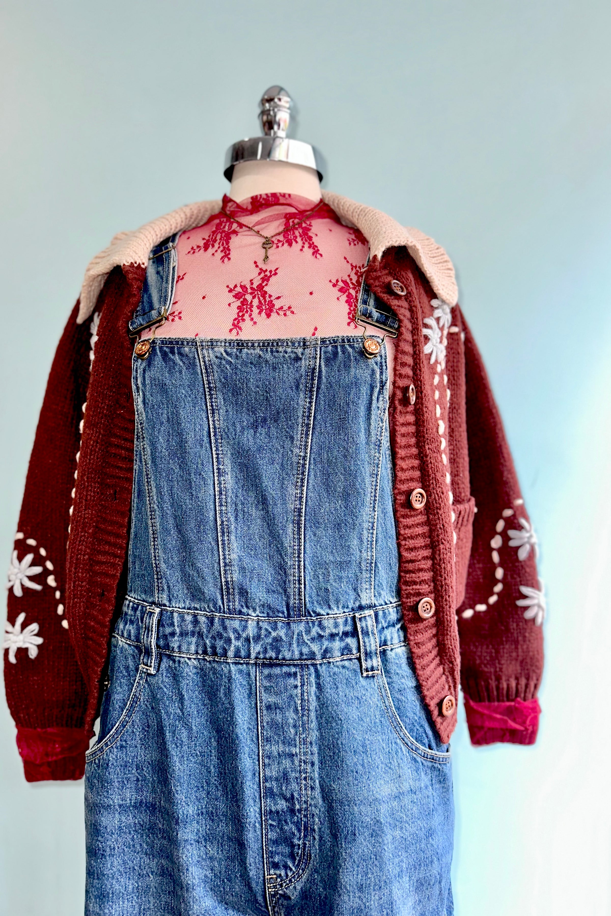 Cozy knit sweater crafted from a soft, chunky knit for warmth and comfort. This sweater has a contrast collar and floral embroidery across the front and sleeves. There is a button front easy closure with wooden-style buttons for a rustic touch. The front has patch pockets at the front for practicality and charm