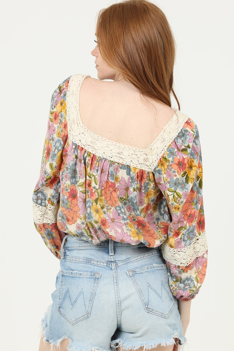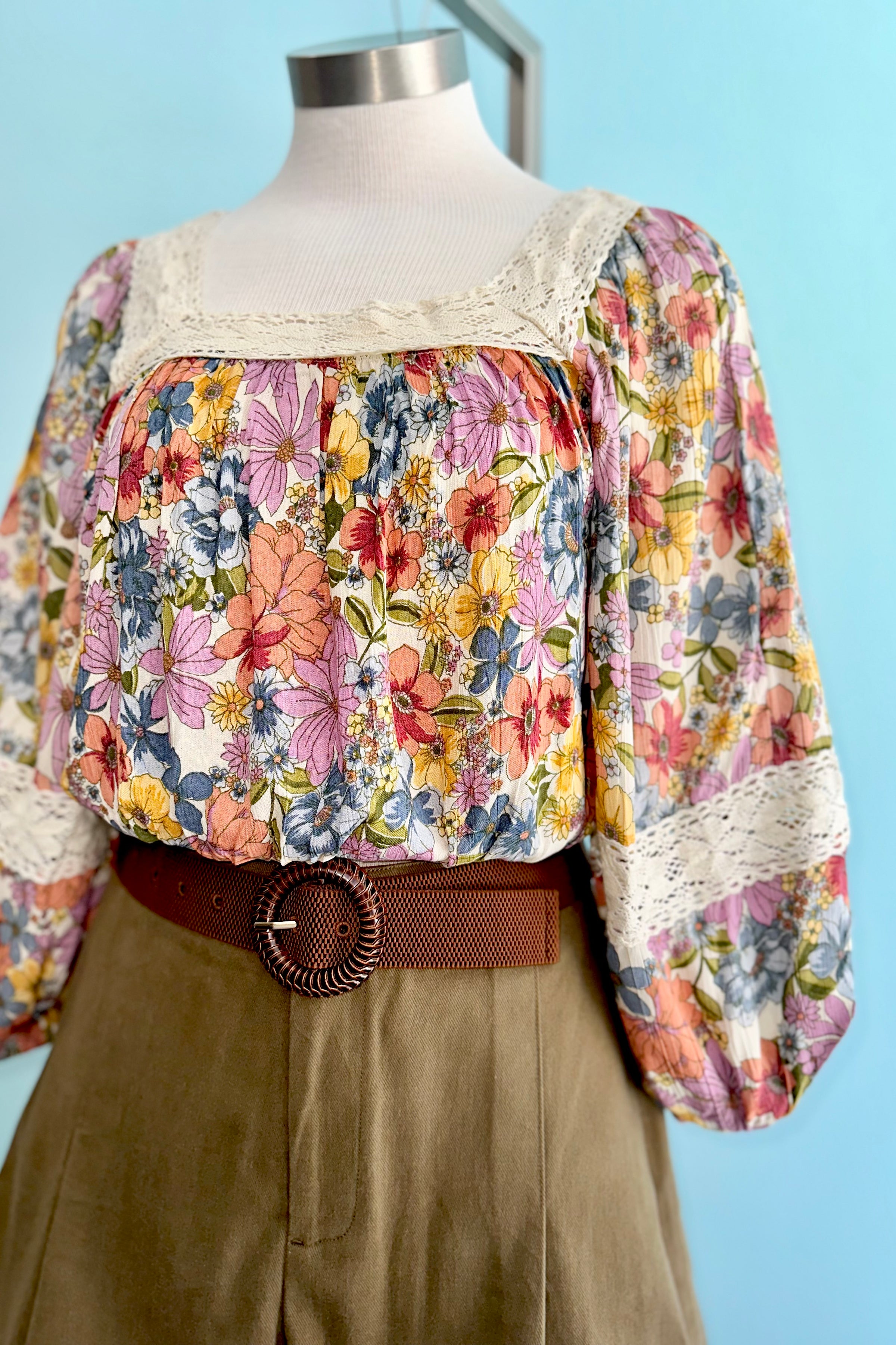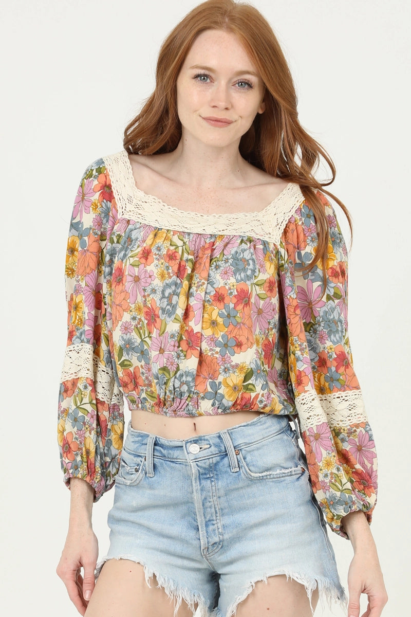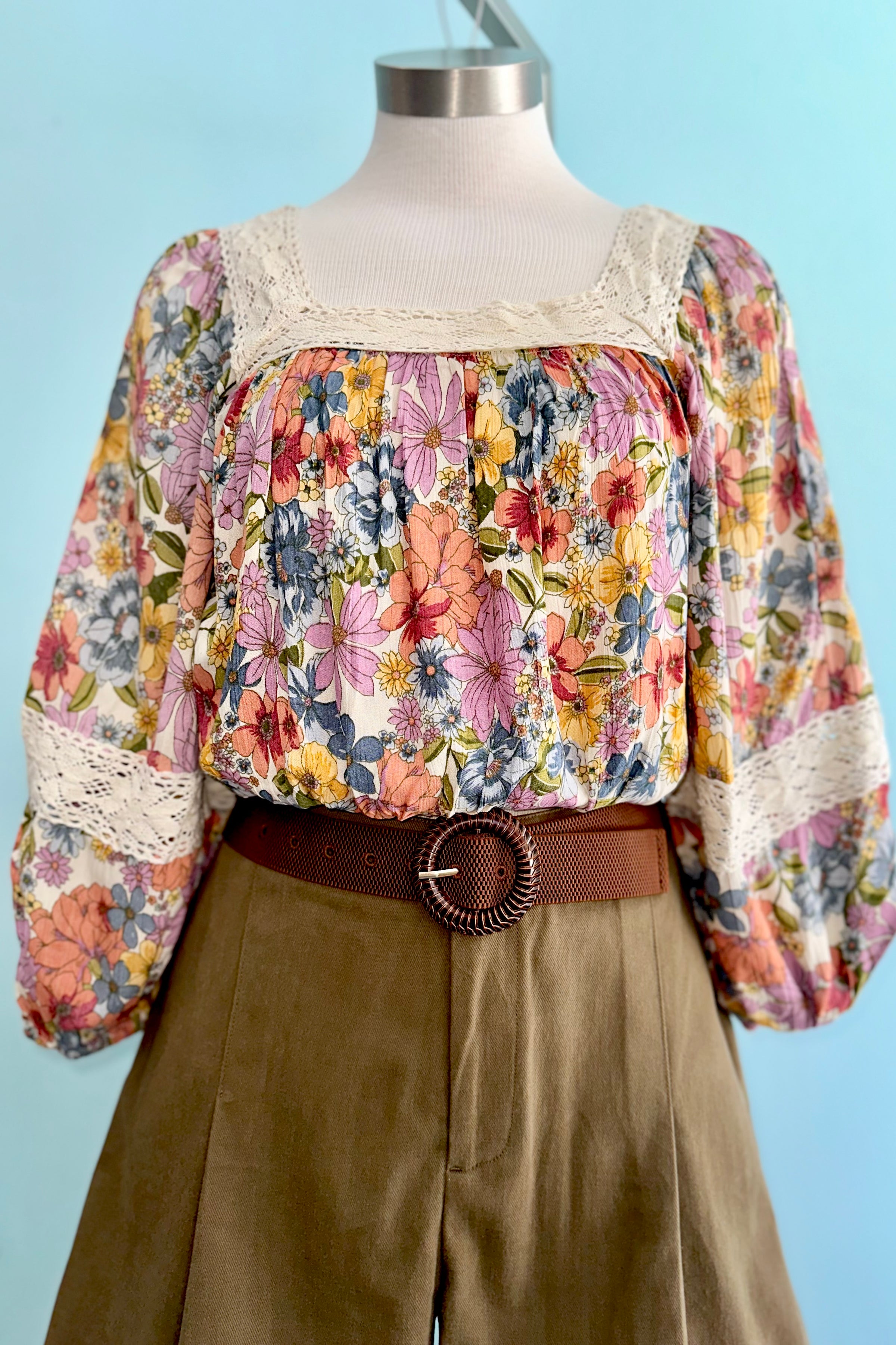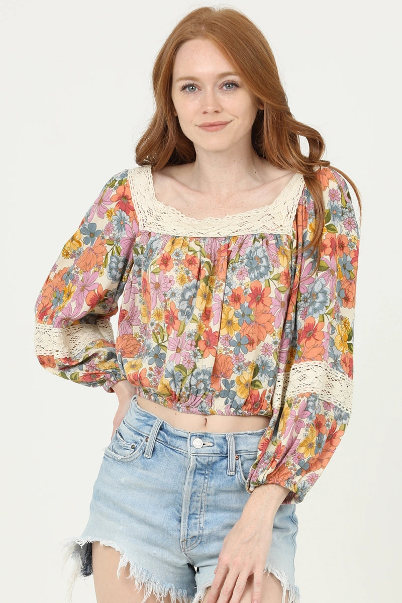 Balloon sleeves with a cropped elasticized hem. This top has an off-white background with a colorful floral print in purple, yellow, blue, green, and orange. The bodice is loose and has a square neckline.
