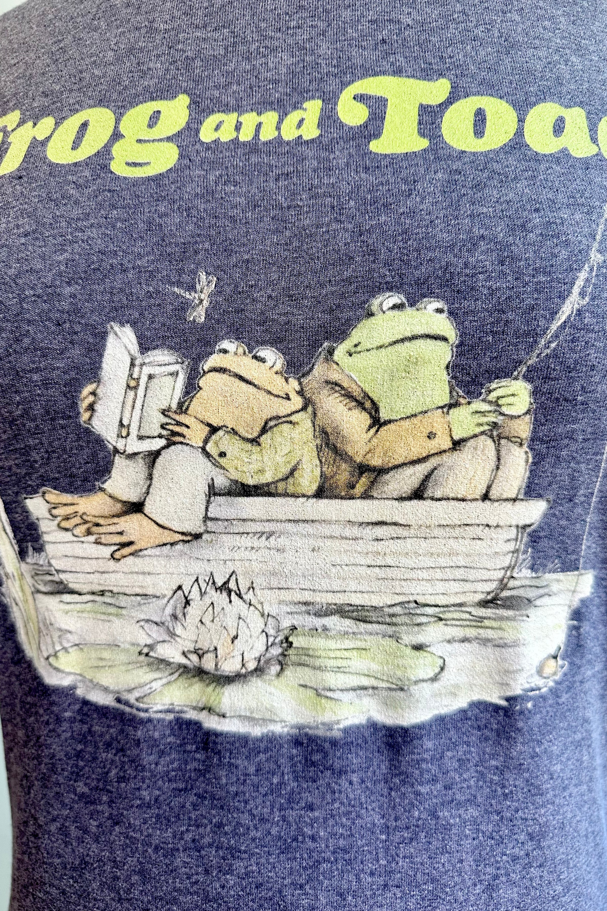 A heathered blue t-shirt featuring an image of frog and toad in a boat reading a book. This design is a perfect gift for book lovers. The tee is crafted from soft, breathable cotton for all-day comfort.
