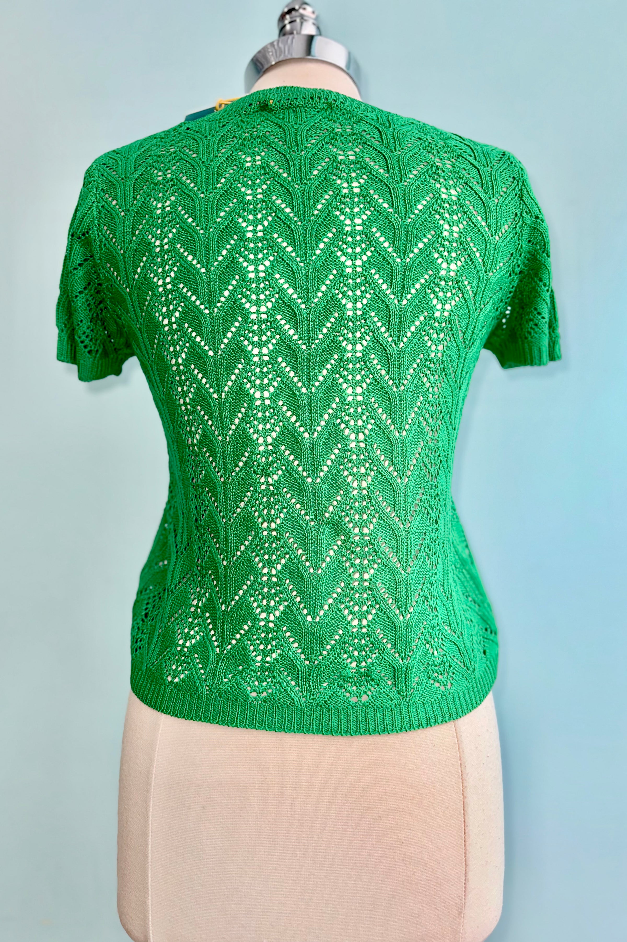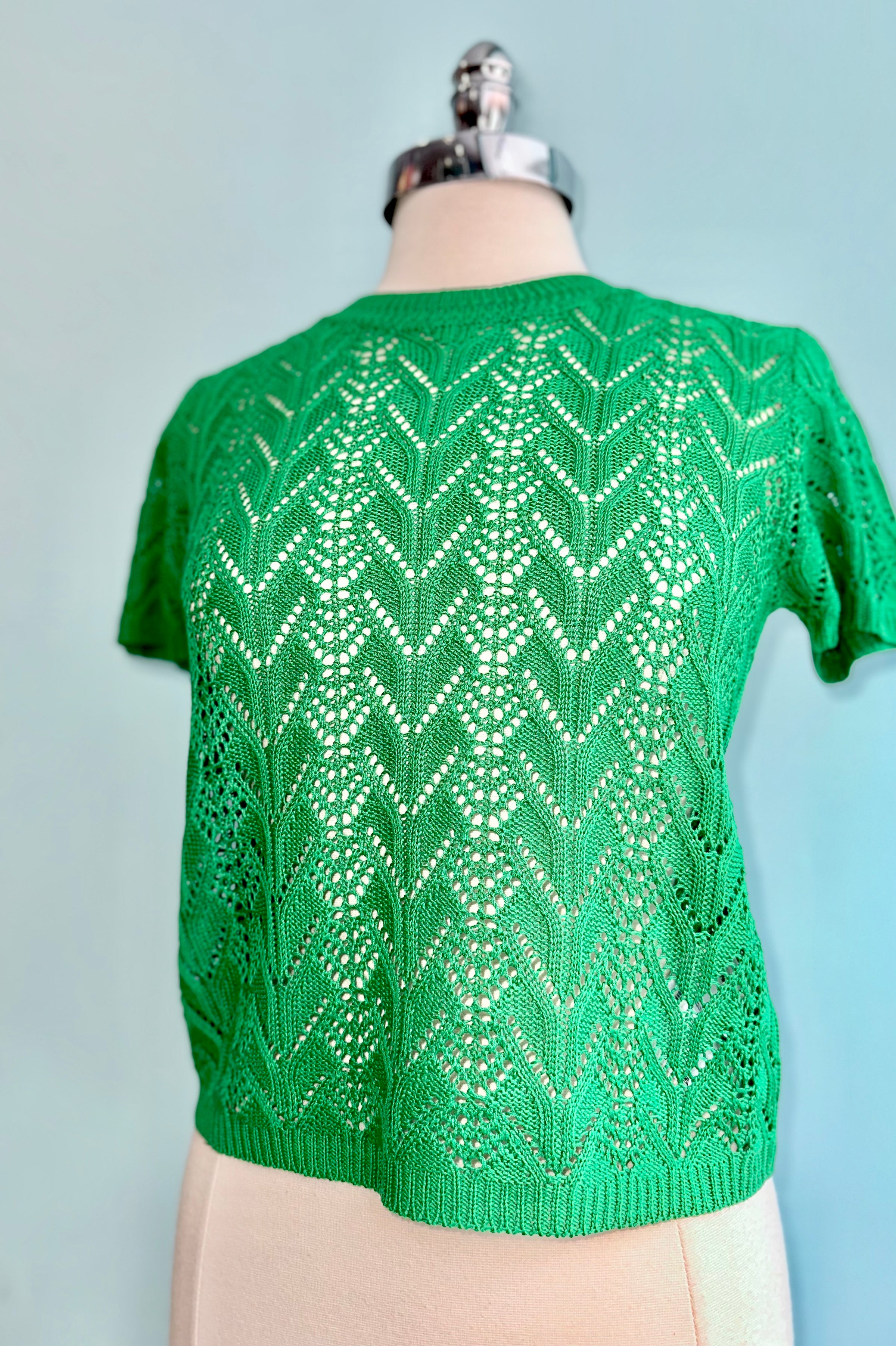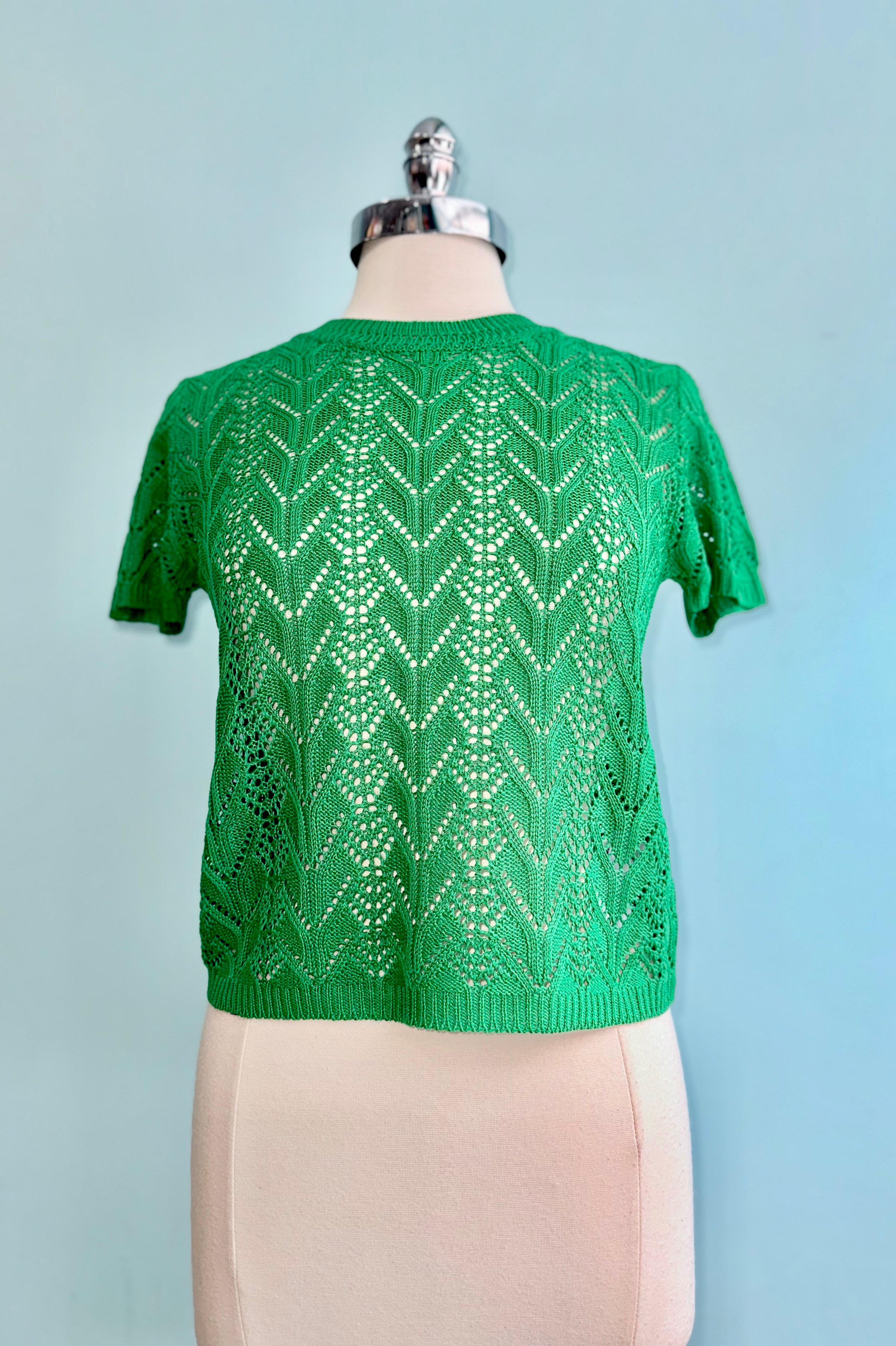 A green pointelle sweater with a round neck and shortsleeves. This sweater is fitted and has a good amount of stretch.