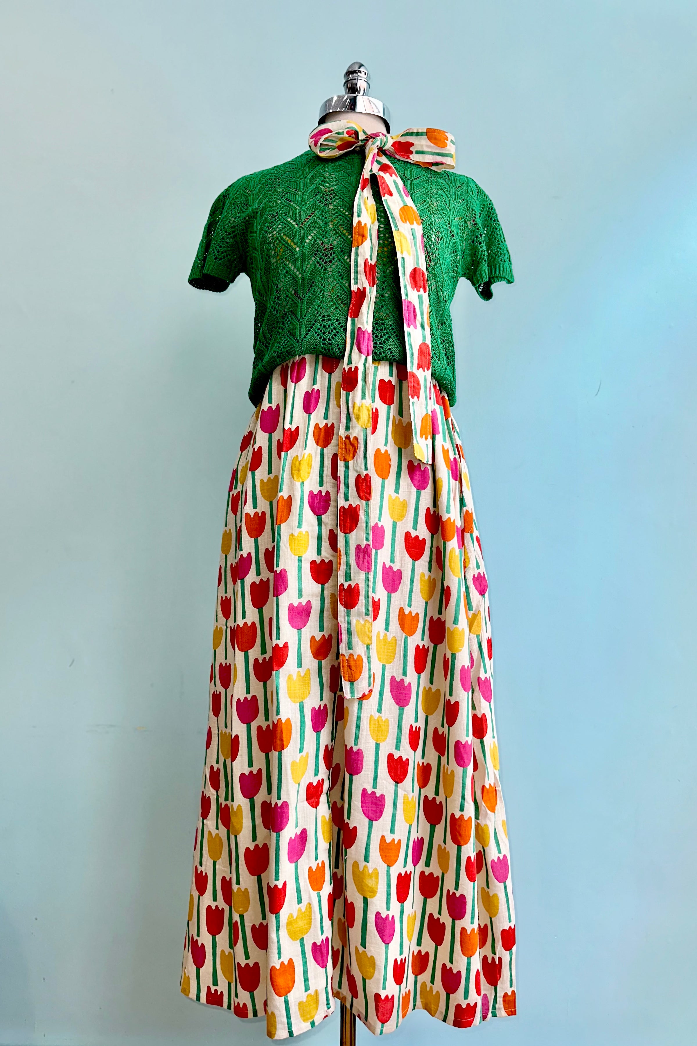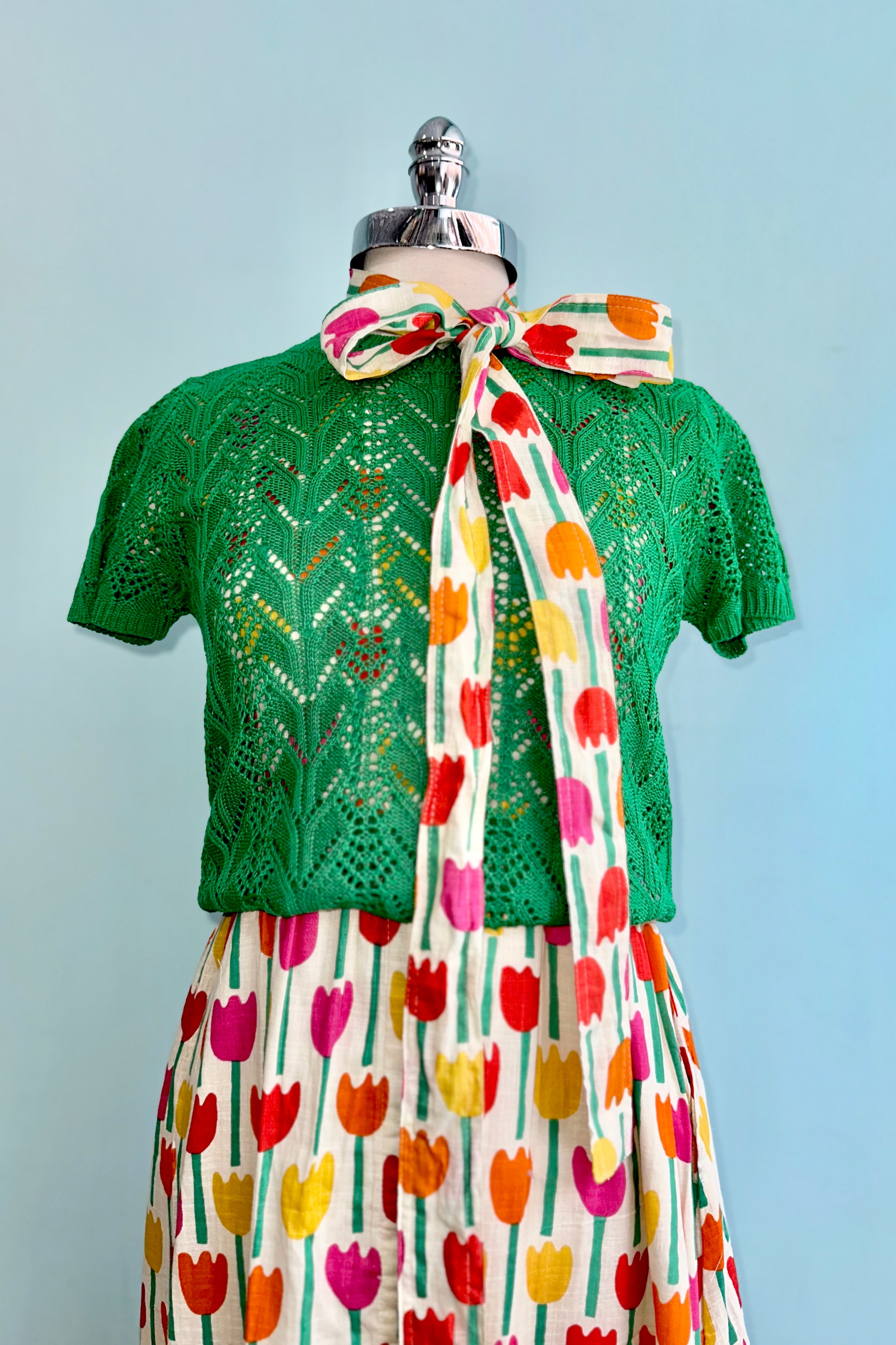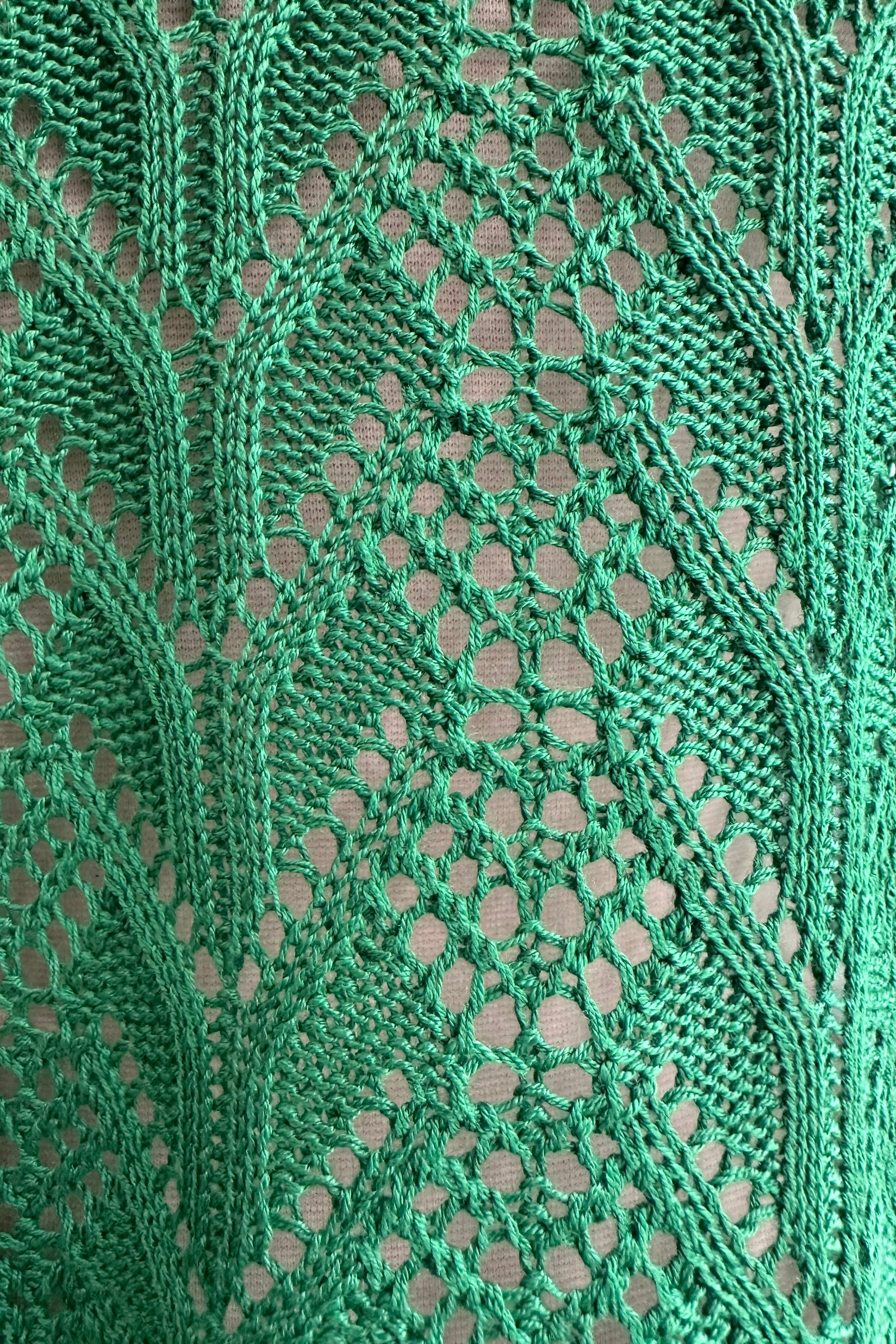 A green pointelle sweater with a round neck and shortsleeves. This sweater is fitted and has a good amount of stretch.