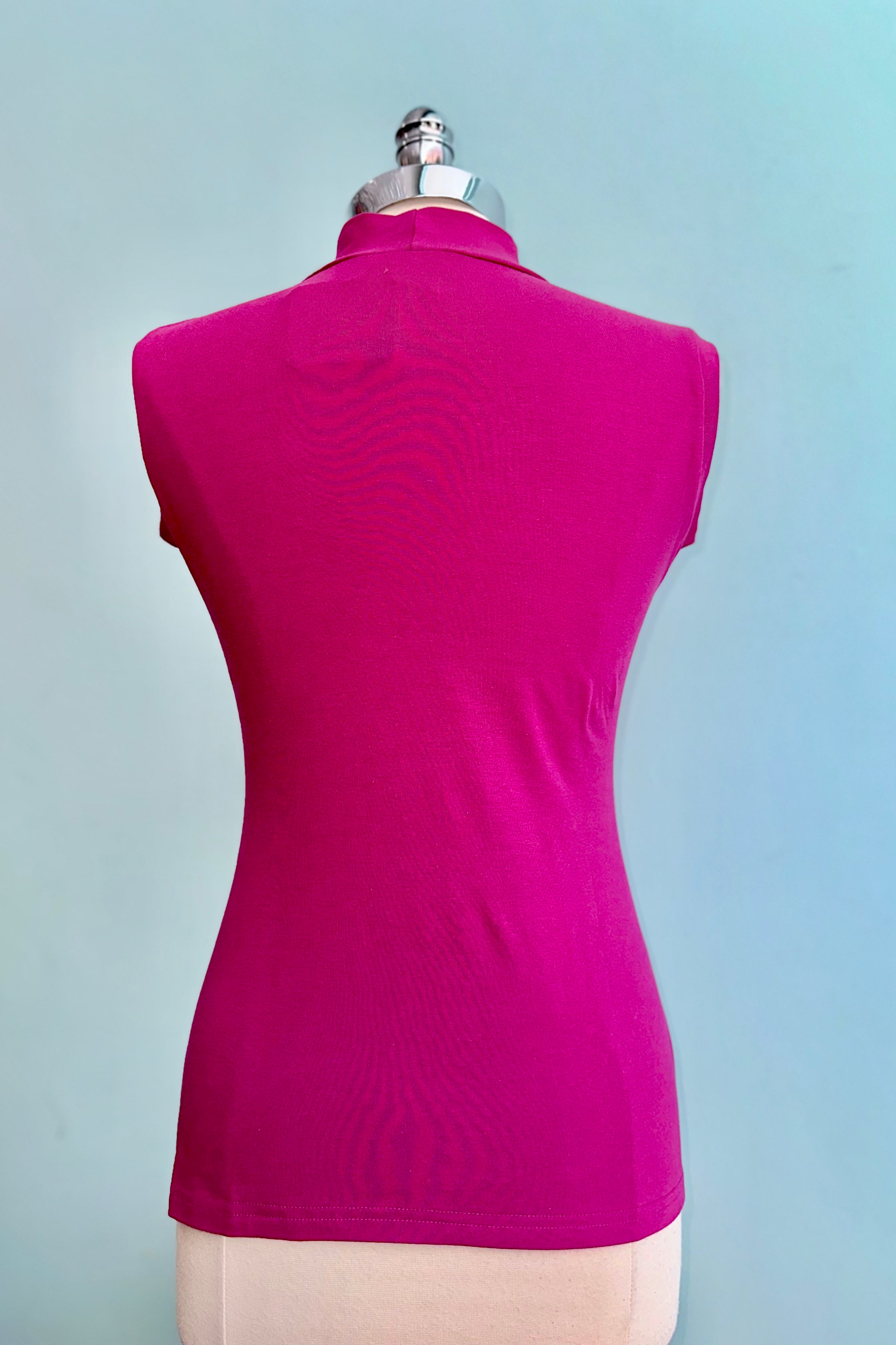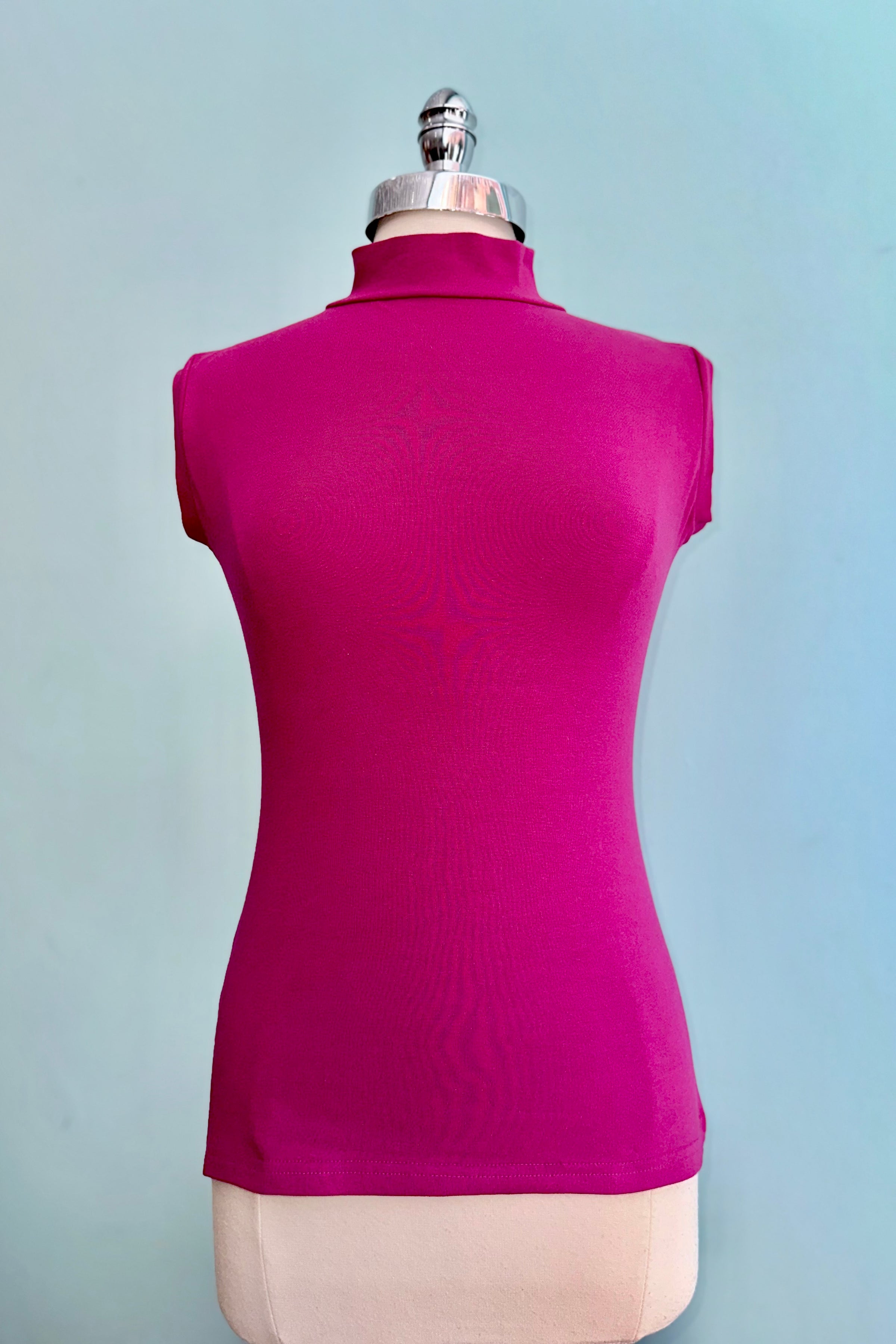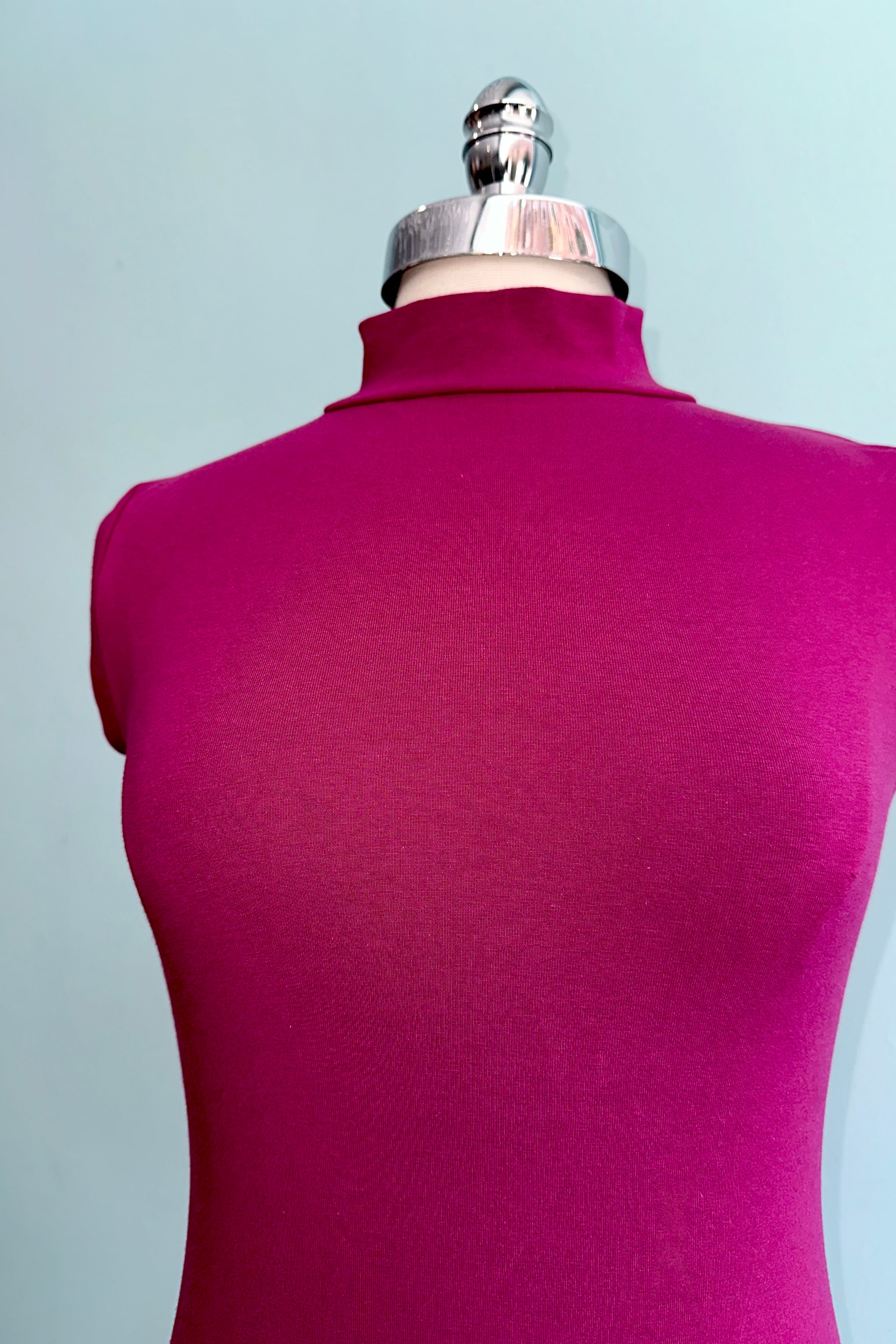 Jersey top in magenta with a mock turtleneck and fitted shape. This top is great as a lightweight layer underneath a dress as well as a separate with a skirt.