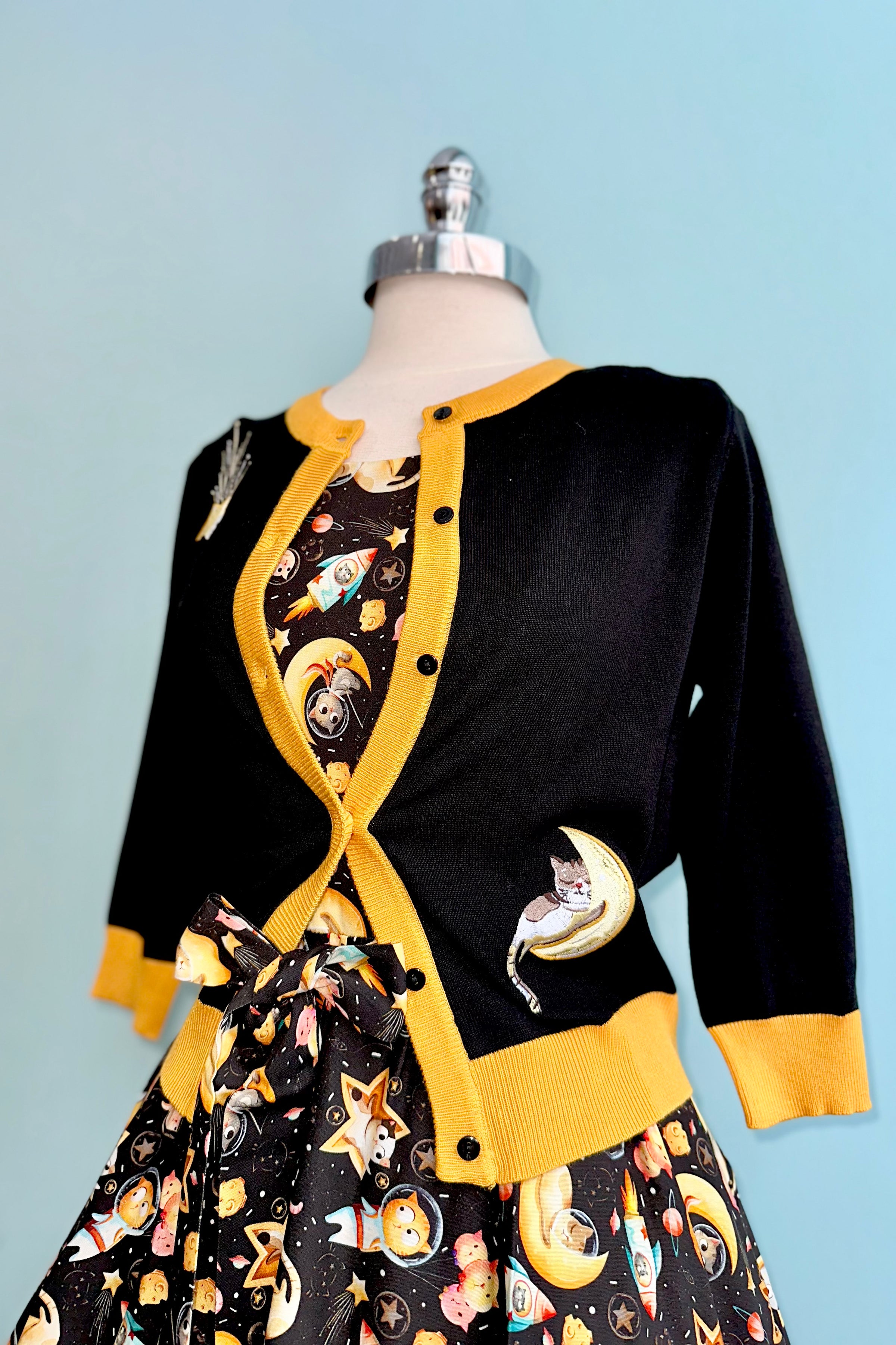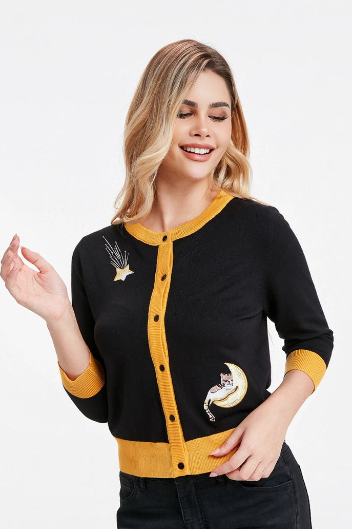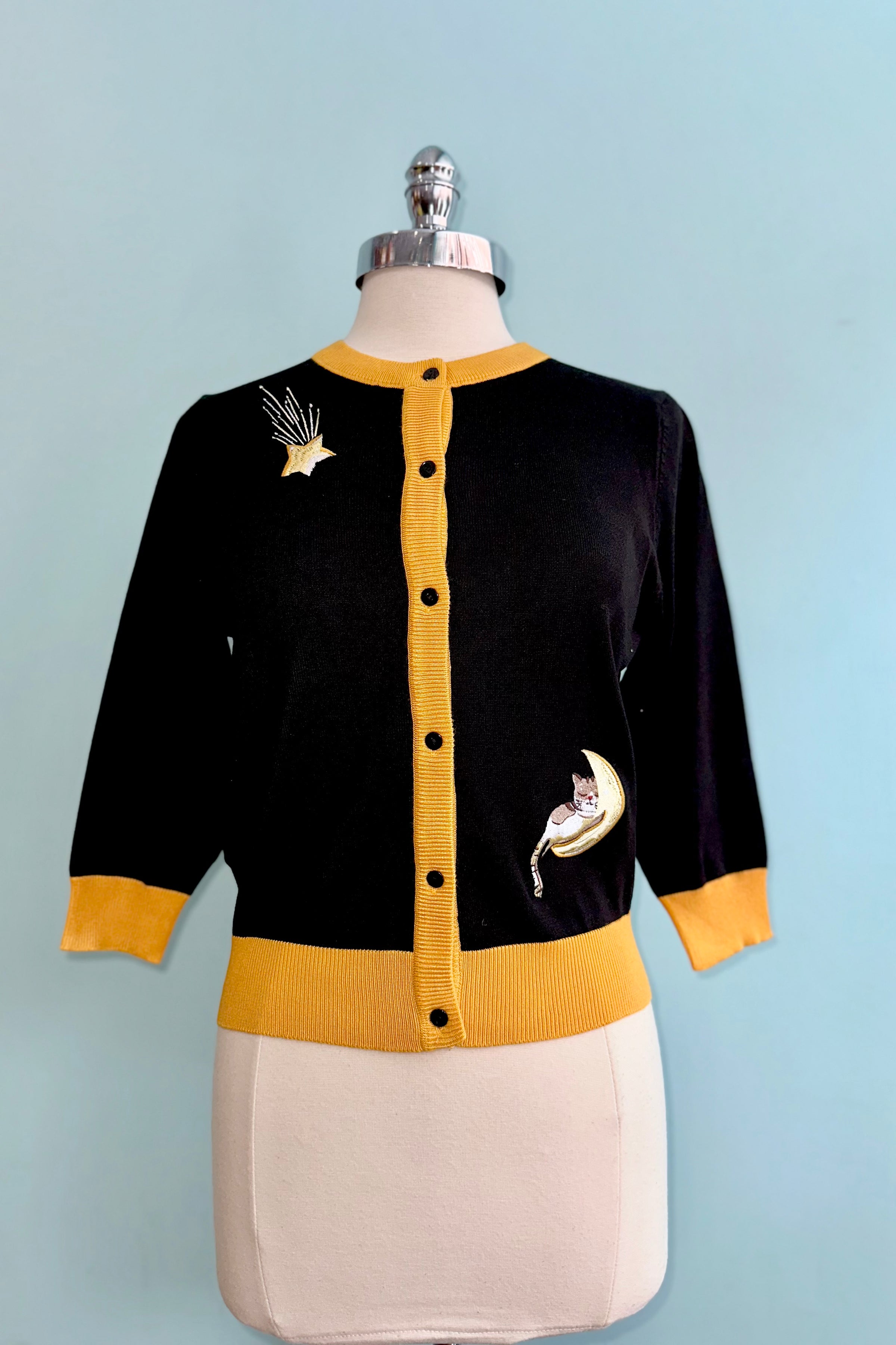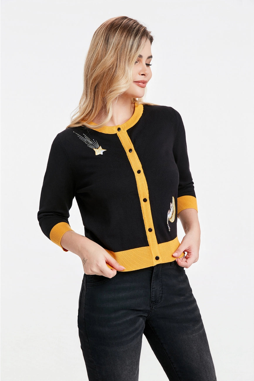 Short cardigan sweater in black with an cat sitting on the moon on the front hem and a star on the right shoulder. This cardi has a yellow trim, 3/4 sleeves, a rounded neck,  and a button front.
