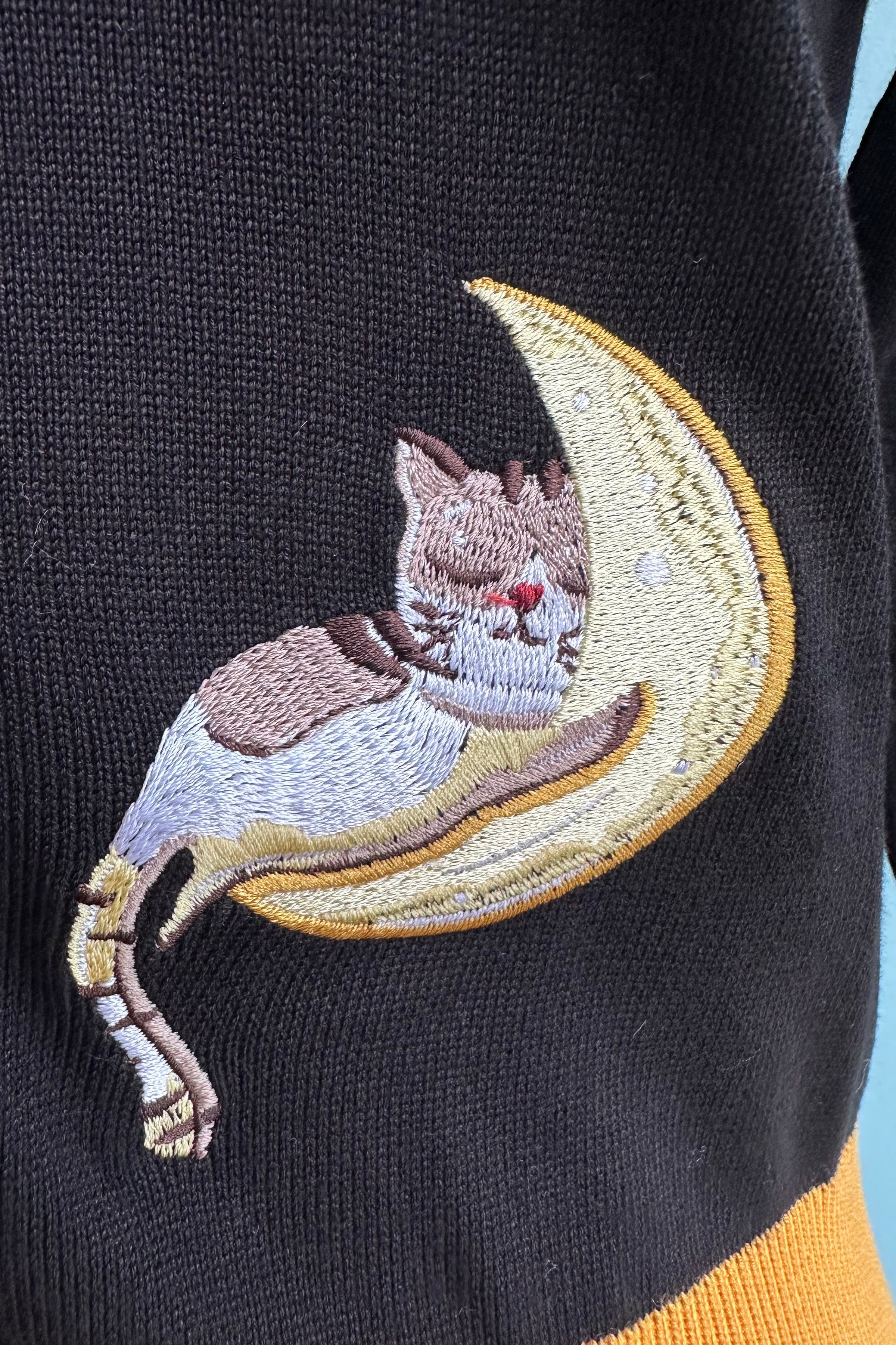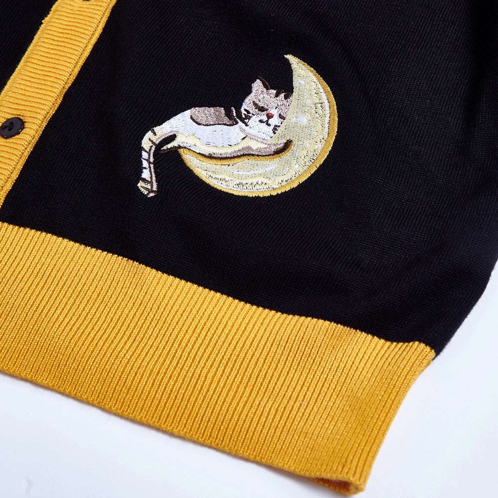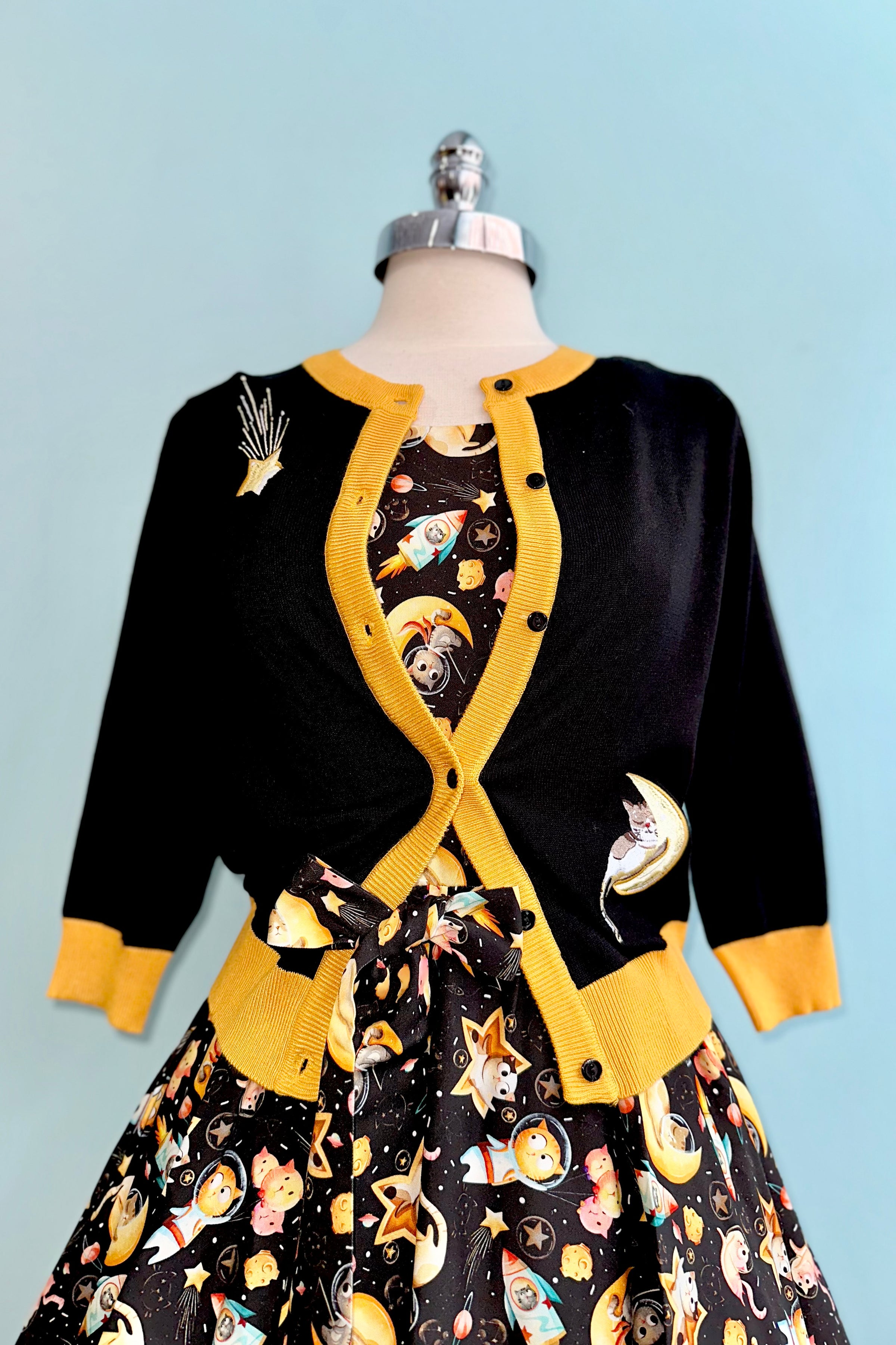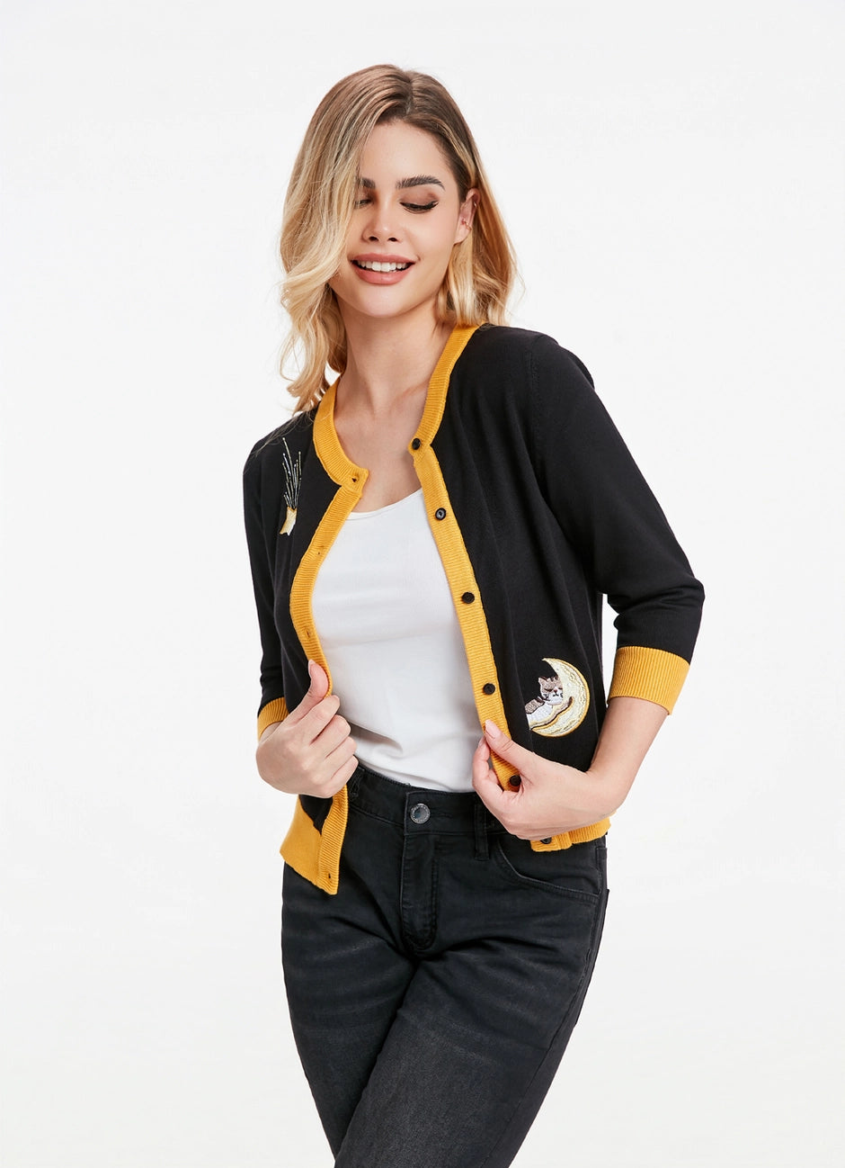 Short cardigan sweater in black with an cat sitting on the moon on the front hem and a star on the right shoulder. This cardi has a yellow trim, 3/4 sleeves, a rounded neck,  and a button front.