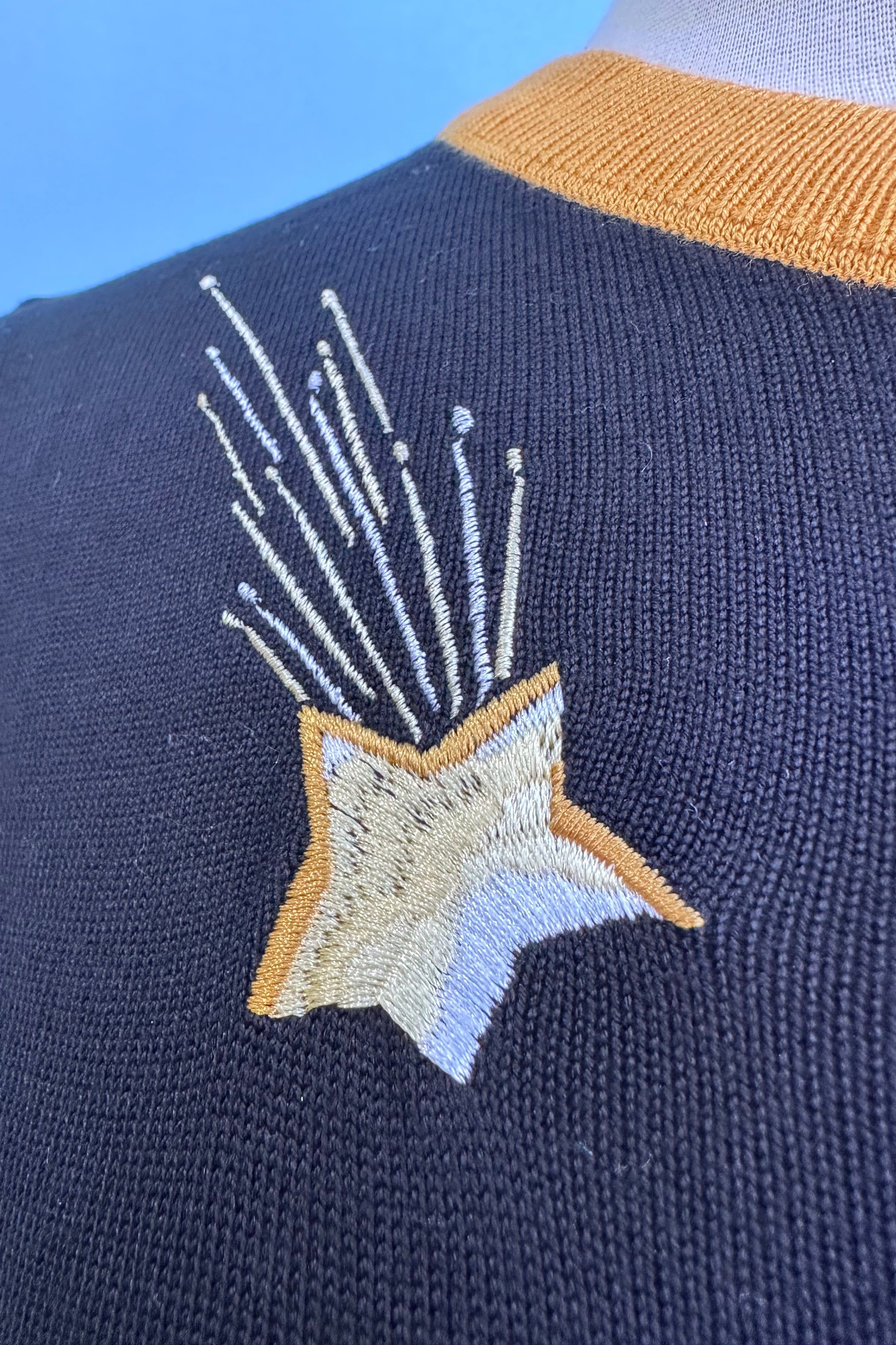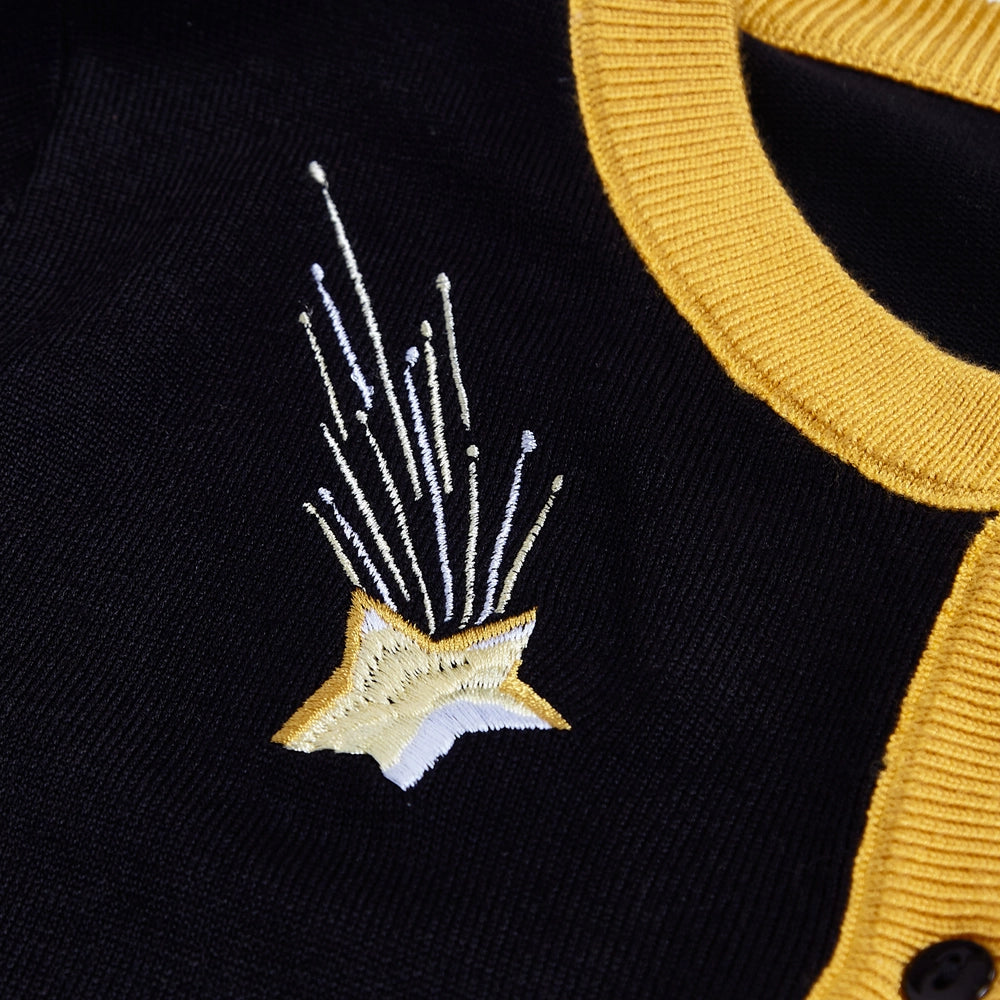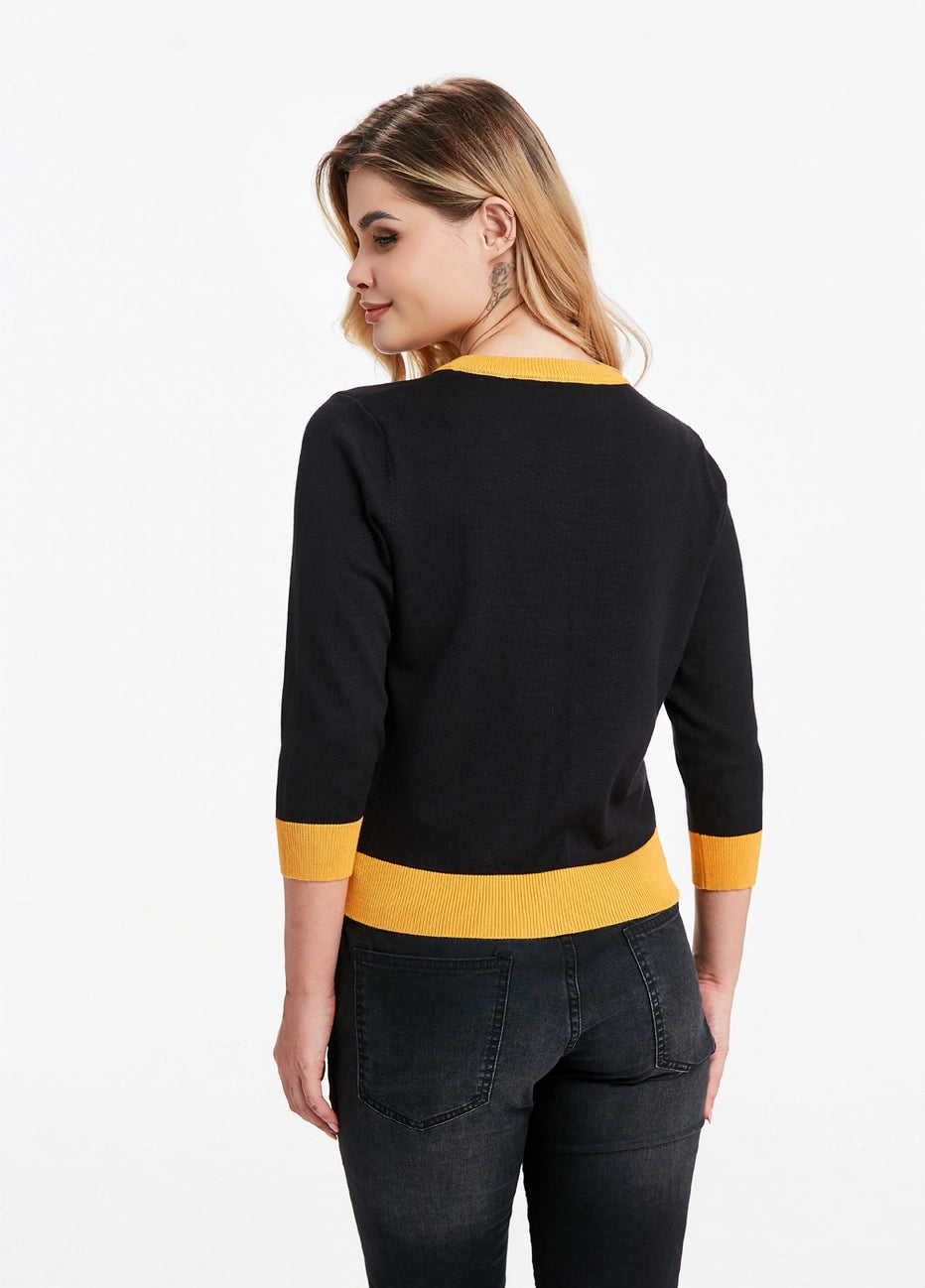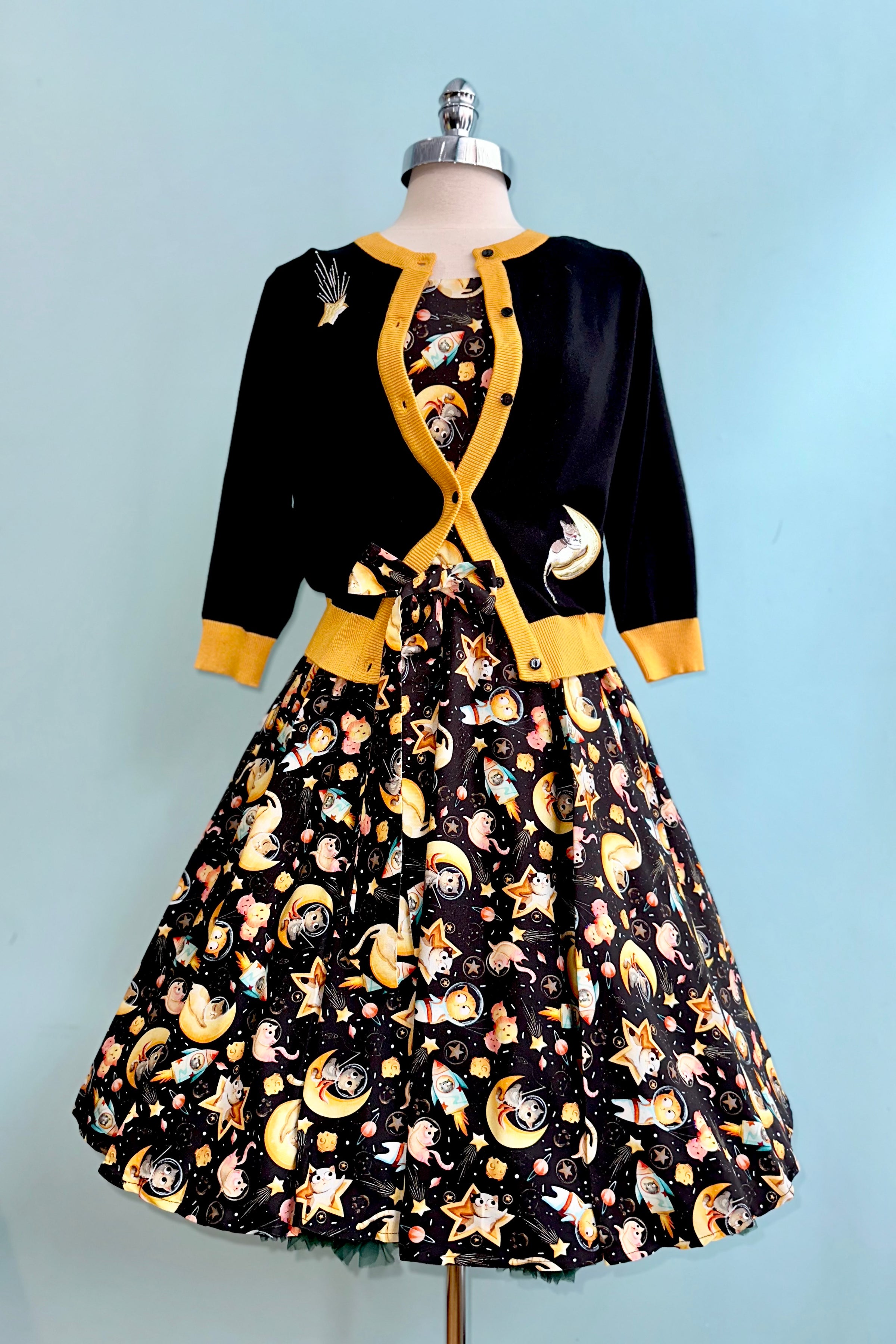 Short cardigan sweater in black with an cat sitting on the moon on the front hem and a star on the right shoulder. This cardi has a yellow trim, 3/4 sleeves, a rounded neck,  and a button front.