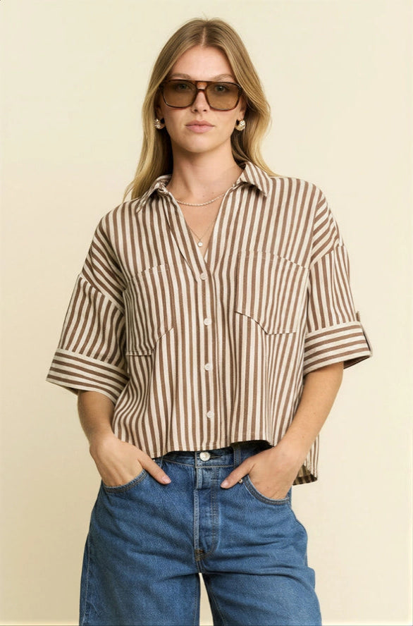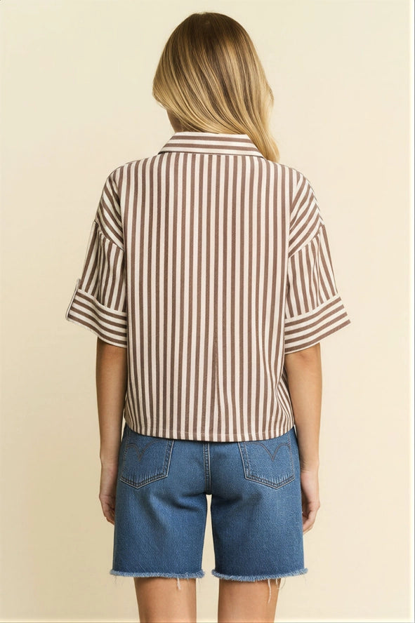 A mocha and white striped short sleeve top that buttons up the front. This shirt has a collared neckline, sleeves that fold over and button, and a cropped loose body with a relaxed fit.