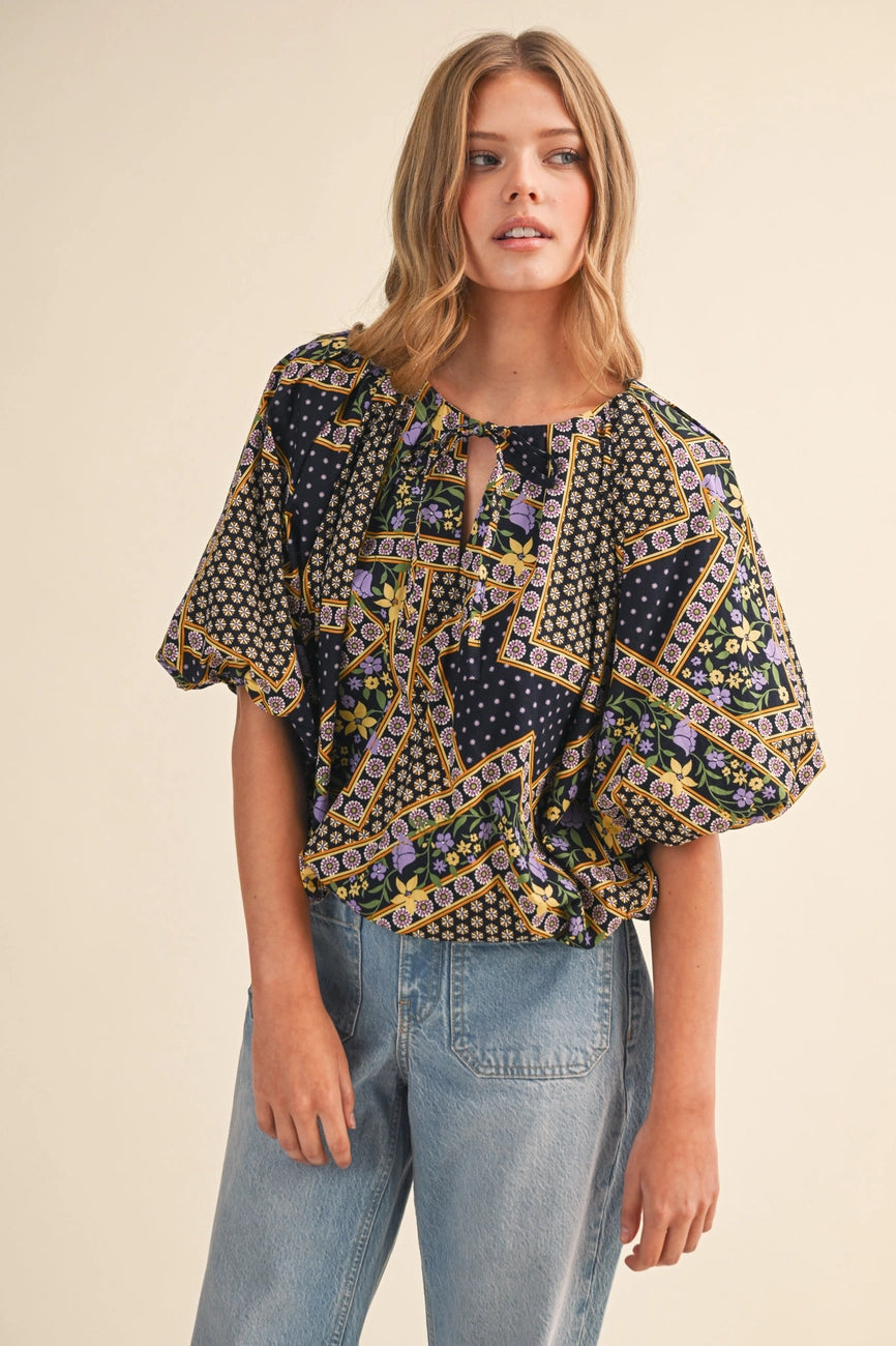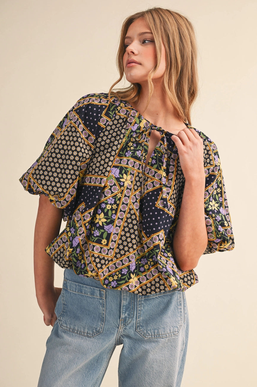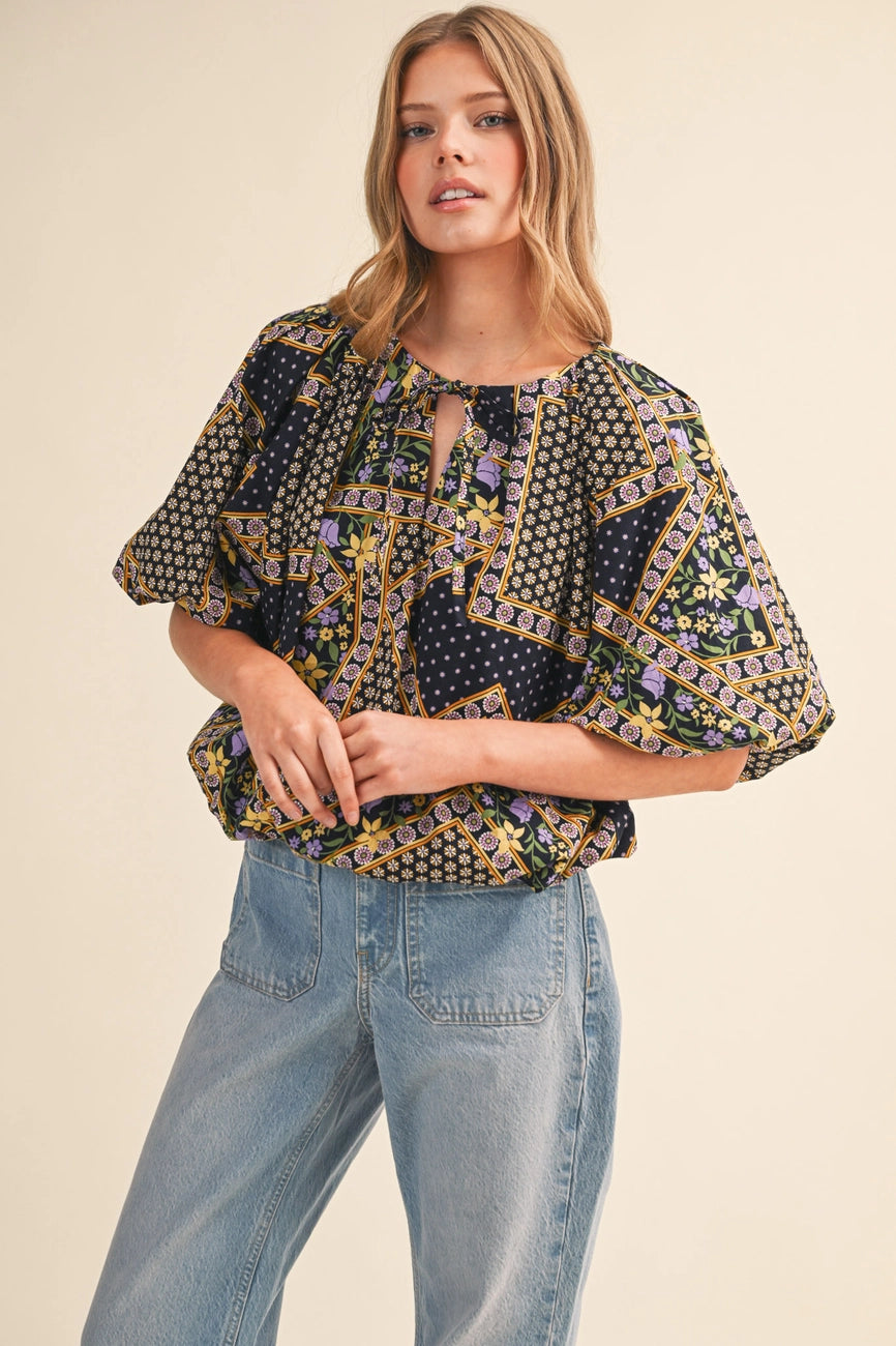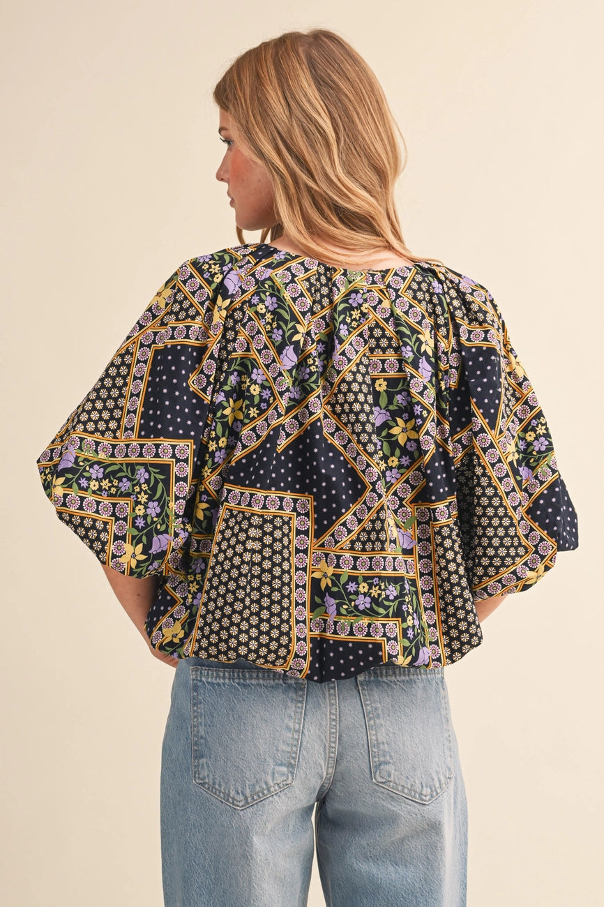 A navy blue top with a purple, yellow and green floral patchwork print.  This top has a little tie neck and elbow length bubble sleeves and a bubble hem. The fit is cropped and oversized.